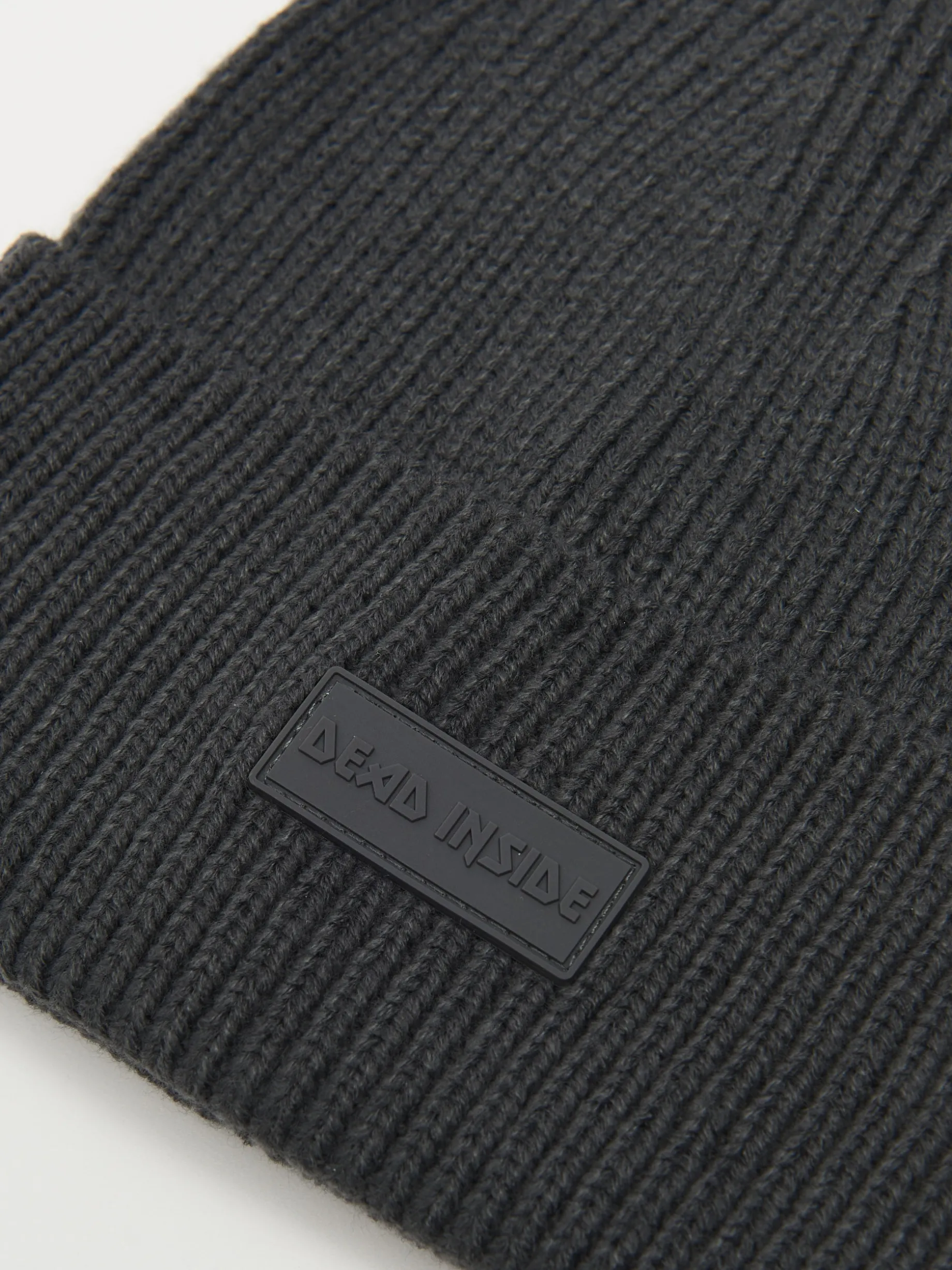 Damska czapka beanie, uszyta z szarej dzianiny. Z przodu gumowa naszywka.