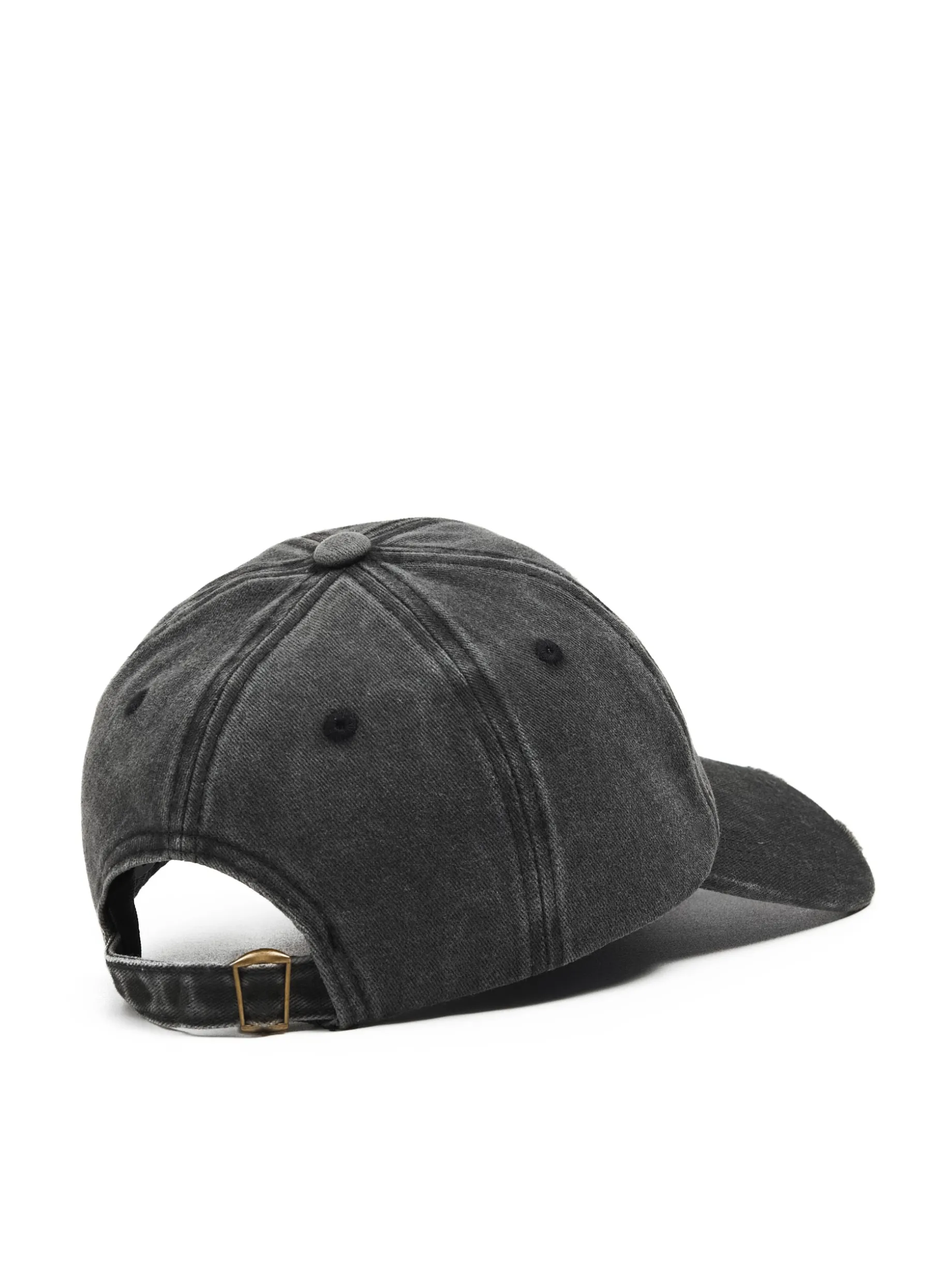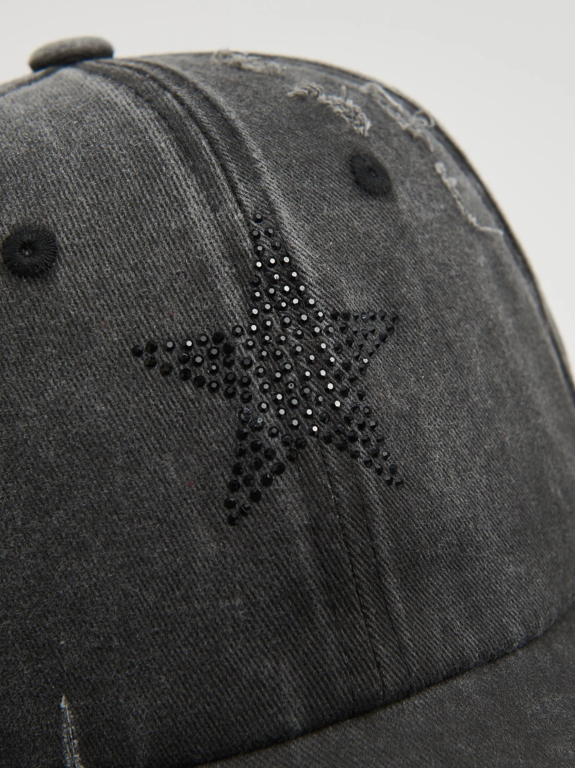 Damska czapka z daszkiem uszyta z dzianiny z efektem sprania, przetarciami i ozdobną aplikacja z przodu. Idealna na letnie, ciepłe dni! wykonana z łączonych materiałów dół z regulacją obwodu efekt sprania na całości delikatne postrzępienia i przetarcia z przodu aplikacja