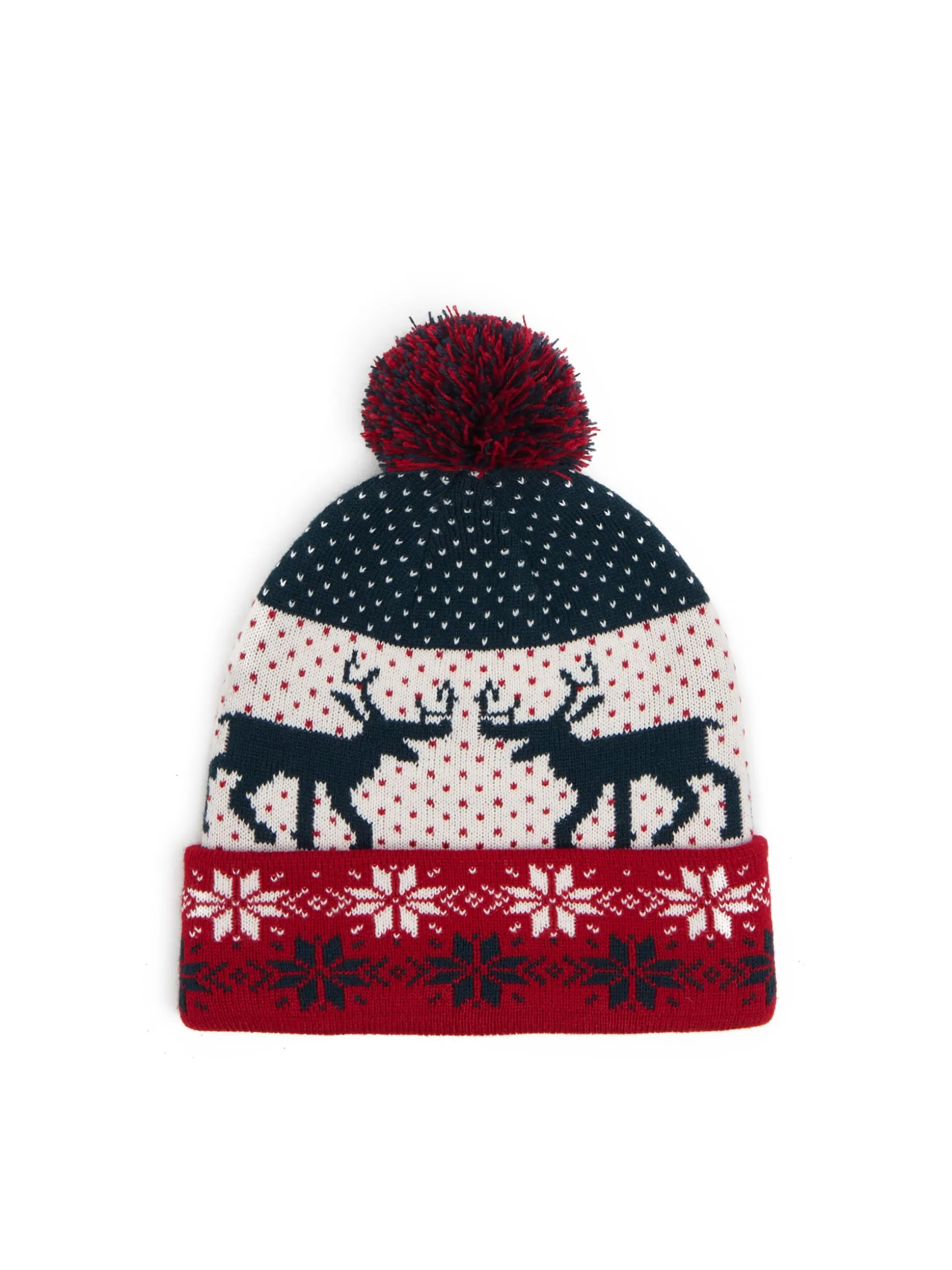 Łap męską czapkę typu beanie, uszytą z przyjemnej w dotyku dzianiny. Na całości zimowy wzór ze skandynawskim motywem. A jak czapka na zimę, to tylko z pomponem! przyjemny w dotyku materiał prosty krój ozdobny pompon nadruk all over