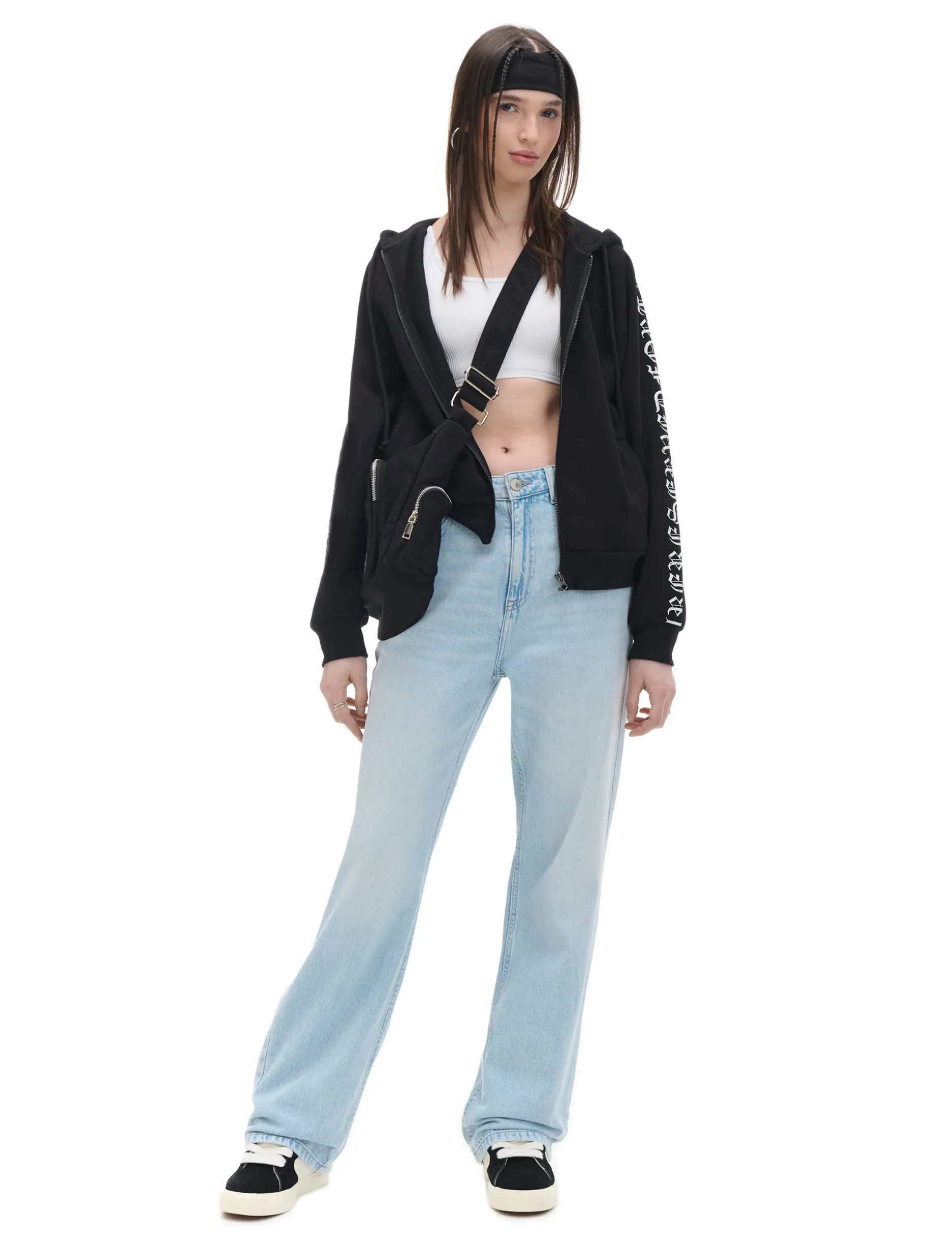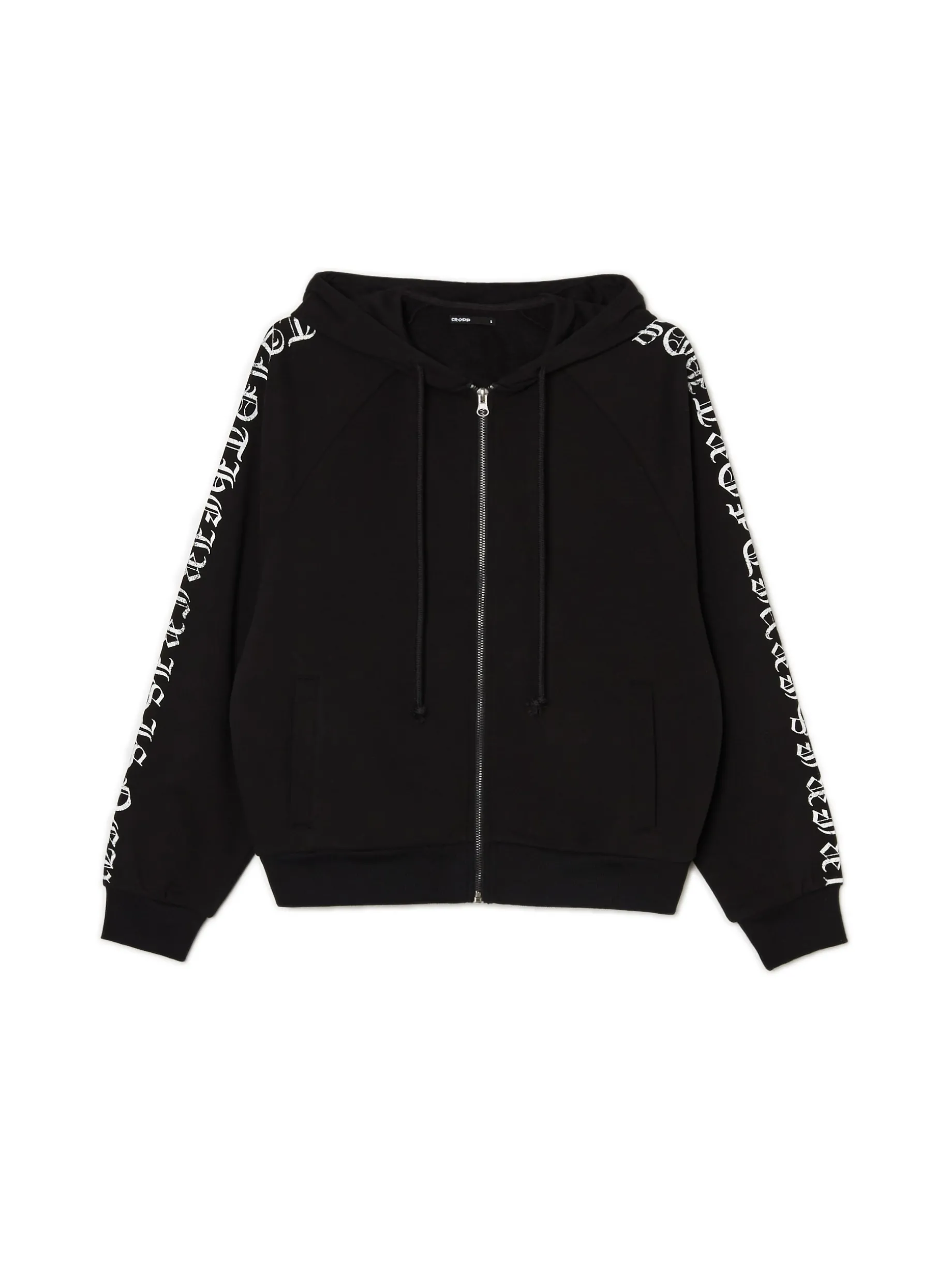 Czarna damska bluza z kapturem typu hoodie. Skrzydła na plecach i ozdobne lampasy na rękawach kuszą swoją oryginalnością. uszyta z materiału o dużej zawartości bawełny regularny, prosty krój duży kaptur typu hoodie długie rękawy ze ściągaczami przy mankietach zapięcie na zamek Modelka prezentuje produkt w rozmiarze S/36. Wzrost modelki: 175 cm