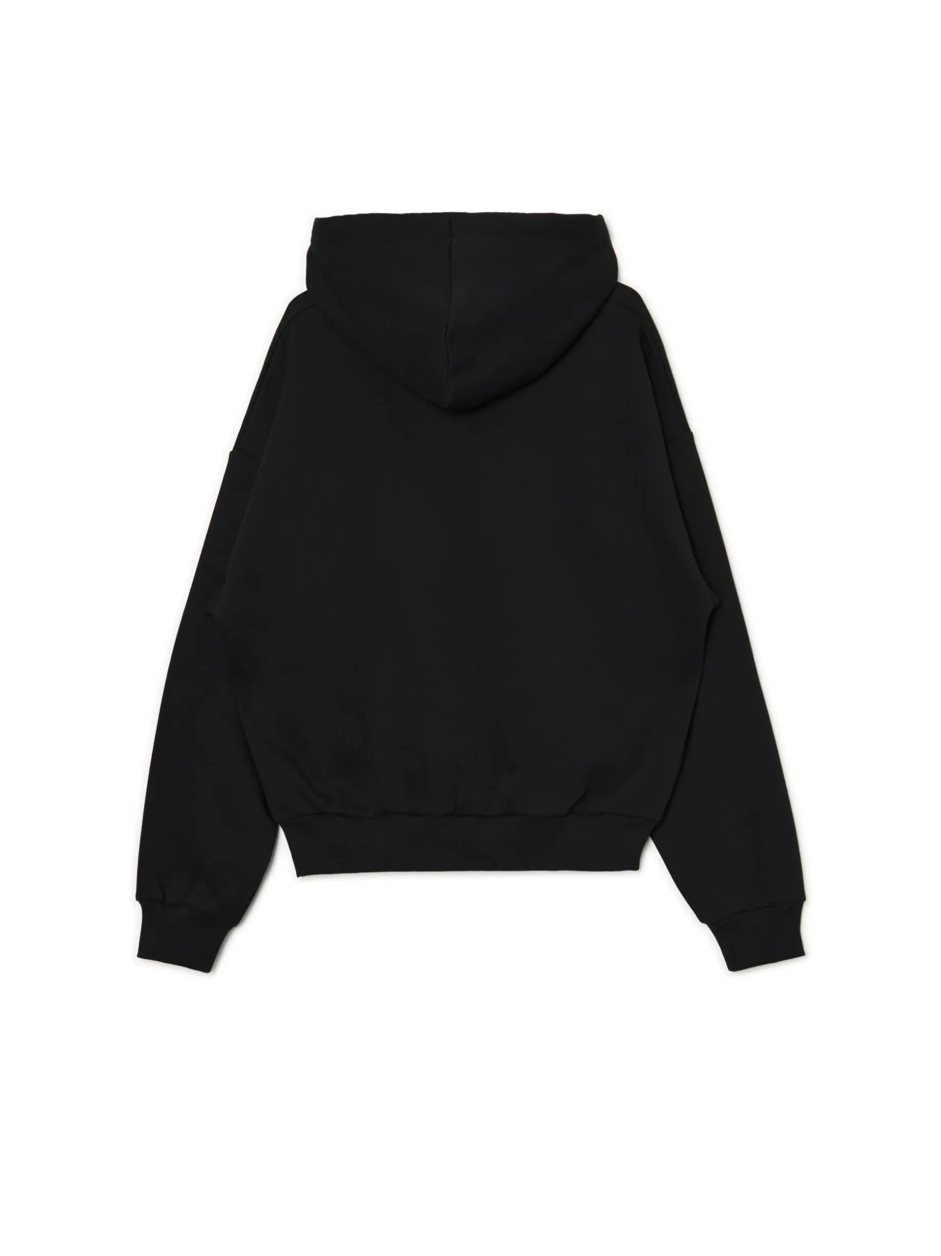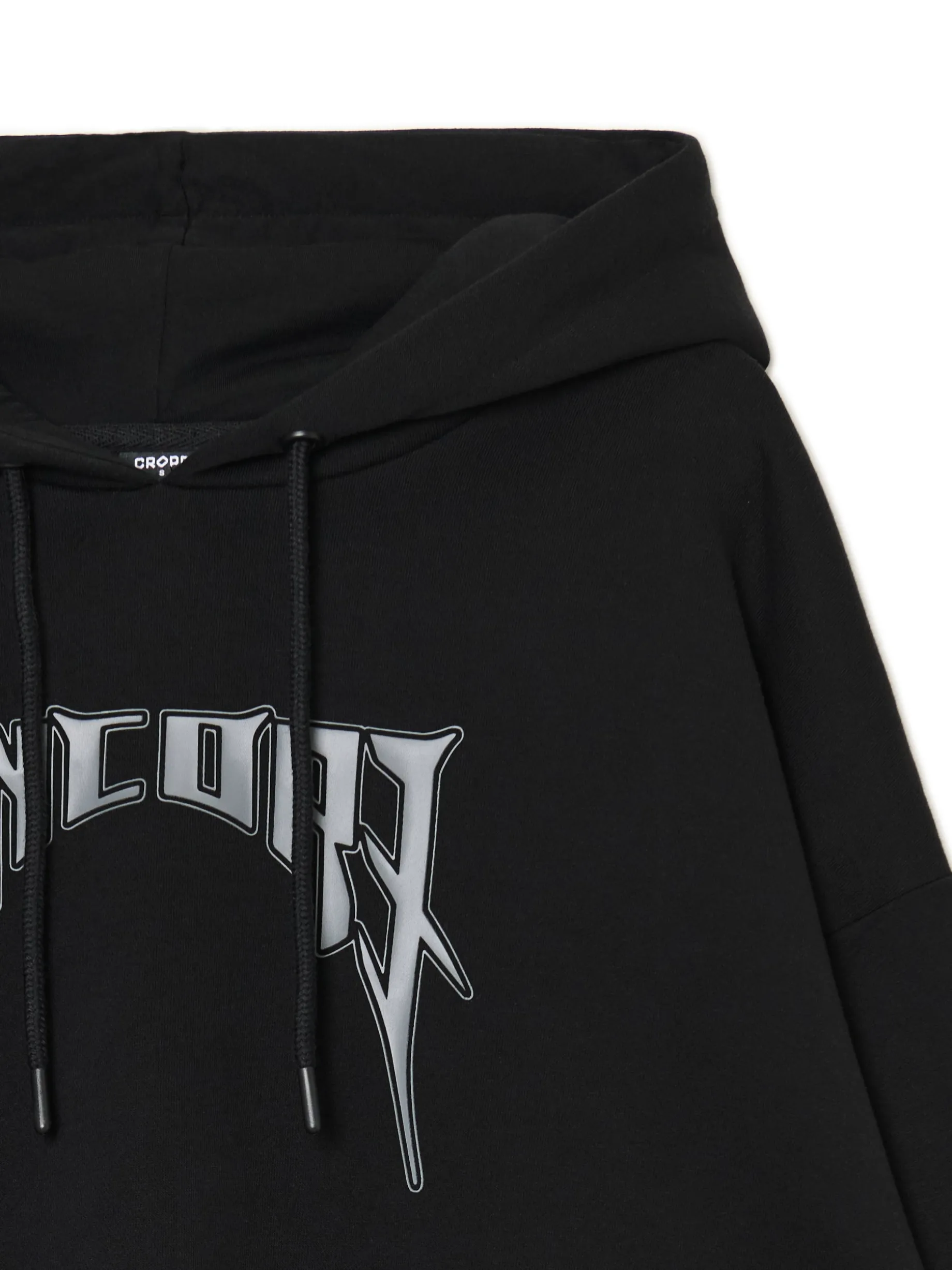 Damska dresowa bluza w kolorze czarnym, uszyta z dzianiny zawierającej bawełnę. obszerny krój boxy kaptur regulowany sznurkiem rękawy i dół ze ściągaczem z przodu duży nadruk tekstowy Ten produkt należy do kolekcji UNISEX – zalecamy wybranie mniejszego rozmiaru niż zazwyczaj, jeśli chcesz uniknąć efektu oversize.