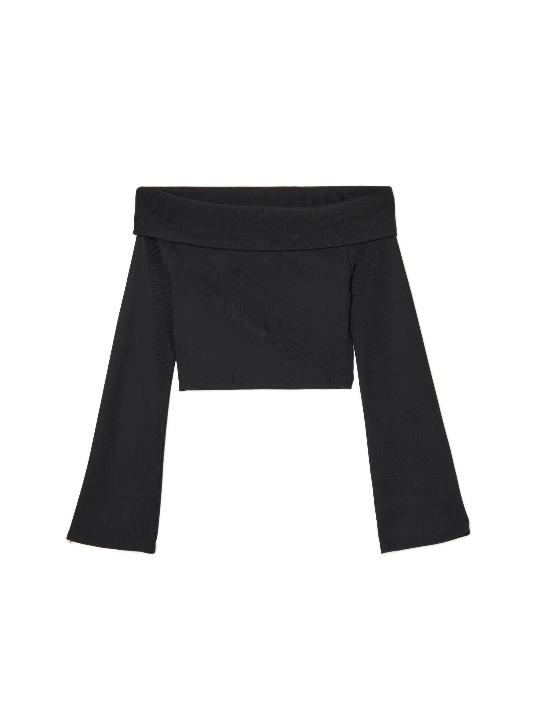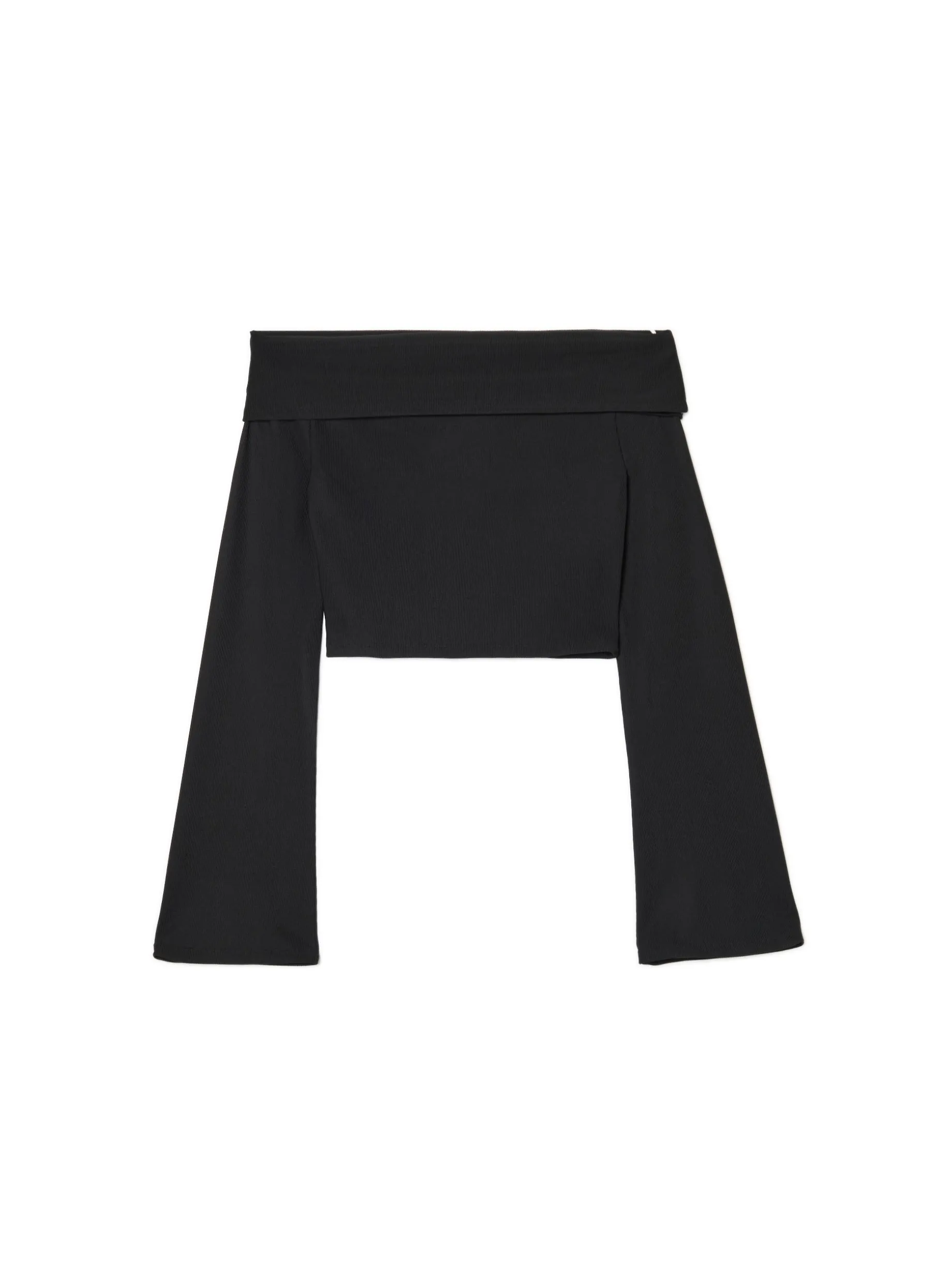 Damska bluza typu carmen uszyta z mieszanki dzianin z elastycznym wykończeniem. Dopasowany krój, długie rękawy rozszerzane ku dołowi i odkryte ramiona. Dobierz do niej luźne spodnie i na miasto! dzianina z dodatkiem elastycznych włókien dopasowany, krótki krój dekolt carmen ozdobna zakładka długie rękawy opadające ramiona