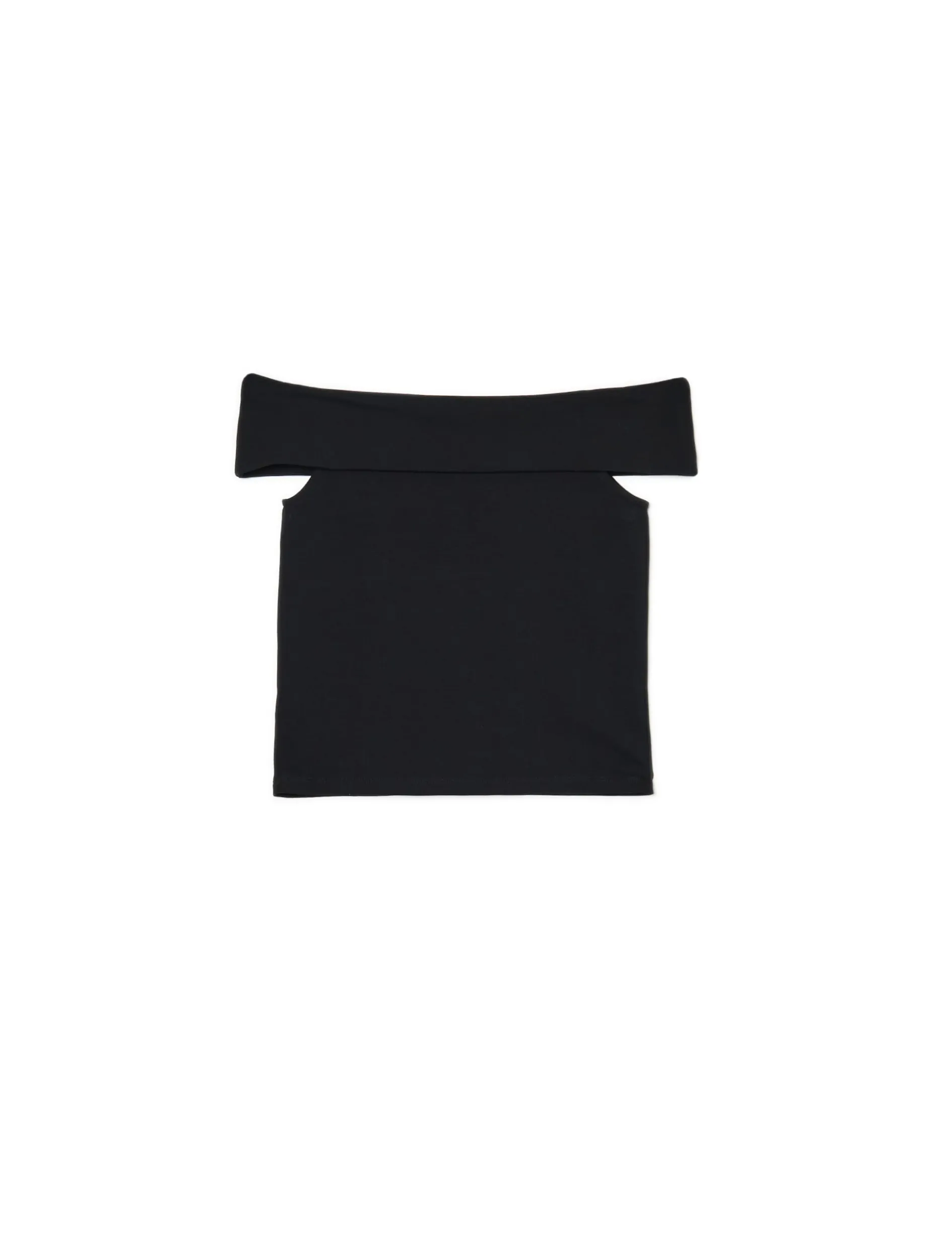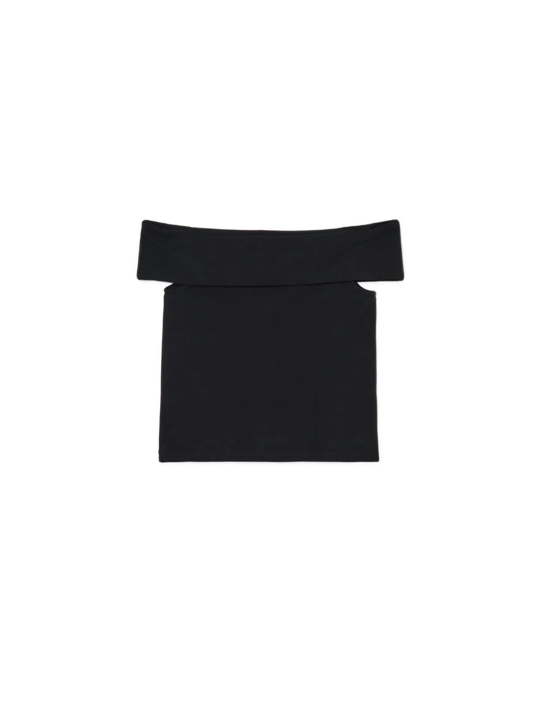 Damska bluzka, uszyta z czarnego materiału o bardzo wysokiej zawartości bawełny. Dodatek elastycznych włókien gwarantuje idealne dopasowanie i wygodę! dopasowany krój podkreślający sylwetkę odsłaniający ramiona dekolt typu carmen krótkie rękawki, powstające dzięki zawinięciu dekoltu