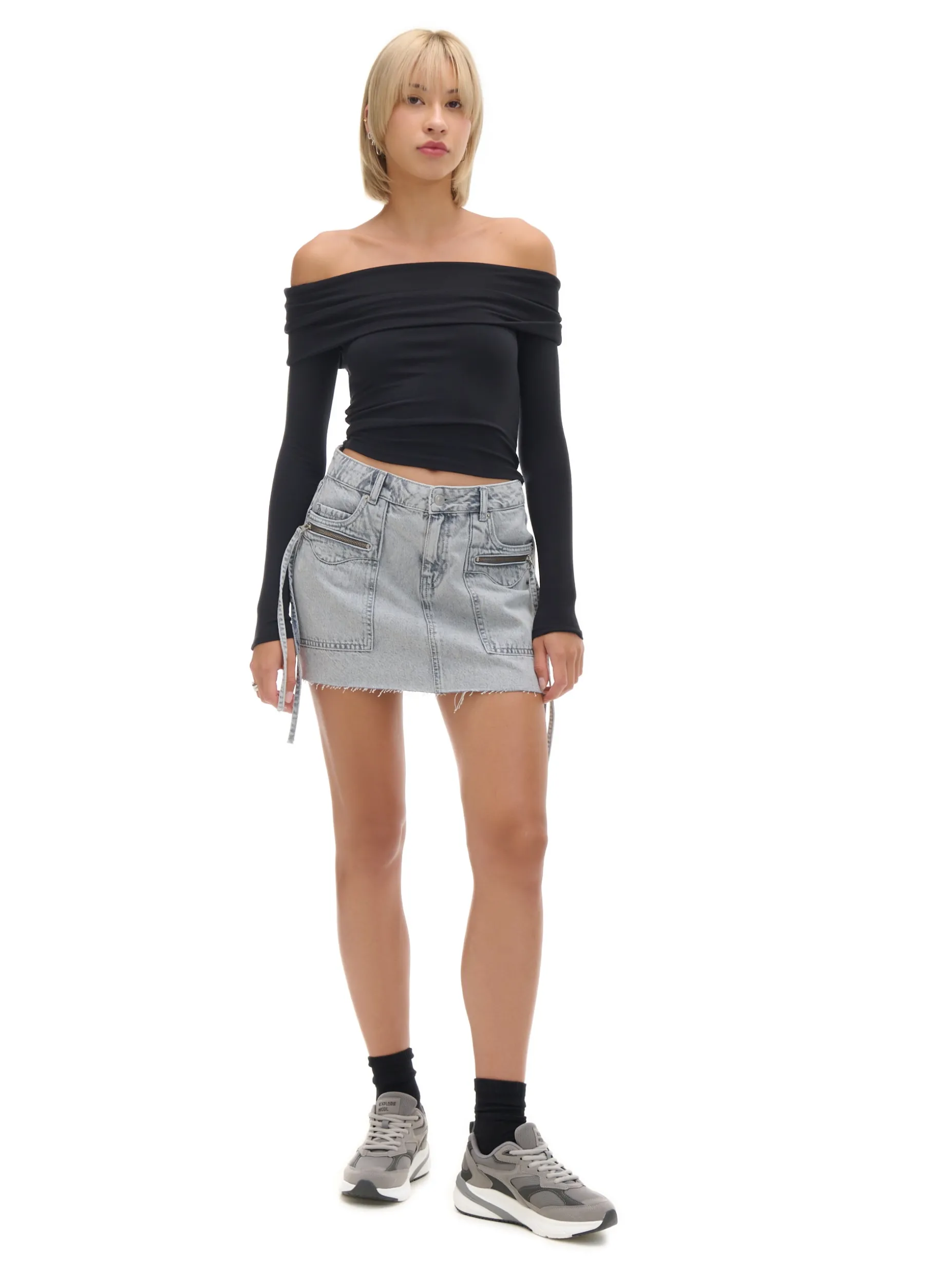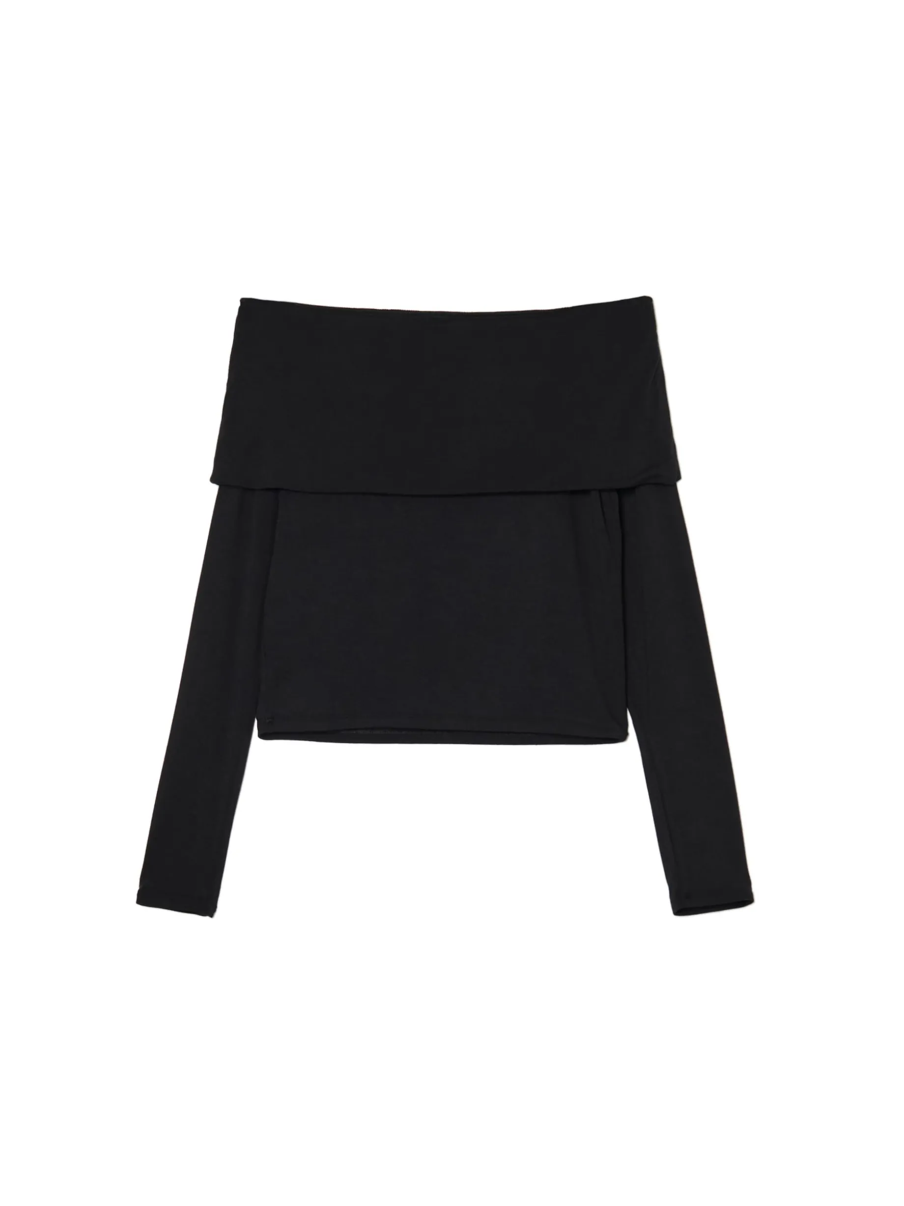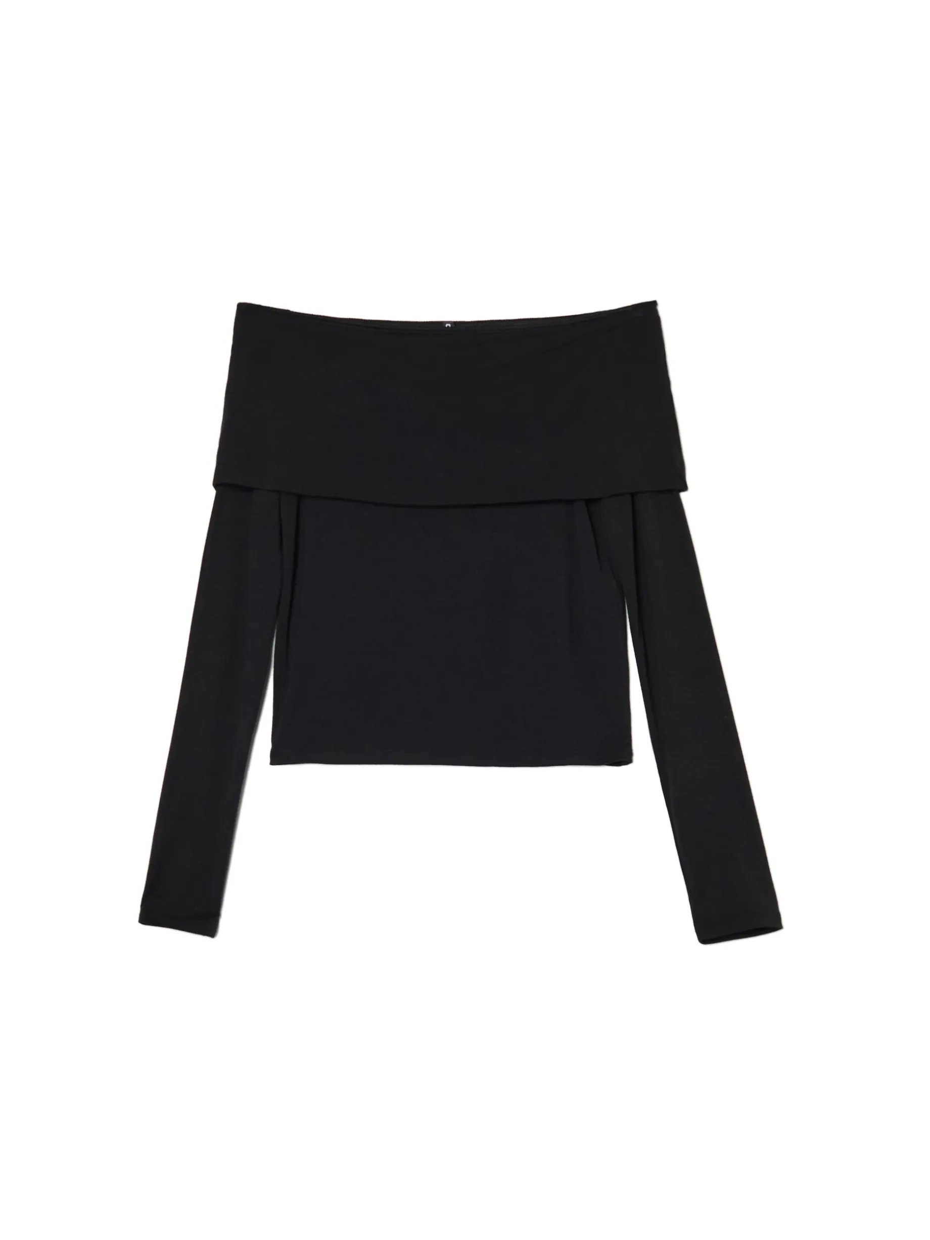 Czarna damska bluzka, uszyta z dzianiny o bardzo wysokiej zawartości bawełny. Domieszka elastanu gwarantuje idealnie dopasowanie do Twojej figury! dopasowany krój, podkreślający sylwetkę długie rękawy zakładka tworząca hiszpański dekolt, odsłaniający ramiona Wzrost modelki: 177 cm