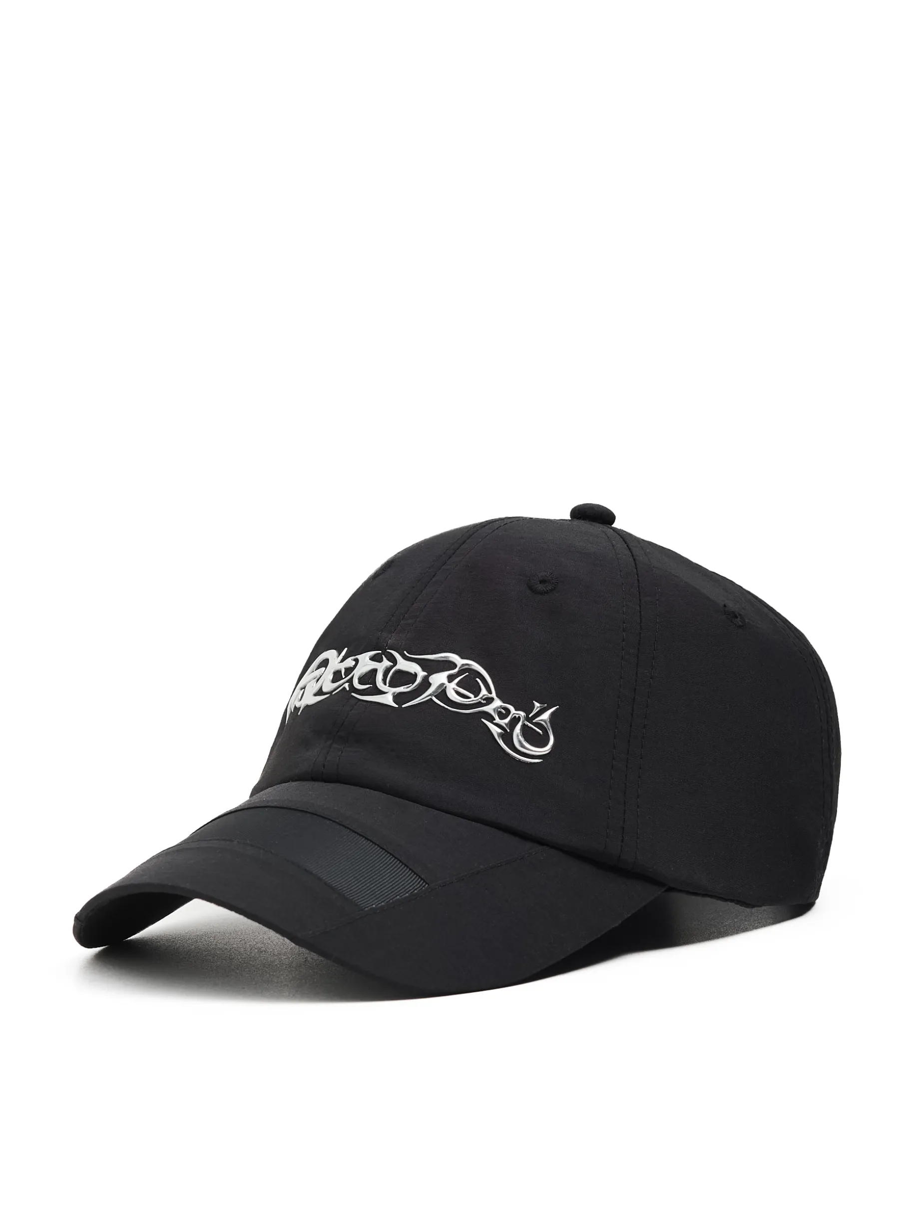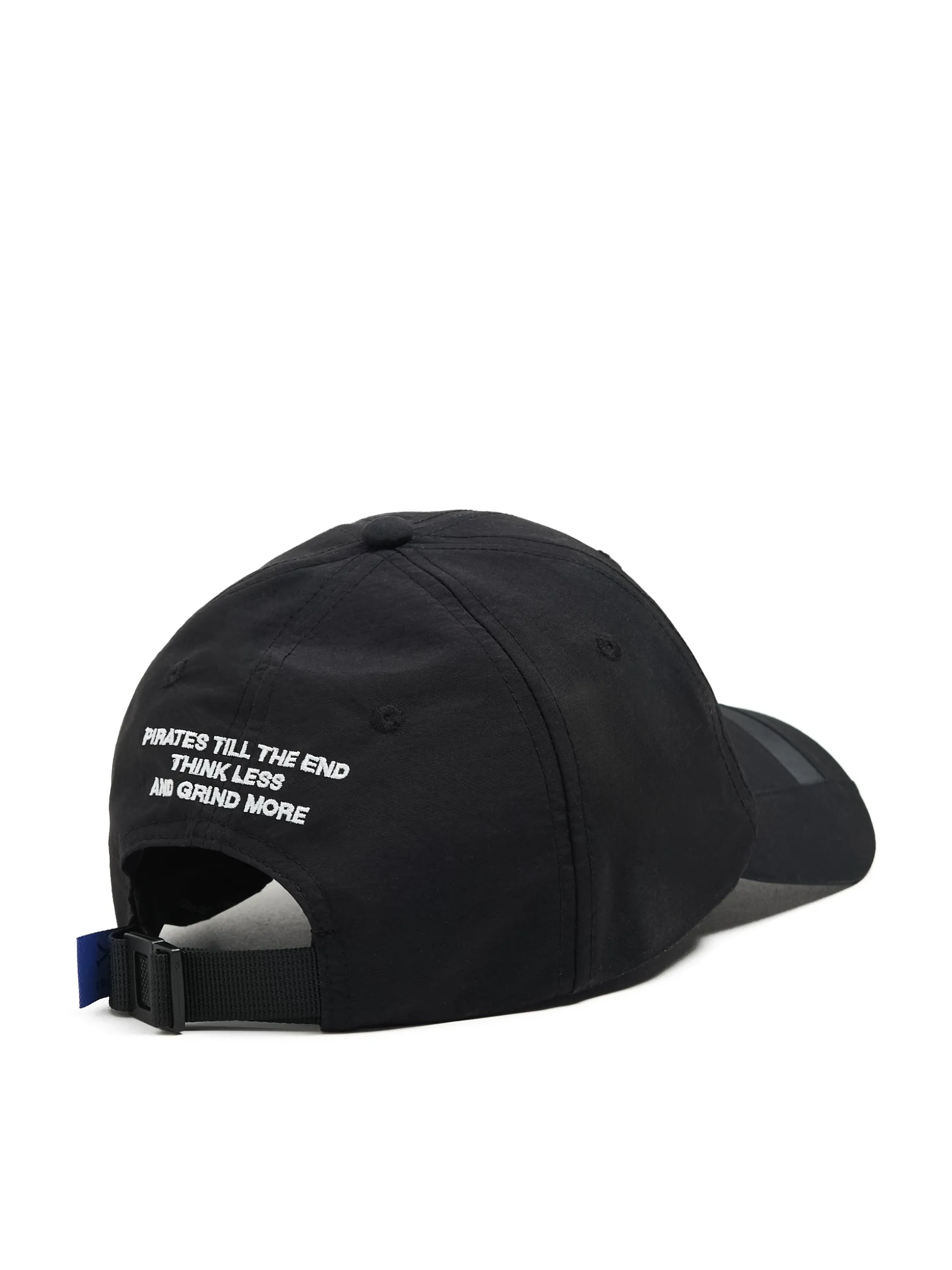 Męska czapka typu bejsbolówka, uszyta z czarnej tkaniny. Będzie idealnie pasować do Twojego outfitu na Baltic Games! profilowany daszek możliwość regulacji obwodu dzięki paskowi z klamrą z przodu błyszcząca aplikacja w stylu Y2K z tyłu haft ze sloganem „PIRATES TILL THE END THINK LESS AND GRIND MORE”