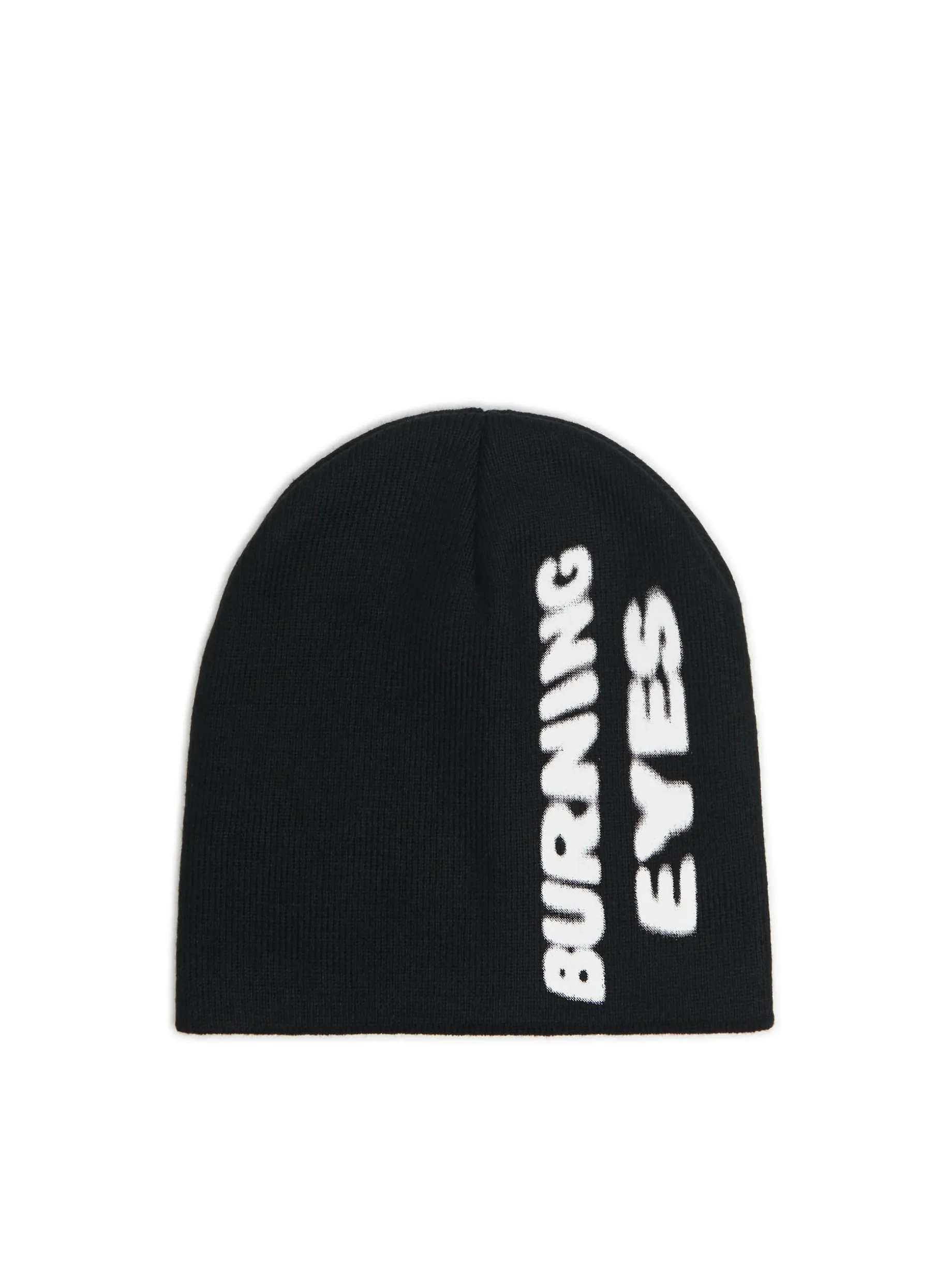 Gładka czarna czapka z dzianiny, idealna na zimę. Z przodu nadruk z napisem „BURNING EYES”.