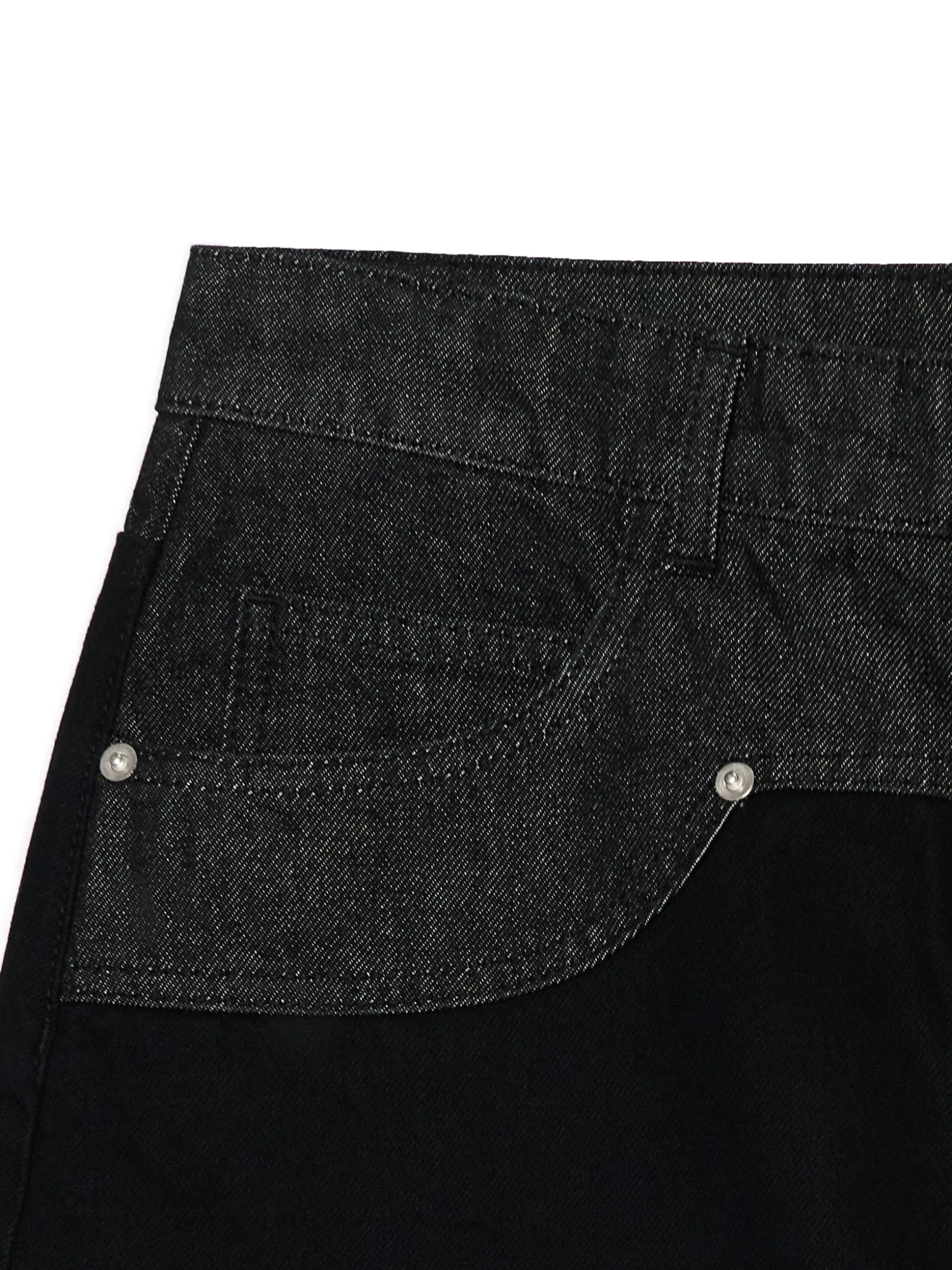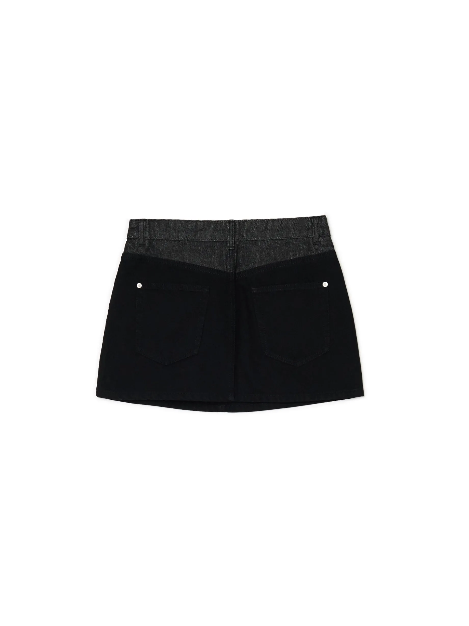 Damska spódnica o długości mini uszyta z czarnej denimowej tkaniny. Ozdobą tego modelu jest dwukolorowy materiał i metalowe dźety po obu stronach. Nowoczesny design w klasycznym wydaniu. 100% bawełny długość mini zapięcie na zamek i guzik otwarte kieszenie po bokach dwie naszyte kieszenie tylnie jedna mała kieszeń na drobniaki szlufki na pasek metalowe detale Wzrost modelki: 177 cm