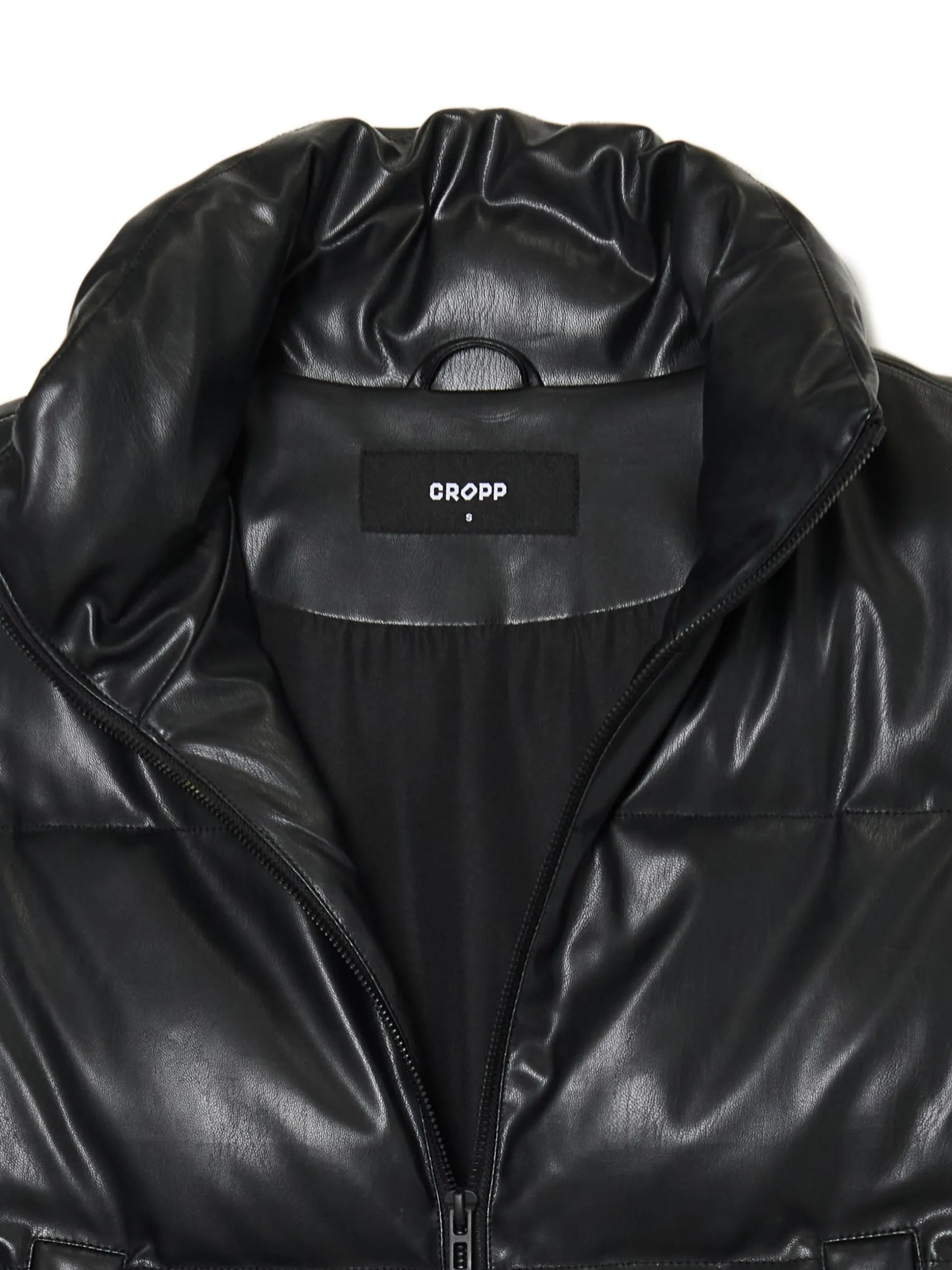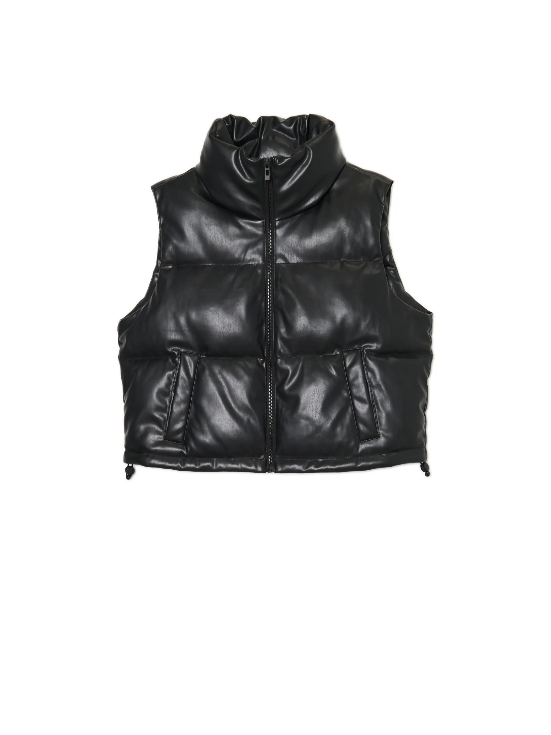 Damska pikowana kamizelka typu puffer o krótszym kroju, uszyta z imitacji skóry. Idealna na sezon przejściowy, dzięki delikatnemu wypełnieniu. kamizelka o krótszym kroju pikowanie na całości wewnątrz wykończenie na podszewce syntetyczne wypełnienie zapięcie na zamek na całej długości wysoka stójka bez rękawów dwie kieszenie po bokach regulacja dołu za pomocą gumek ze stoperami