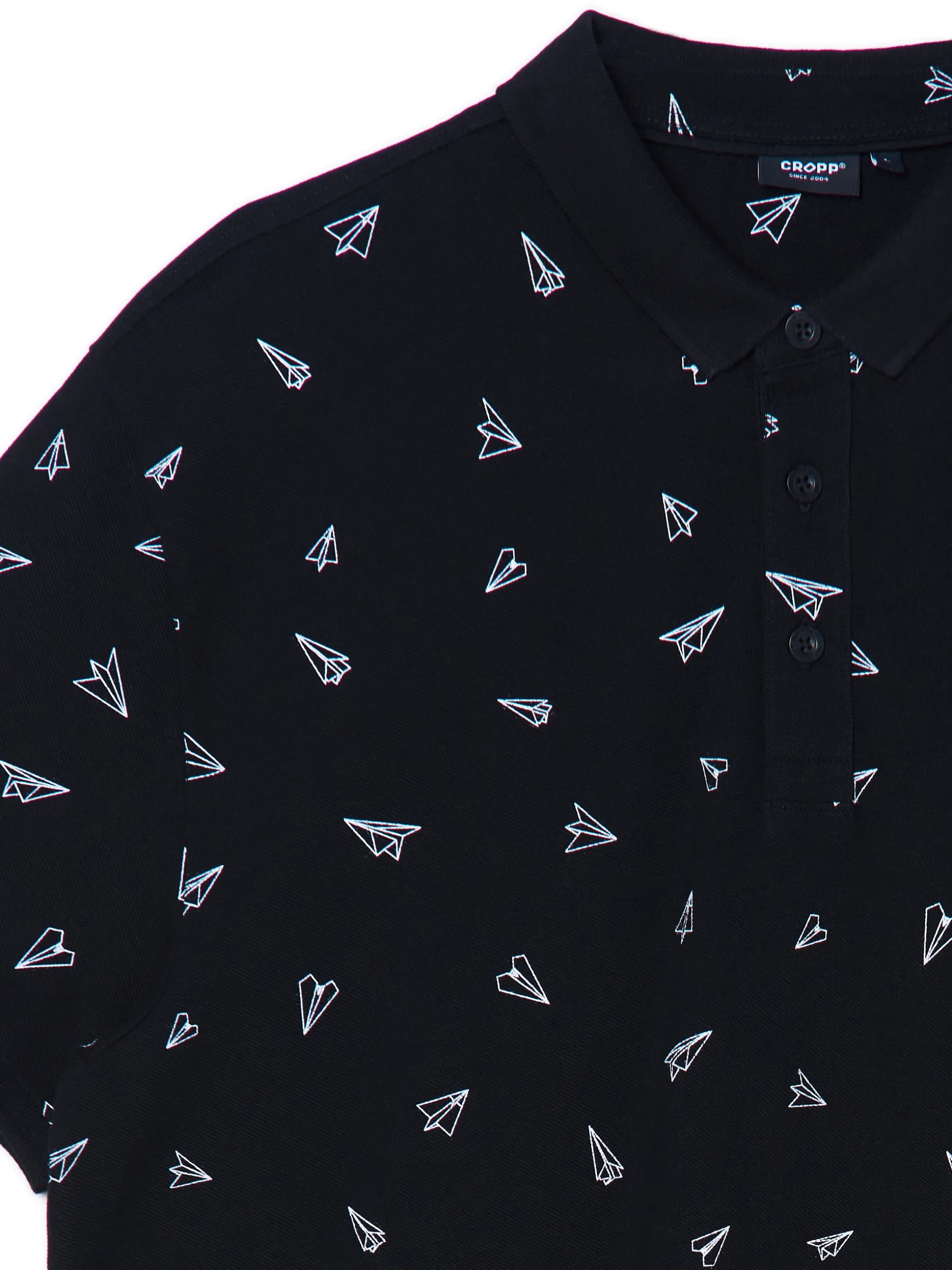 Czarna męska koszulka polo, uszyta w 100% z bawełny. krój regular krótkie rękawy kołnierzyk polo nadruk z motywem papierowych samolotów all over