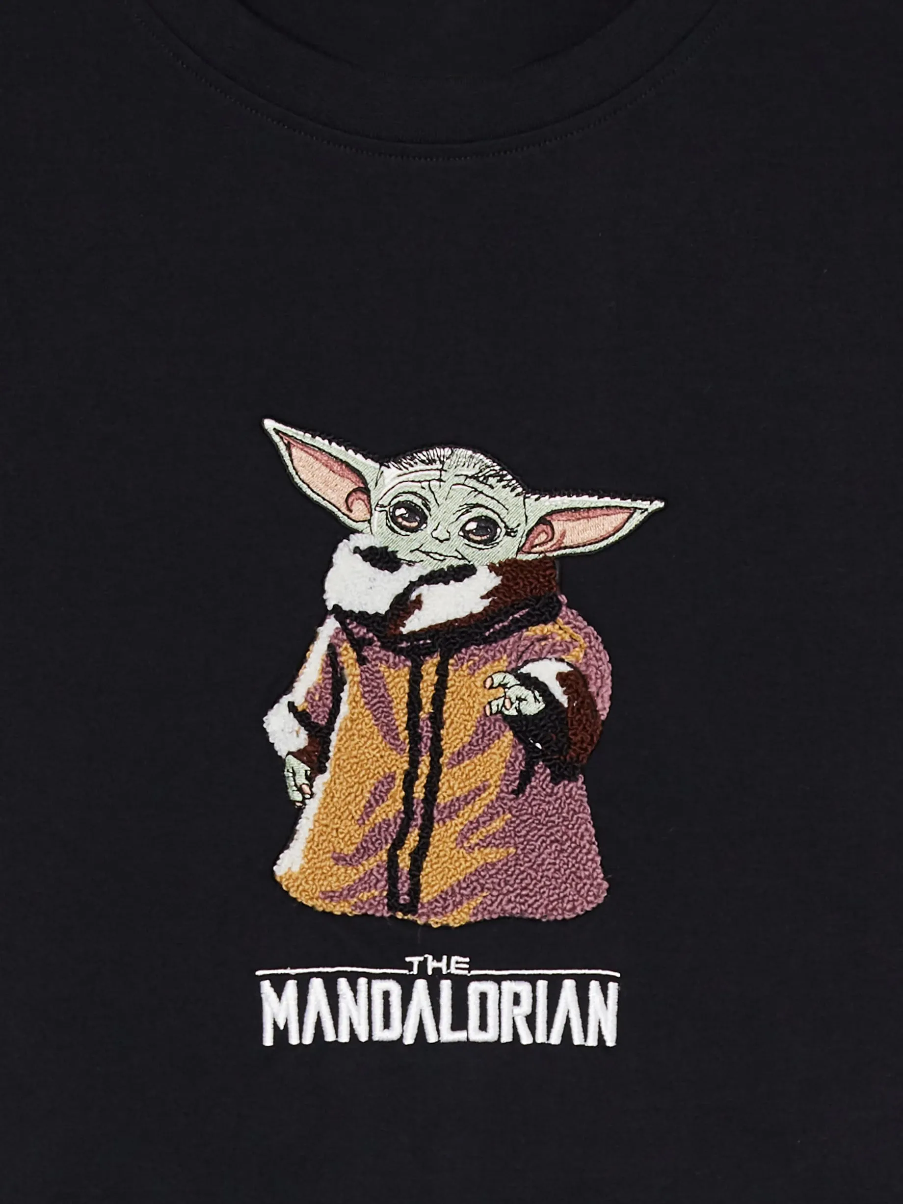 Czarna koszulka męska, uszyta w 100% z bawełny. Idealna dla fanów serialu The Mandalorian! regularny krój krótkie rękawy z przodu haft i aplikacja z motywem Baby Yody STAR WARS © & TM Lucasfilm Ltd.