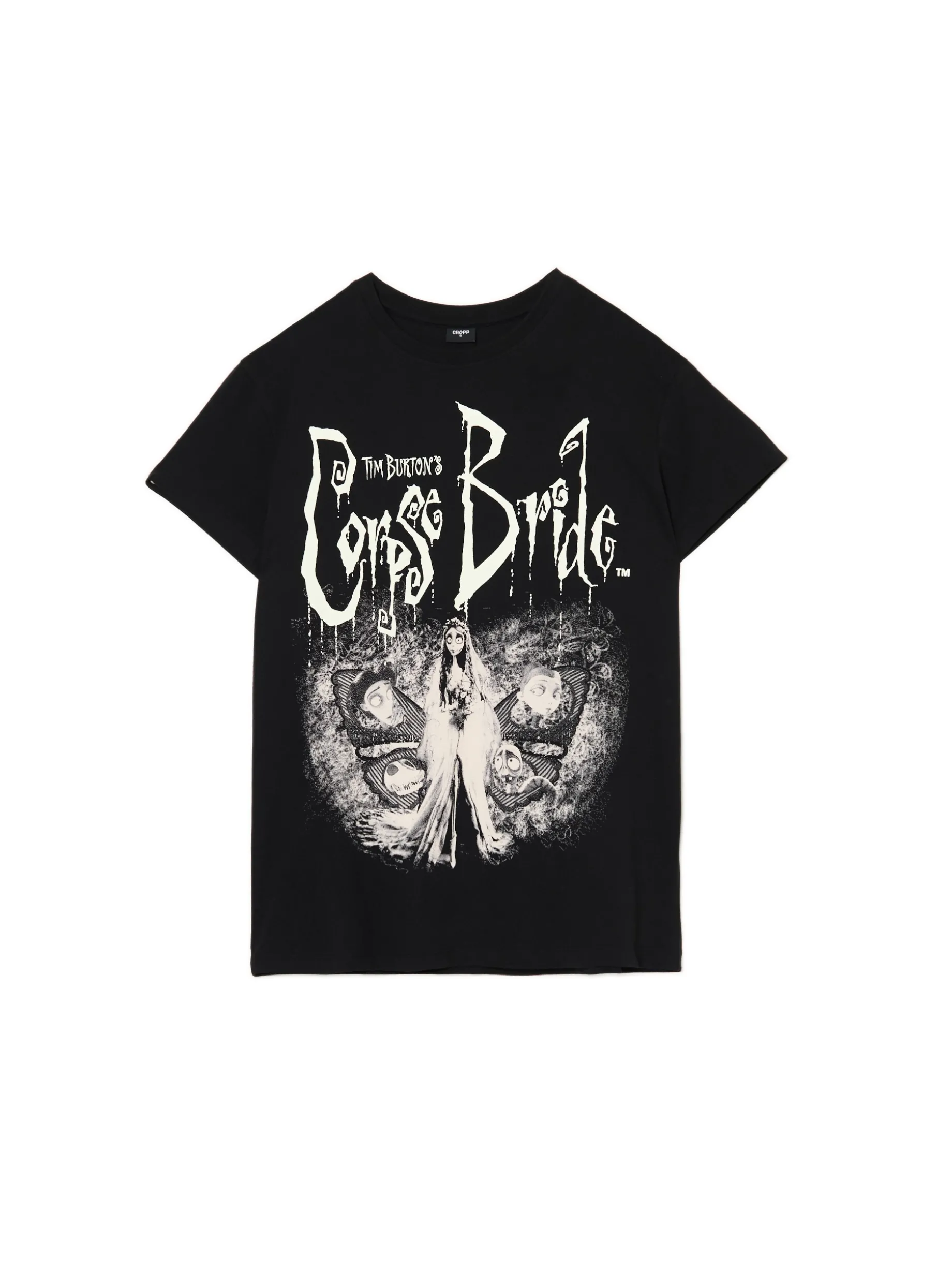 Item na hallowenowy wieczór i nie tylko. Damski T-shirt uszyty z bawełnianej dzianiny w czarnym kolorze. Na przodzie licencjonowany nadruk z bohaterii filmu Tima Burtona „Gnijąca Panna Młoda”. Hop siup i do koszyka! 100% bawełny krój oversize okrągły dekolt krótkie, swobodne rękawy nadruk z motywem Halloween Wzrost modelki: 172 cm CORPSE BRIDE and all related characters and elements © & TM Warner Bros Entertainment Inc. WB SHIELD: © & TM WBEI. (s24)