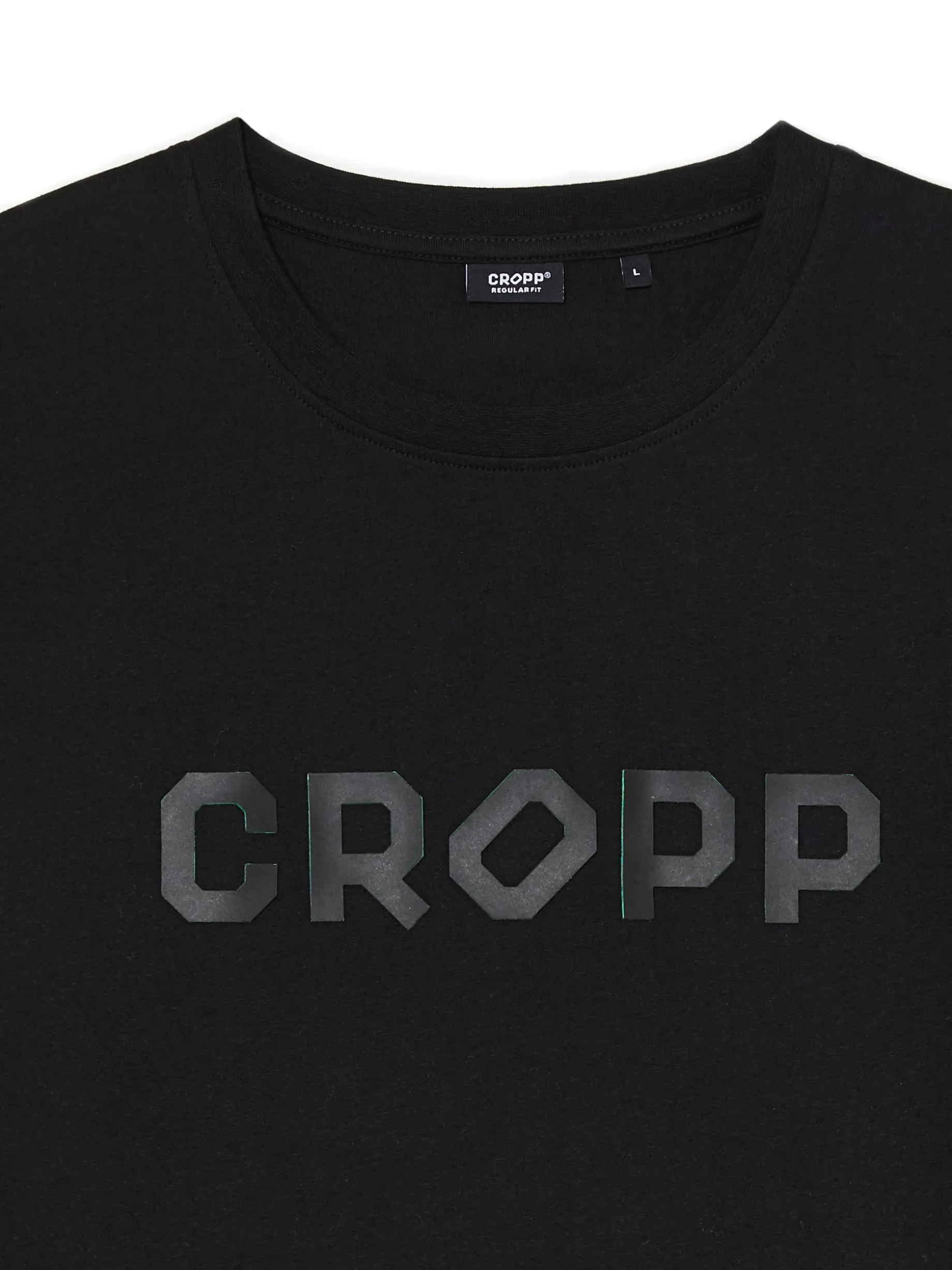 Czarna męska koszulka o kroju regular, uszyta z bawełny. Z przodu nadruk tekstowy CROPP. 100% bawełny regularny krój uniwersalny basicowy styl krótkie, swobodne rękawy Wzrost modela: 184 cm