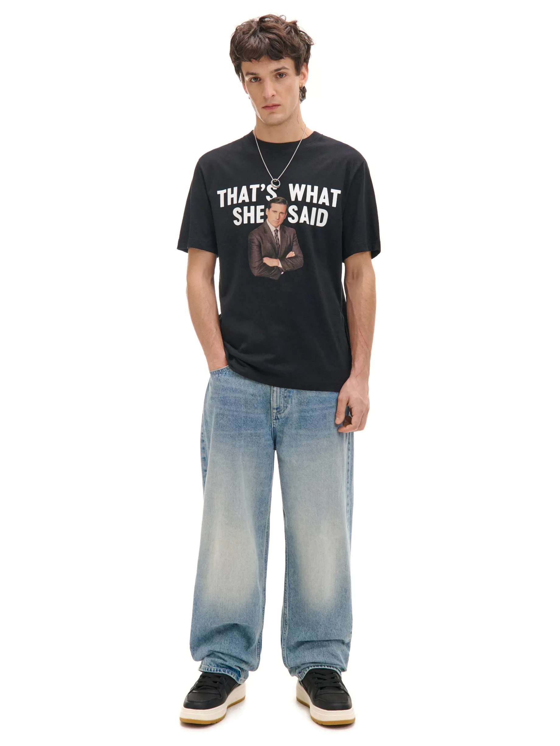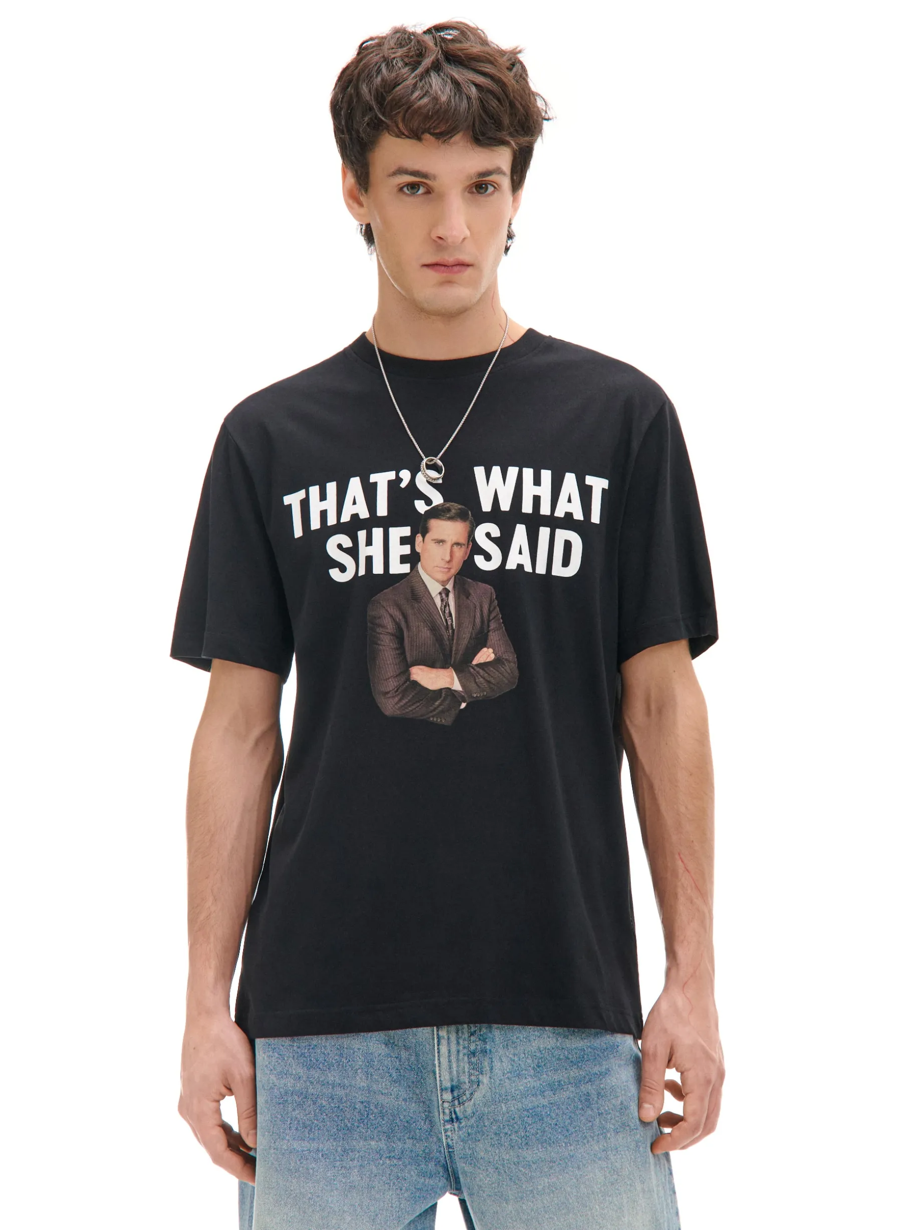 Męski czarny T-shirt, uszyty w 100% z bawełny. Idealna opcja dla fanów Michaela Scotta i całej ekipy z Dunder Mifflin w Scranton w Pensylwanii. regularny krój krótkie rękawy z przodu nadruk z serialu The Office i napisem THAT’S WHAT SHE SAID © THE OFFICE