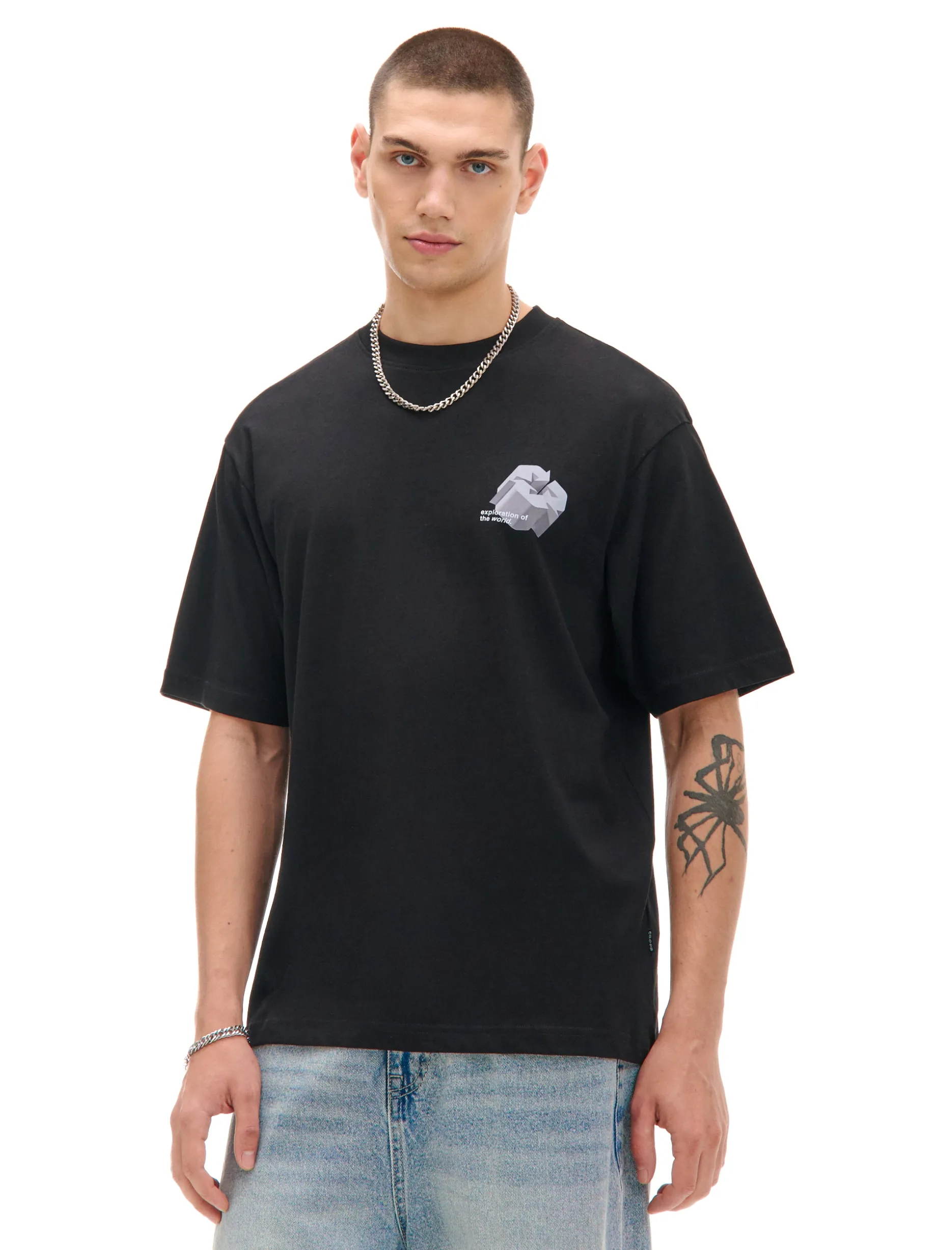 Czarna koszulka męska, uszyta w 100% z bawełny. krój comfort fit krótkie rękawy minimalistyczny nadruk i napis z przodu