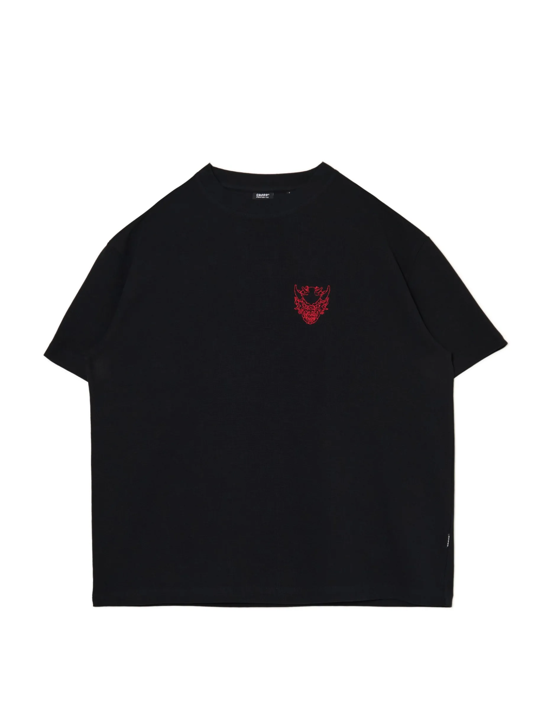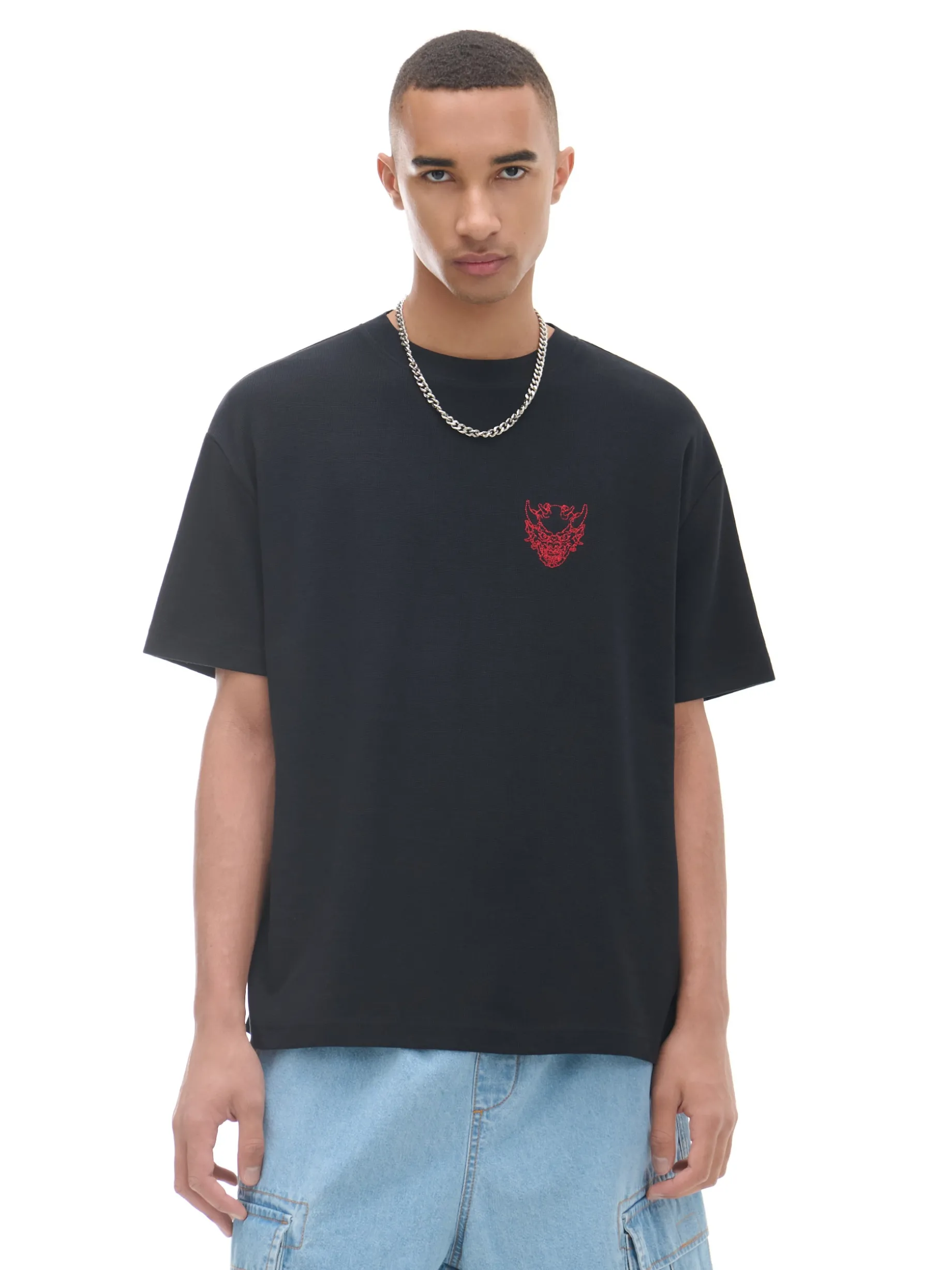 Męska koszulka z krótkim rękawem, uszyta z bawełny. Na przodzie drobna naszywka w oryginalnym kształcie. 100% bawełny swobodny, luźny krój półokrągły dekolt z lamówką krótkie rękawy z obniżoną linią ramion Wzrost modela: 185 cm