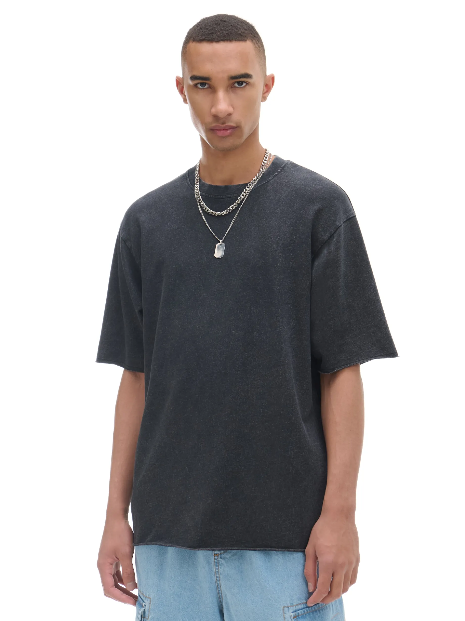 Męska koszulka uszyta z bawełnianej dzianiny french terry z efektem sprania i surowym wykończeniem brzegów. 100% bawełny luźny fason z obniżoną linią ramion krótkie, swobodne rękawy surowe wykończenie brzegów efekt sprania na całości Wzrost modela: 185 cm