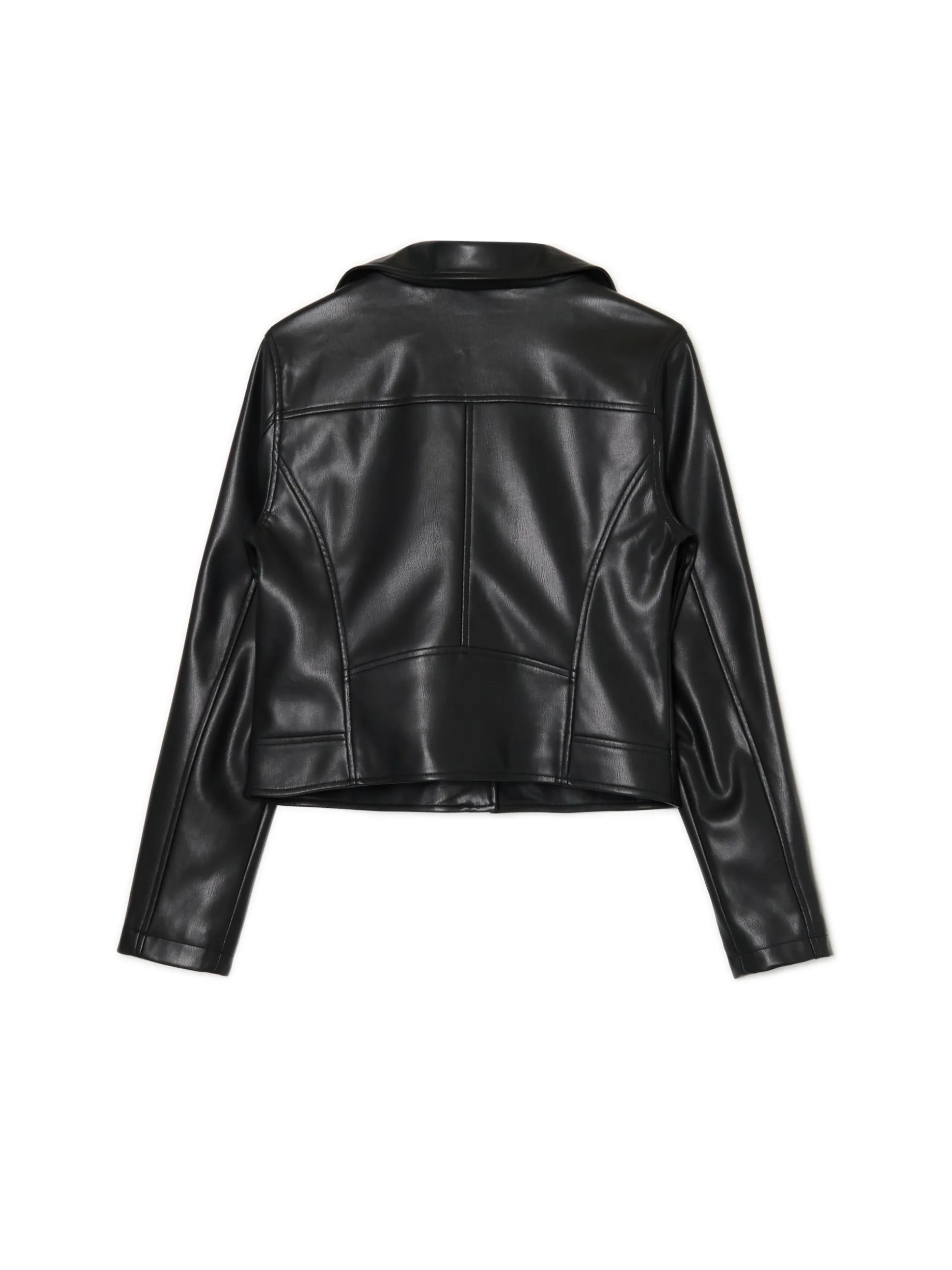 Damska kurtka typu biker, wykonana ze sztucznej skóry. Ten czarny klasyk będzie fitował z sukienkami, koszulkami i topami. kurtka typu biker z imitacji skóry zapinana na zamek na całej długości kołnierz z szerokimi klapami ozdobne napy i metalowe elementy trzy kieszenie z zapięciem na zamek