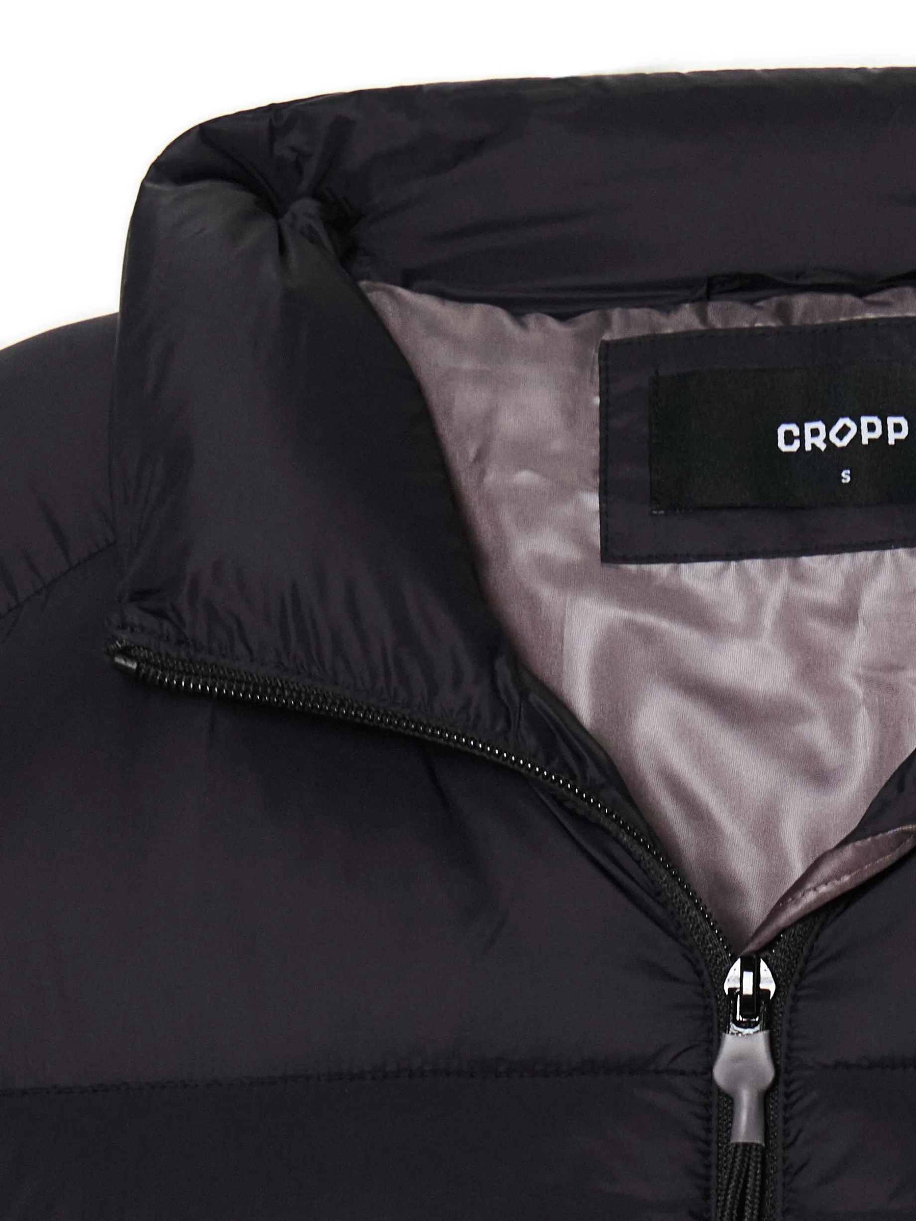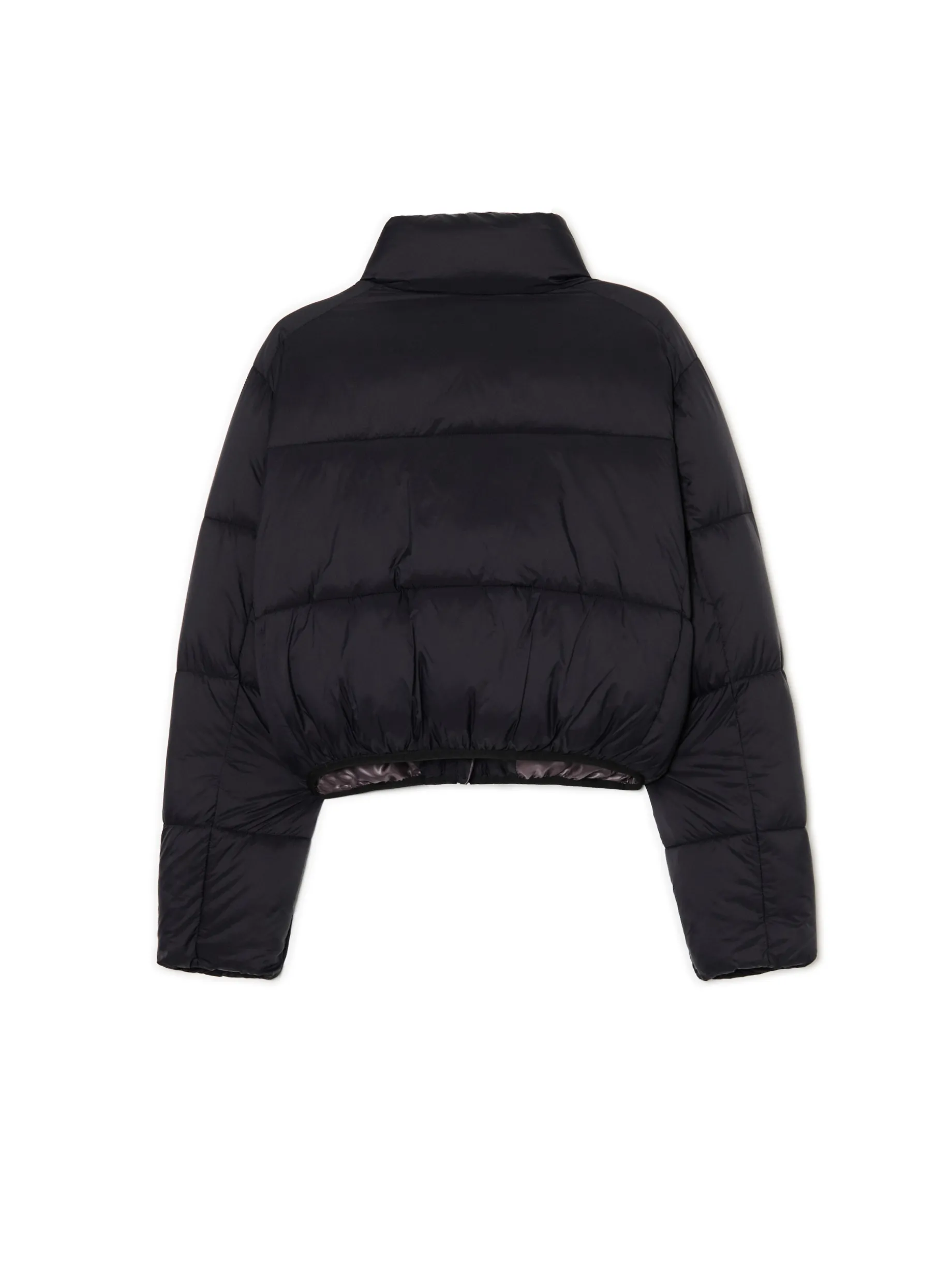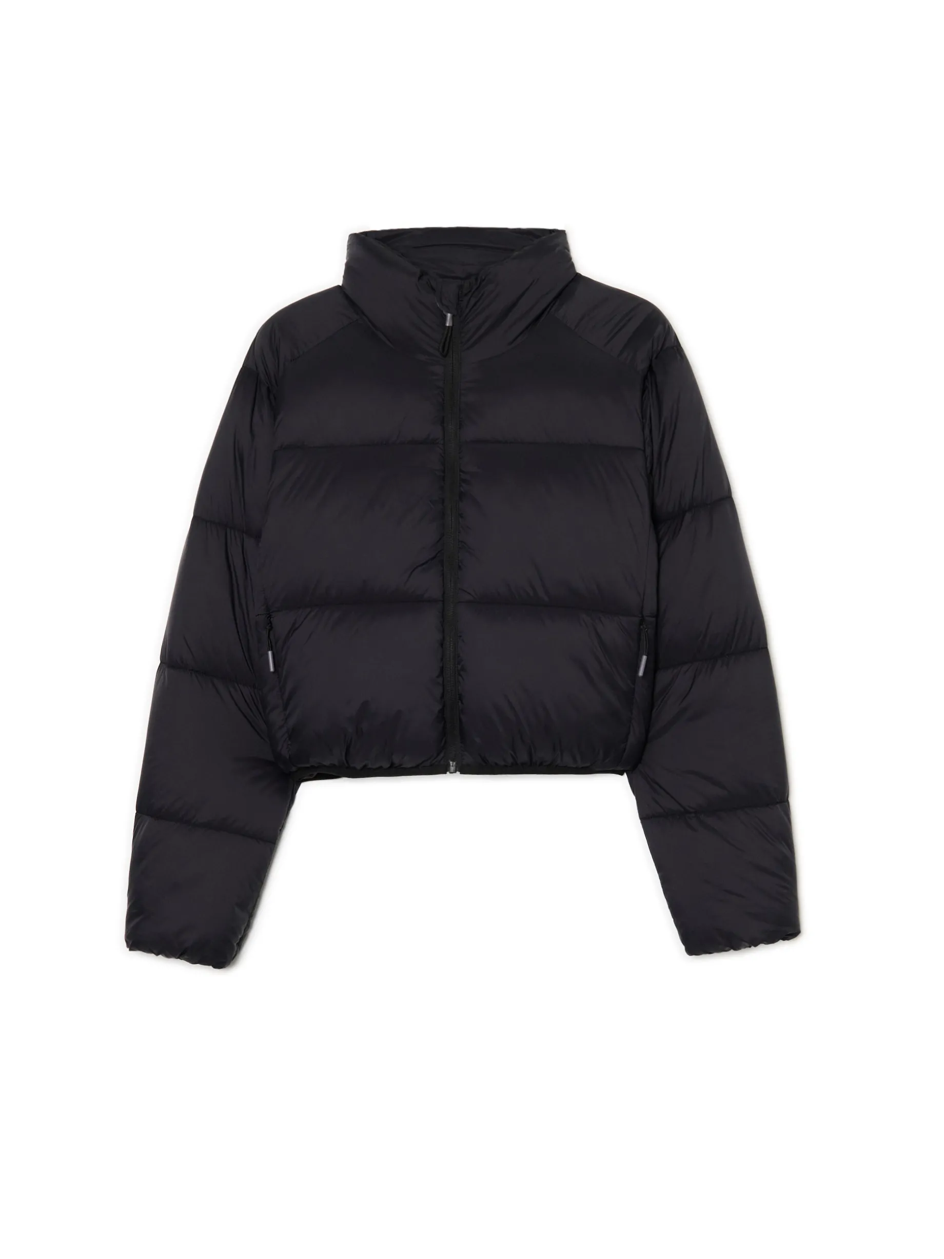 Pikowana damska kurtka typu puffer, uszyta z tkaniny w kolorze czarnym. Wewnątrz ocieplenie z recyklingowanego puchu syntetycznego. Ten outwear ogrzeje Cię w sezonie zimowym! basicowa kurtka typu puffer zapinana na zamek na całej długości wewnątrz wykończenie na podszewce ocieplenie wysoki kołnierz szerokie rękawy zakończone gumką kieszenie boczne z zamkami zapięcia z wygodnymi pullerami