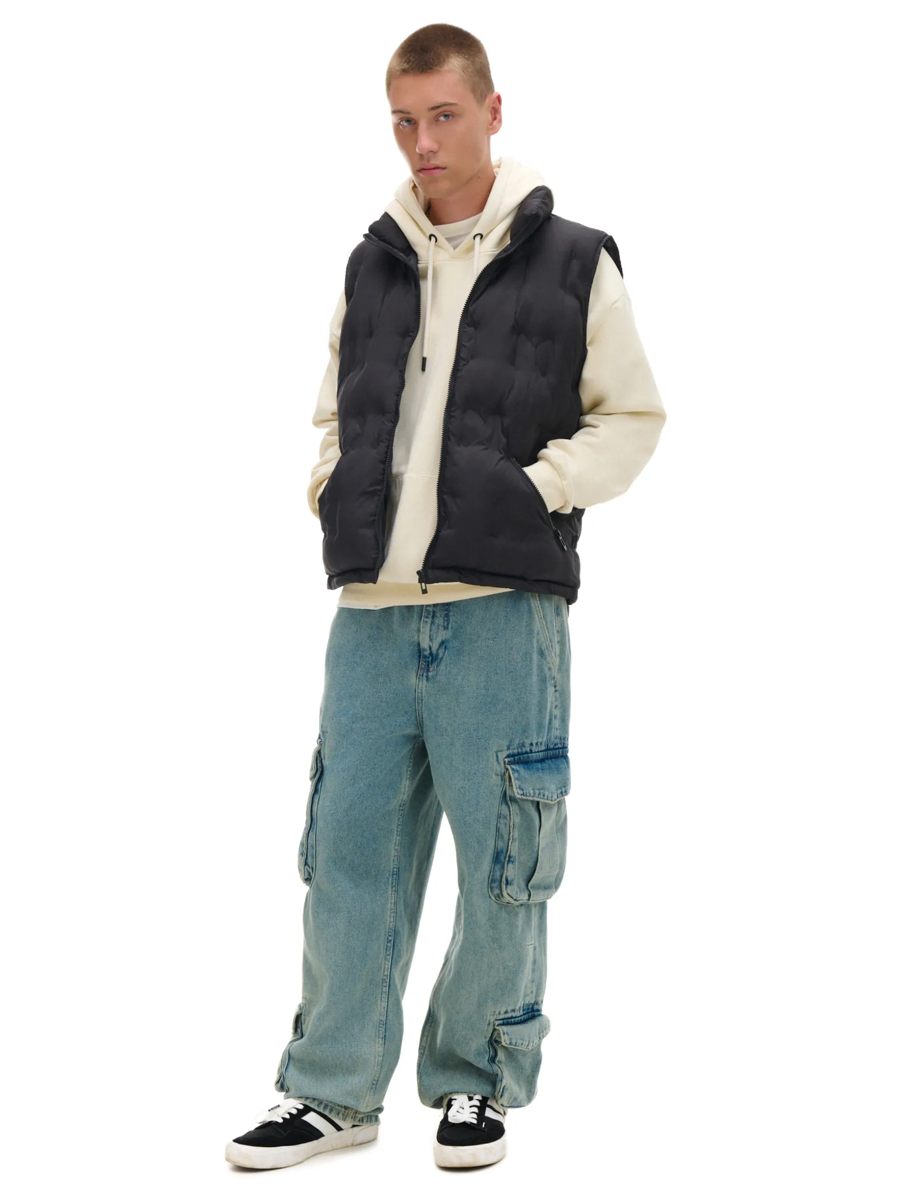 Czarna męska kamizelka uszyta z pikowanej tkaniny w unikatowym wzorze. Wszyte gumki przy ramionach dopasowują materiał do sylwetki. Dzięki kieszeniom na zamek Twój portfel i komórka będą bezpieczne. ocieplana kamizelka z pikowanej tkaniny zapinana na zamek na całej długości wysoka stójka szerokie ramiączka elastyczne gumy przy ramionach kieszenie boczne z zamkami Wzrost modela: 185 cm PROTECTION LEVEL 2rn Kurtka uszyta z tkaniny z lekkim wypełnieniem, której właściwości zapewnią Ci ochronę przed wiatrem i deszczem. Doskonale sprawdzi się w sezonie przejściowym.