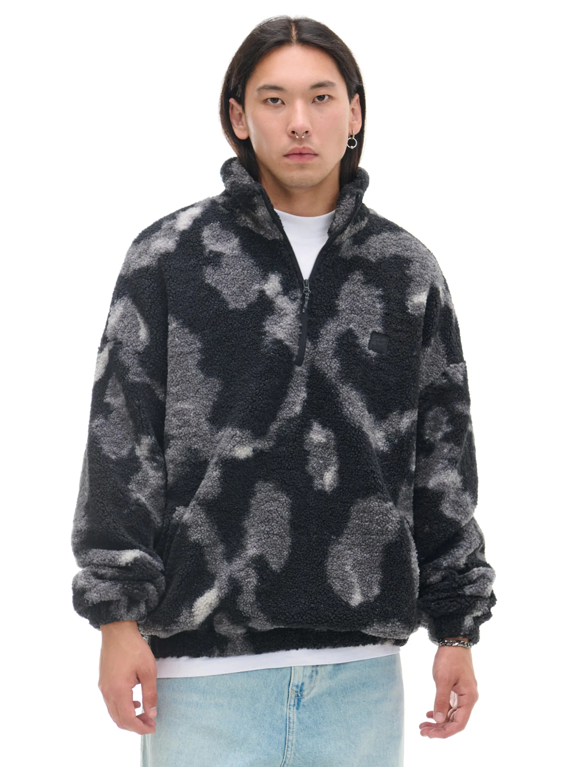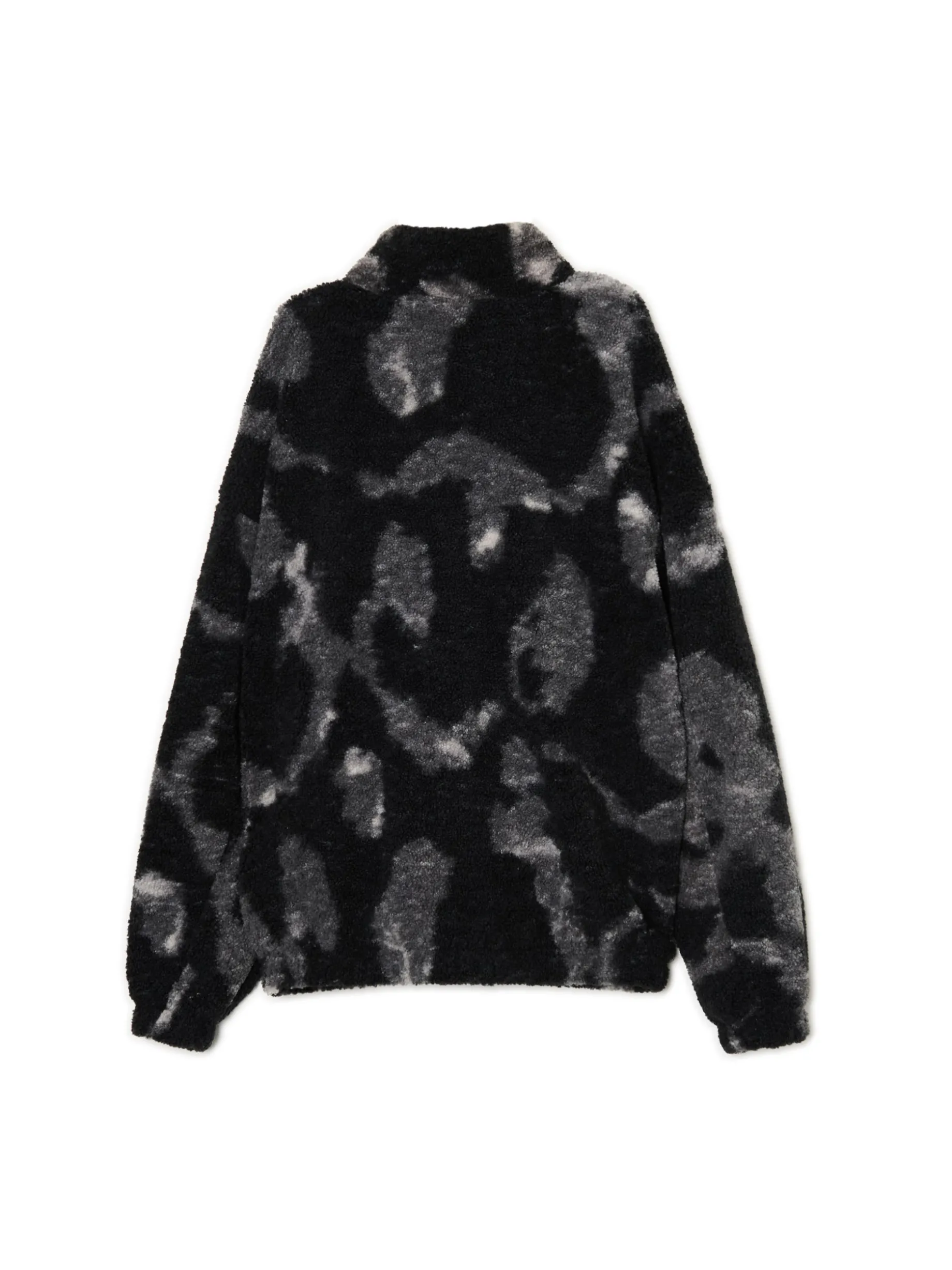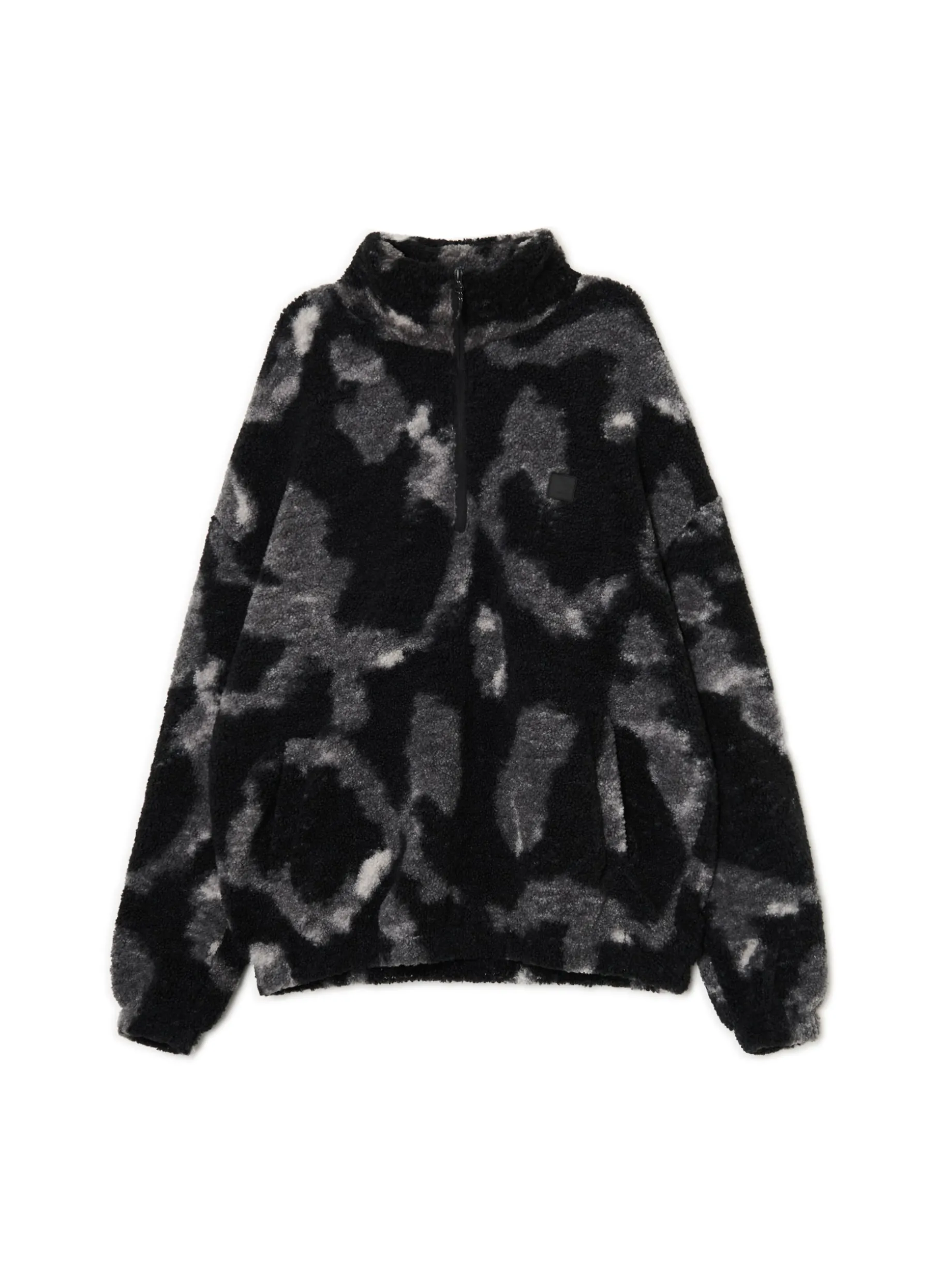 Bluza męska uszyta z imitacji baranka z mozaiki kolorów – czarnego i białego. Od wewnątrz otuli Cię miękkie i przyjemne w dotyku wykończenie. Oldschoolowy item w nowoczesnym wydaniu specjalnie dla Ciebie. bluza typu sherpa o regularnym kroju uszyta z miękkiego, pluszowego materiału wykończenie na podszyciu ze sztucznego baranka stójka zapinana na suwak długie rękawy zakończone gumką otwarte kieszenie po bokach efekt tie-dye na całości naszywka Cropp