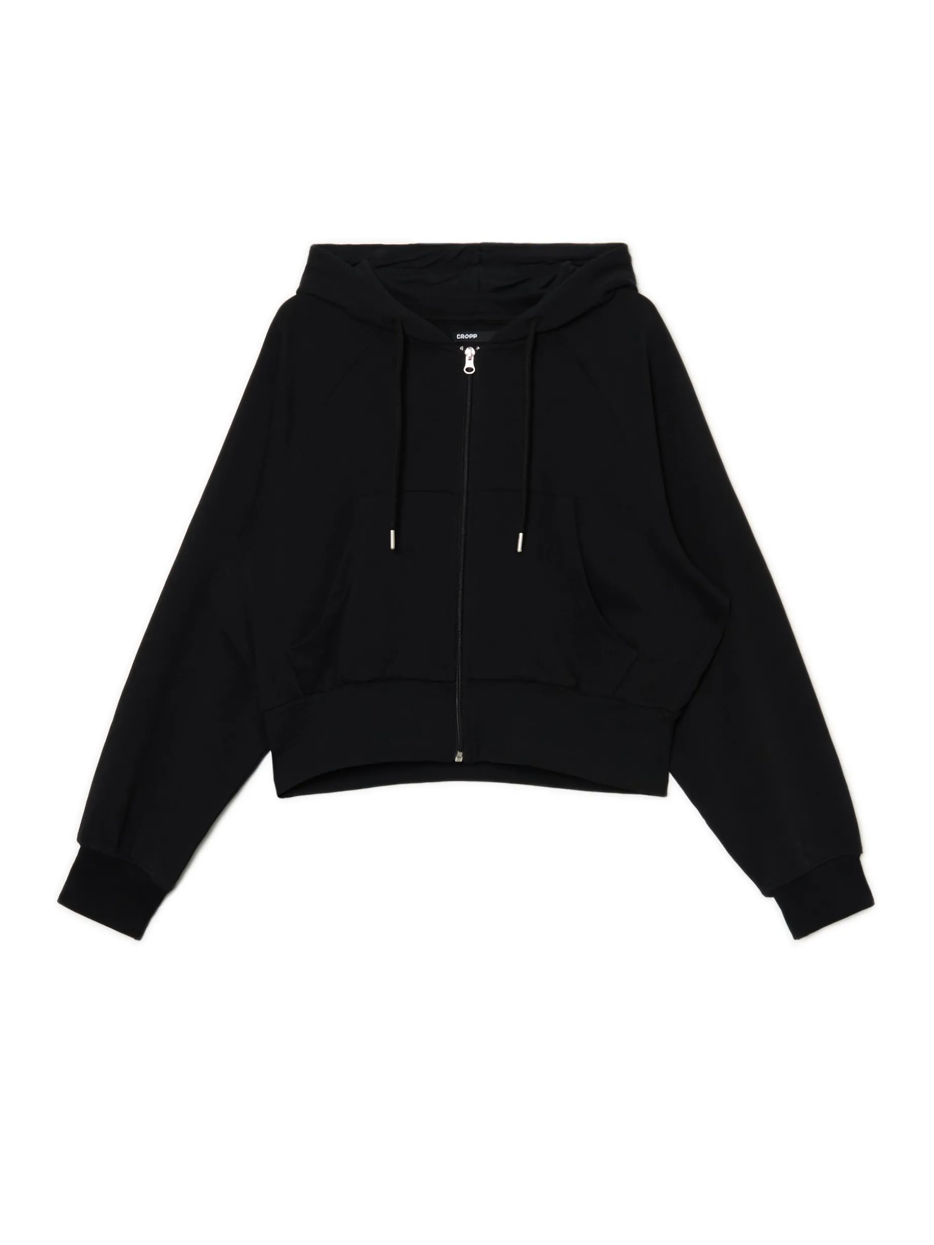 Bluza damska z kapturem o kroju boxy, uszyta z mieszanki dzianin. Dodatek, kóry fituje z wieloma stylizacjami. dzianinowy materiał z bawełną obszerny krój boxy zapinana na zamek na całej długości kaptur regulowany troczkami dół i rękawy wykończone prążkowanym ściągaczem dwie kieszenie z przodu