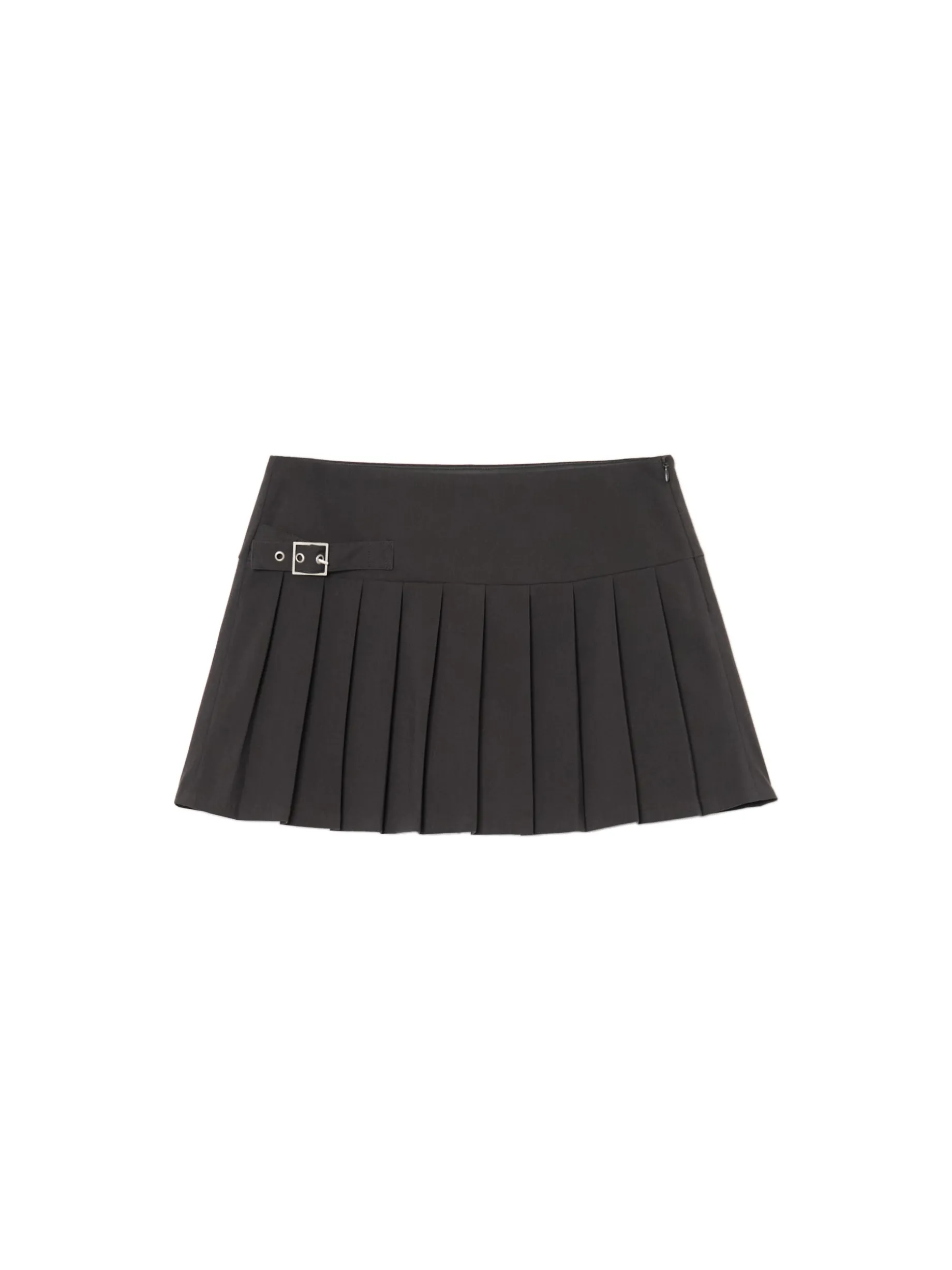 Czarna spódnica damska o długości mini, uszyta z tkaniny zawierającej wiskozę. Zapięcie na kryty z boku, dekoracyjne plisy i ozdobny pasek z klamrą to wyróżniki tego itemu. lekki materiał z wiskozą długość mini zapięcie na kryty zamek boczny plisowanie na całej długości wewnątrz podszewka w kształcie spodenek dla zachowania komfortu