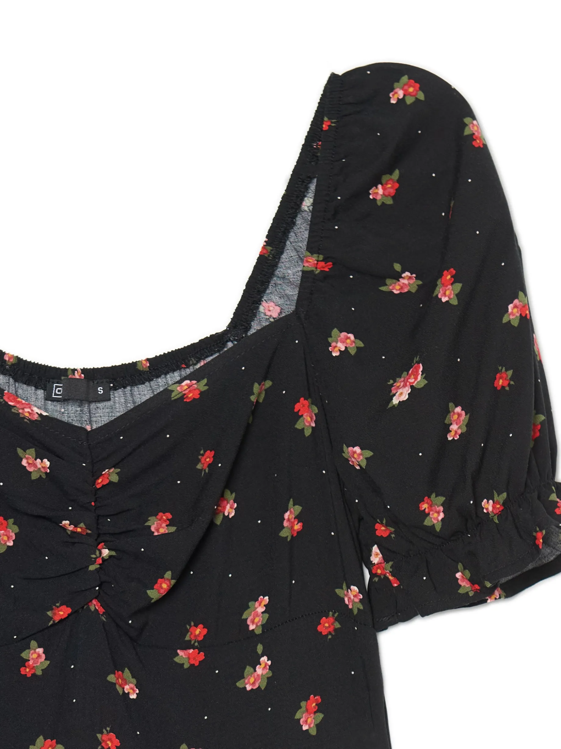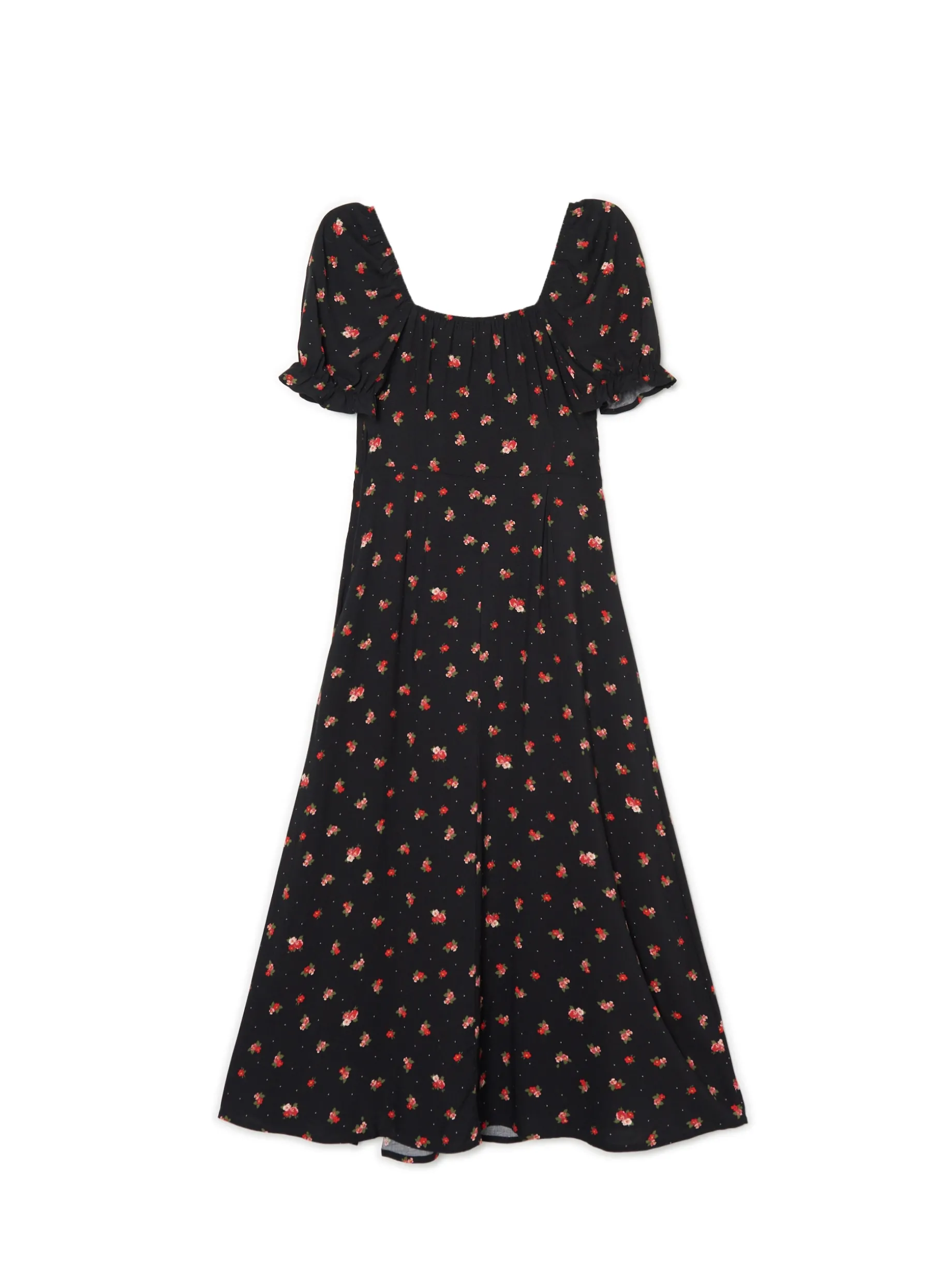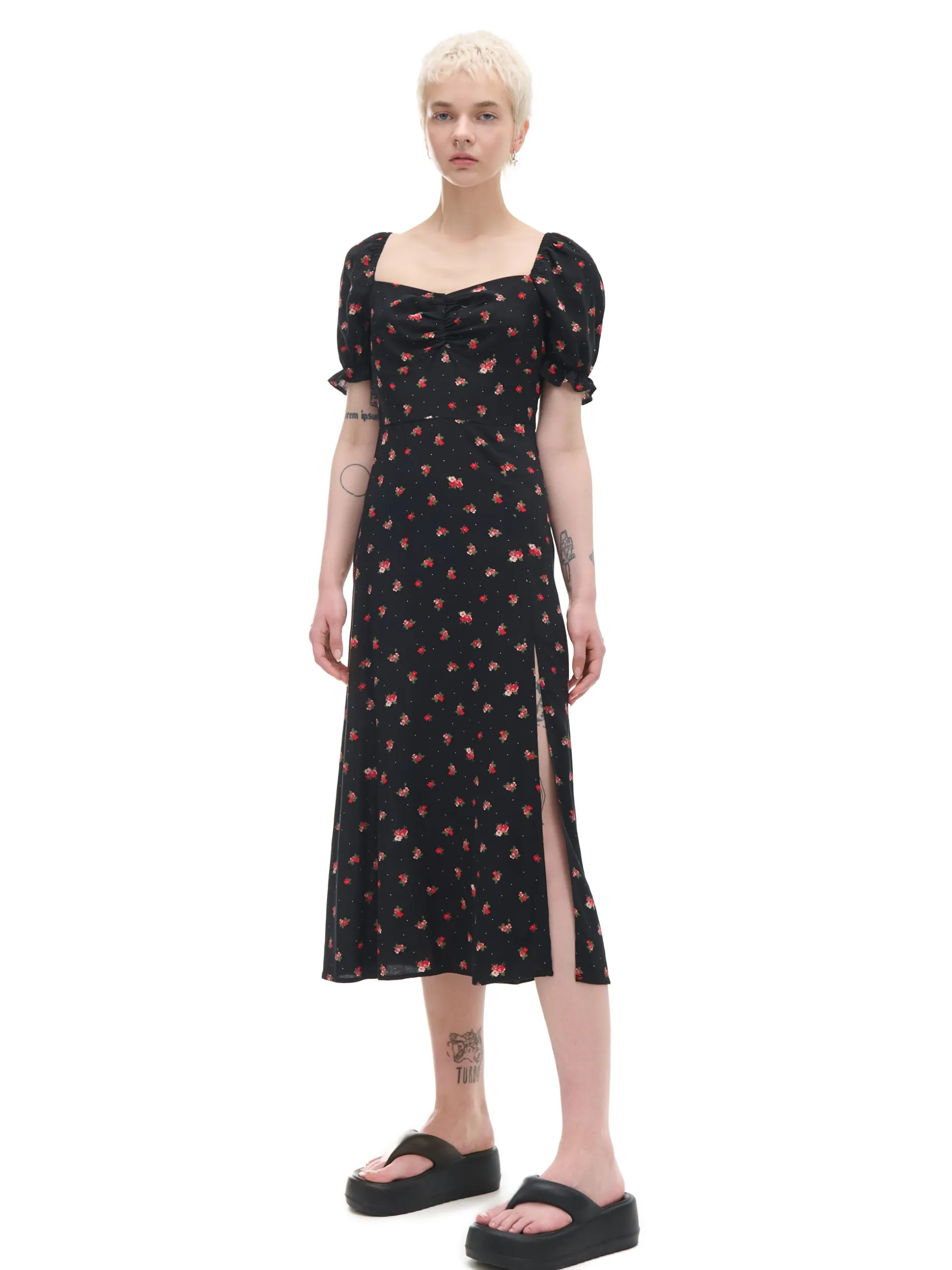 Delikatna damska czarna sukienka z kwiatowym wzorem idealna na letnie dni. 100% wiskozy długość midi rozcięcie z boku dekoracyjne marszczenie pod biustem krótkie, bufiaste rękawy zakończone gumką