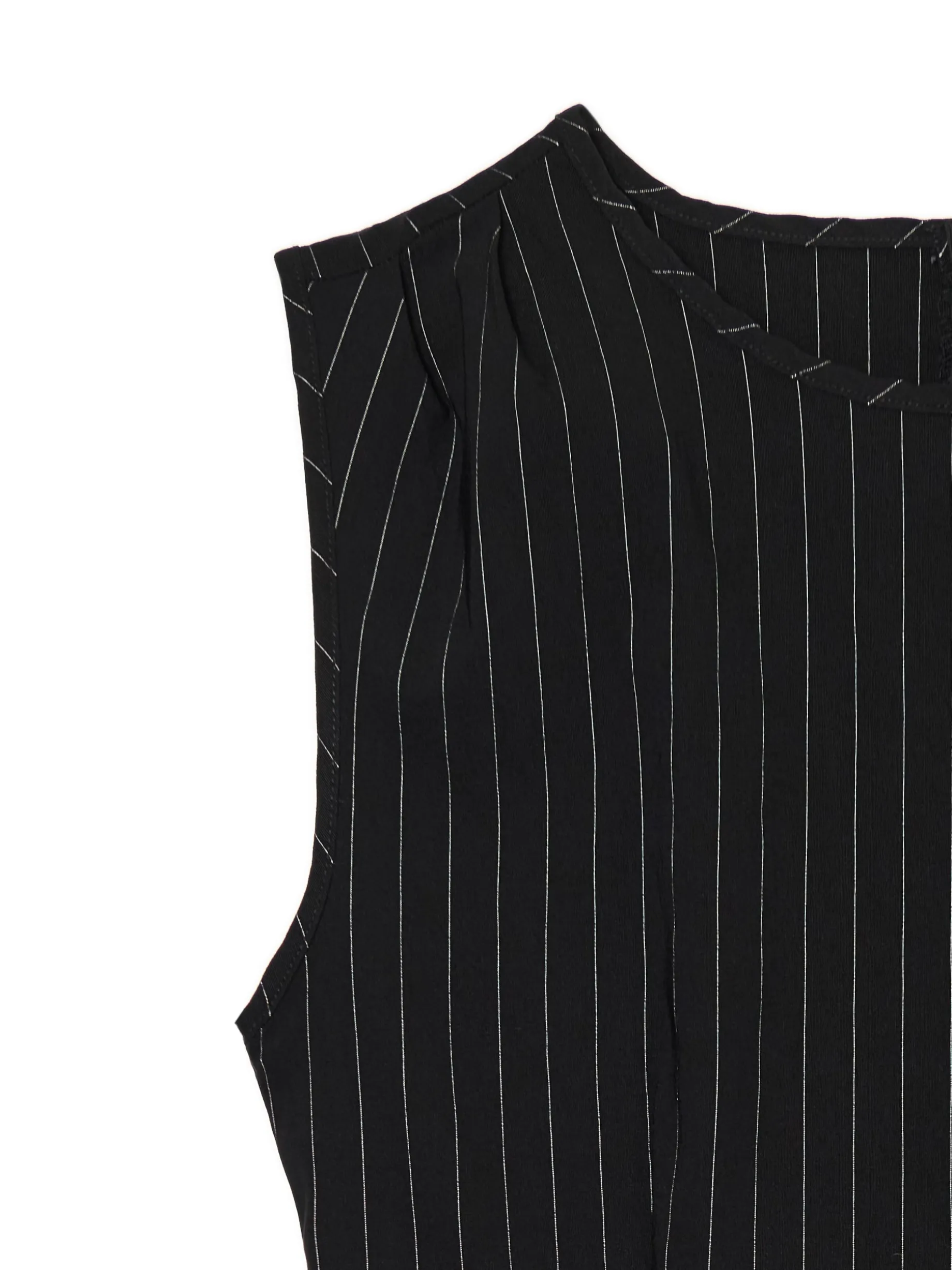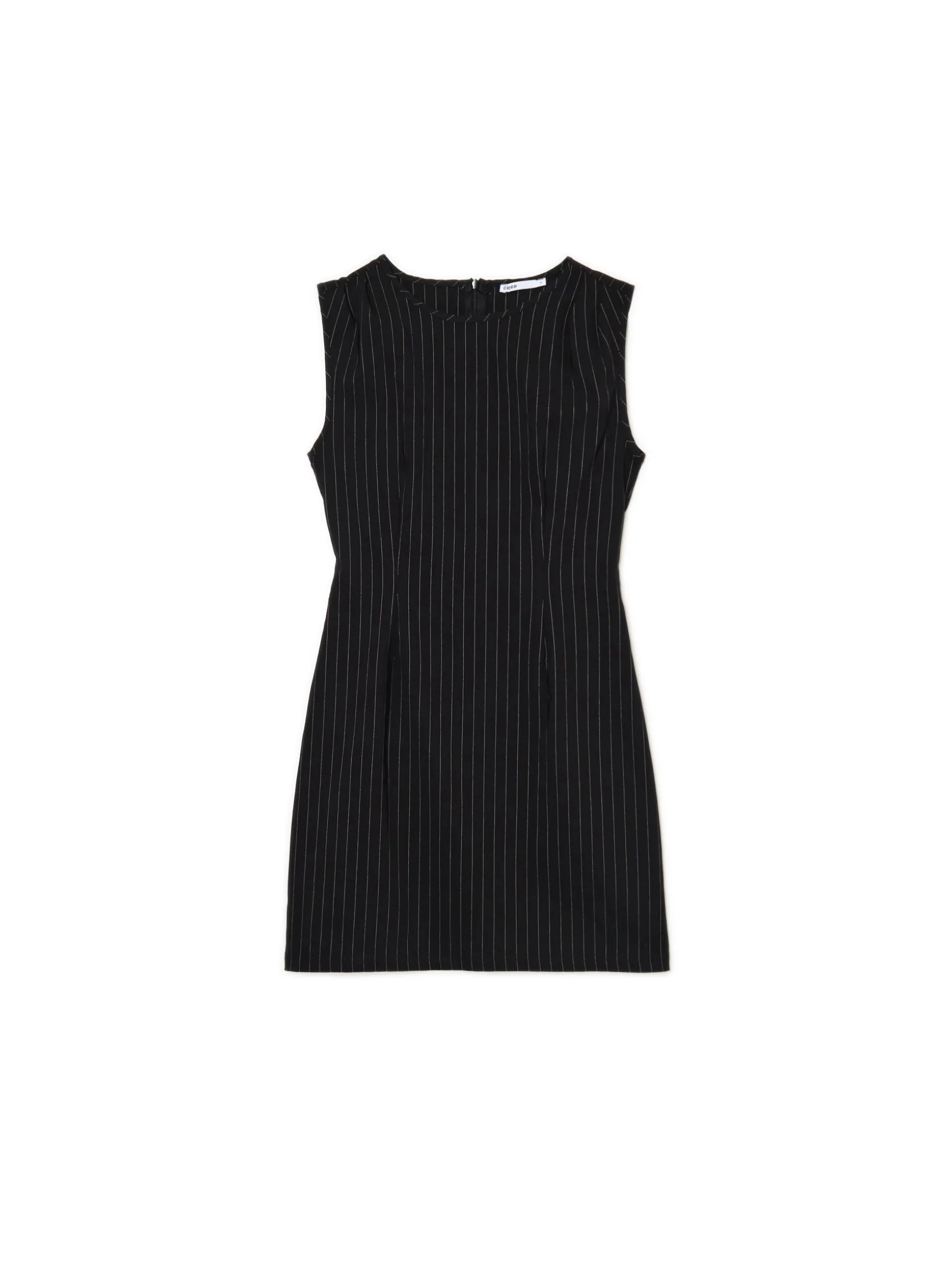 Krótka sukienka, uszyta z niegniecącej się bengaliny o wysokiej zawartości wiskozy. Domieszka elastanu gwarantuje wygodę i dopasowanie. Idealna mała czarna, jeśli chcesz być office siren! długość mini dopasowany krój brak rękawów krój typu princeska zabudowany dekolt typu łódka na plecach kryty suwak wzór w delikatne pionowe prążki w talii przeszycia modelujące sylwetkę