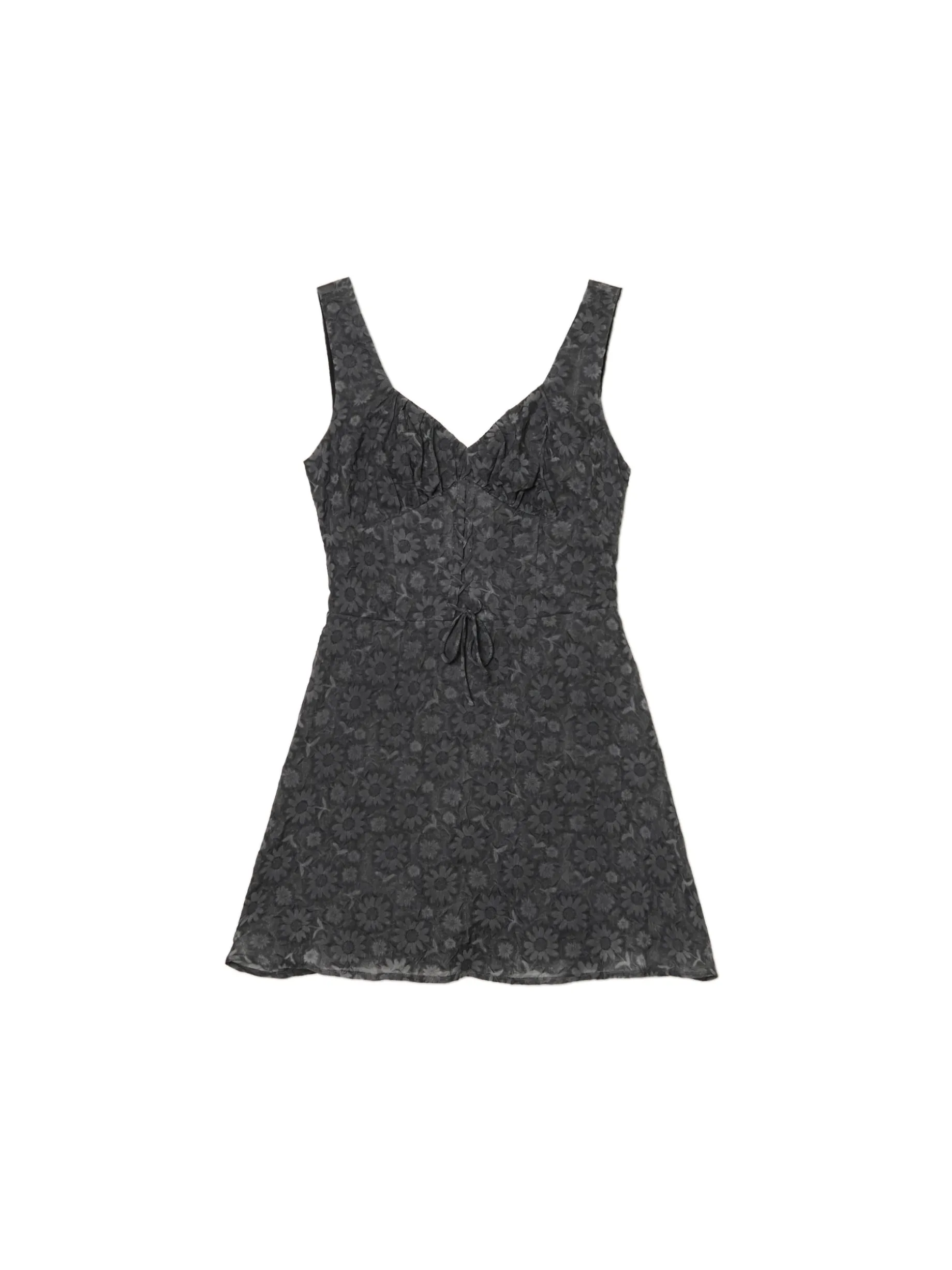 Damska sukienka w czarnym kolorze, uszyta z lekkiego materiału z delikatnym wzorem w kwiaty na całym materiale. Idealna na letnie spontany! lekki materiał długość mini rozszerzany dół zapięcie na kryty zamek z tyłu szersze ramiączka głęboki dekolt w kształcie litery V zaszewki modelujące biust i talię dekoracyjne marszczenie pod biustem sznurowanie i ozdobne przeszycia kwiatowy wzór