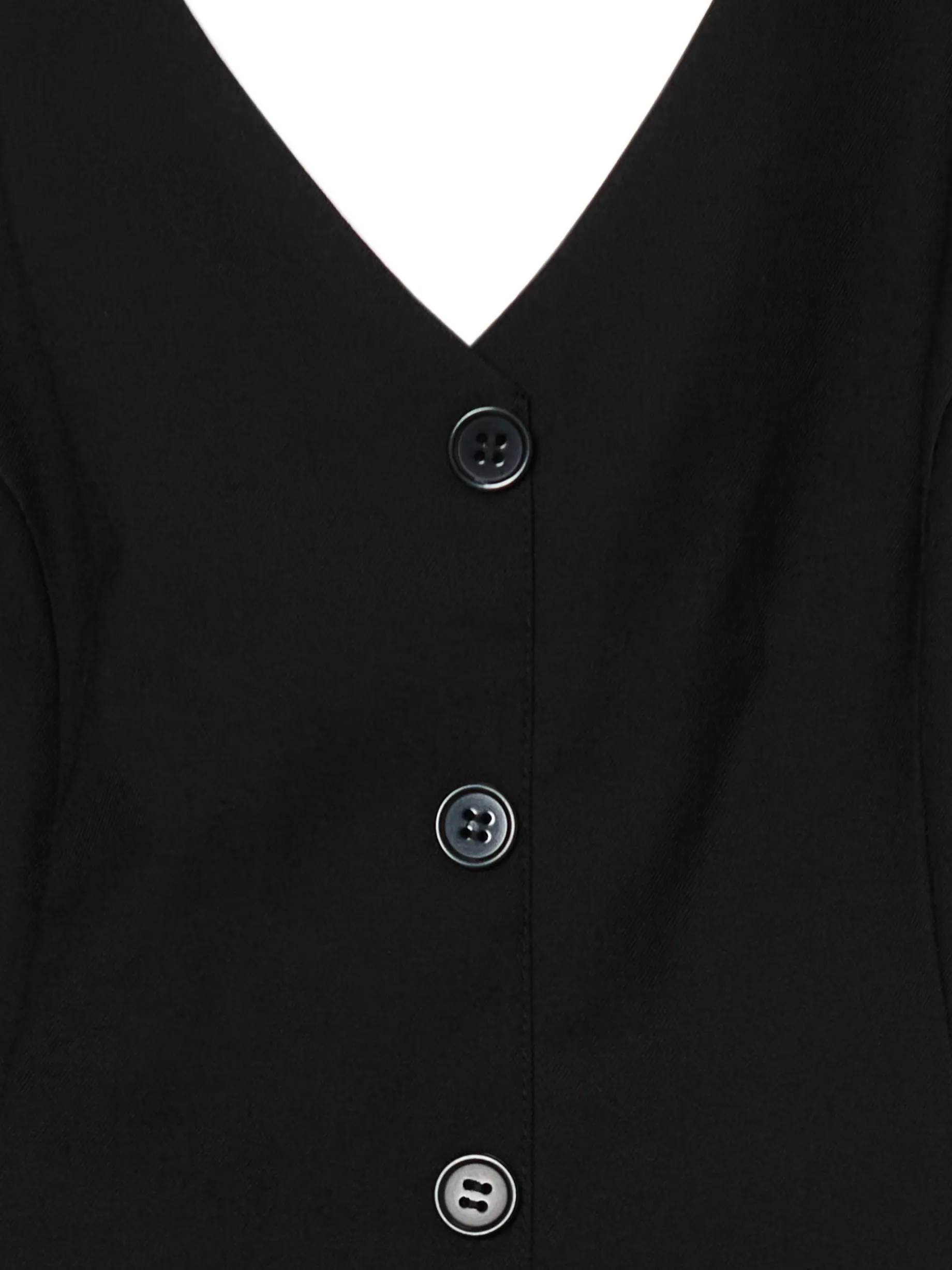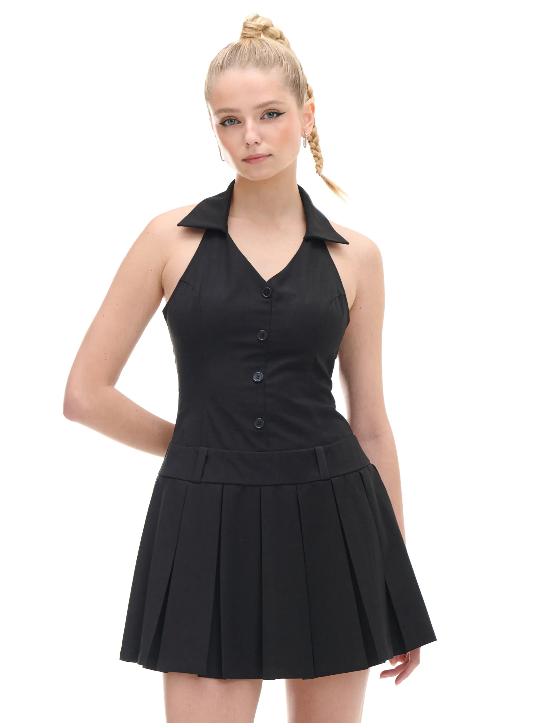 Damska sukienka o długości mini, wykonana z gładkiej mieszanki tkanin w kolorze czarnym. Wygląda fantastycznie w wersji soft ze sportowymi, jak i eleganckimi dodatkami. Sama zdecyduj! tkanina z dodatkiem elastycznych włókien, dzięki czemu model dopasowuje się do zmieniającej się sylwetki długość mini zapięcie na kryty zamek z boku elastyczna wstawka z tyłu dekolt typu halter kołnierzyk, wycięcie w kształcie litery V szlufki na pasek plisowany, lekko rozkloszowany dół