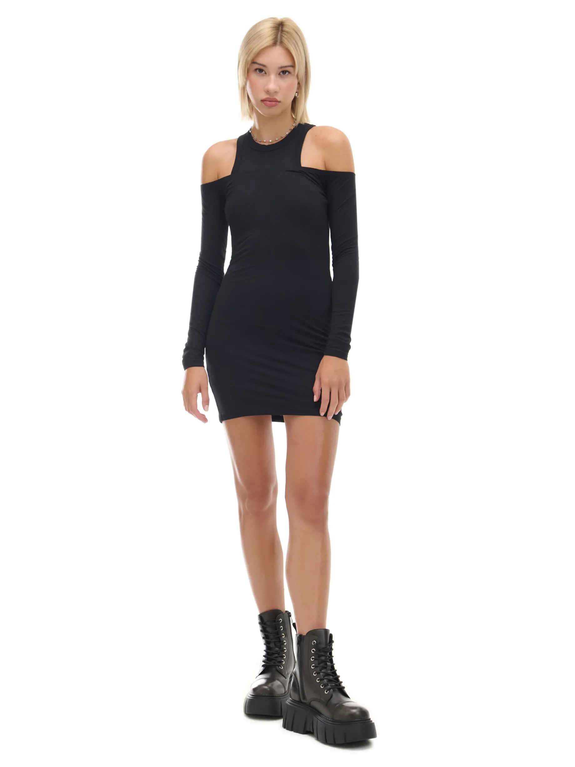 Damska sukienka o długości mini, uszyta z dwuwarstowej, półtransparentnej dzianiny. Te efektowne wycięcia na ramionach dopełniają stylizację. dzianinowy materiał z bawełną długość mini dopasowany krój podkreślający sylwetkę długi rękaw z wycięciami na ramionach półokrągły dekolt z lamówką Wzrost modelki: 177 cm