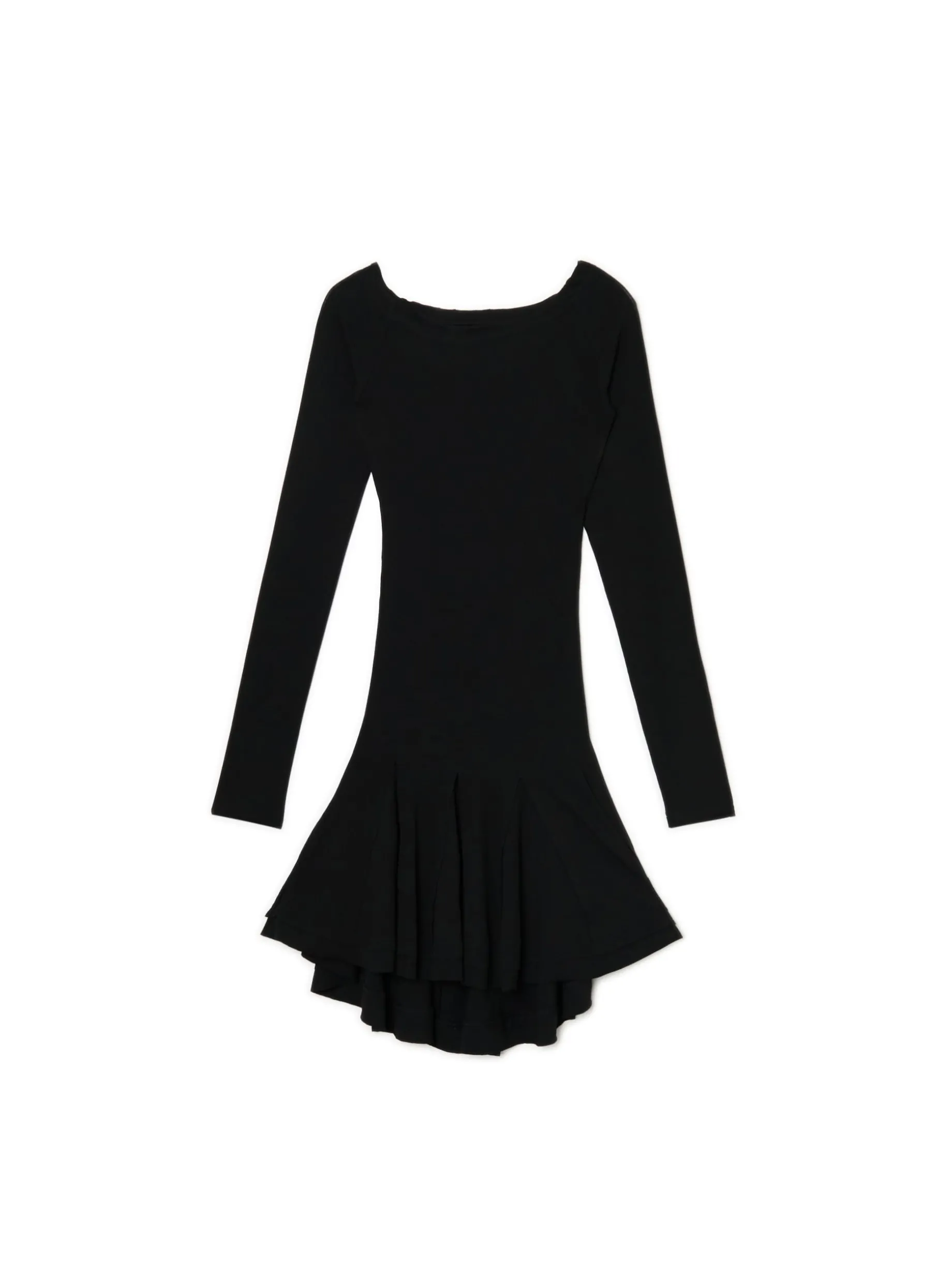 Krótka czarna sukienka, uszyta z lekkiej dzianiny zawierającej wiskozę. długość mini krój A dekolt typu łódka długie, proste rękawy marszczenia w talii plisowany dół surowe wykończenie brzegów Wzrost modelki: 177 cm