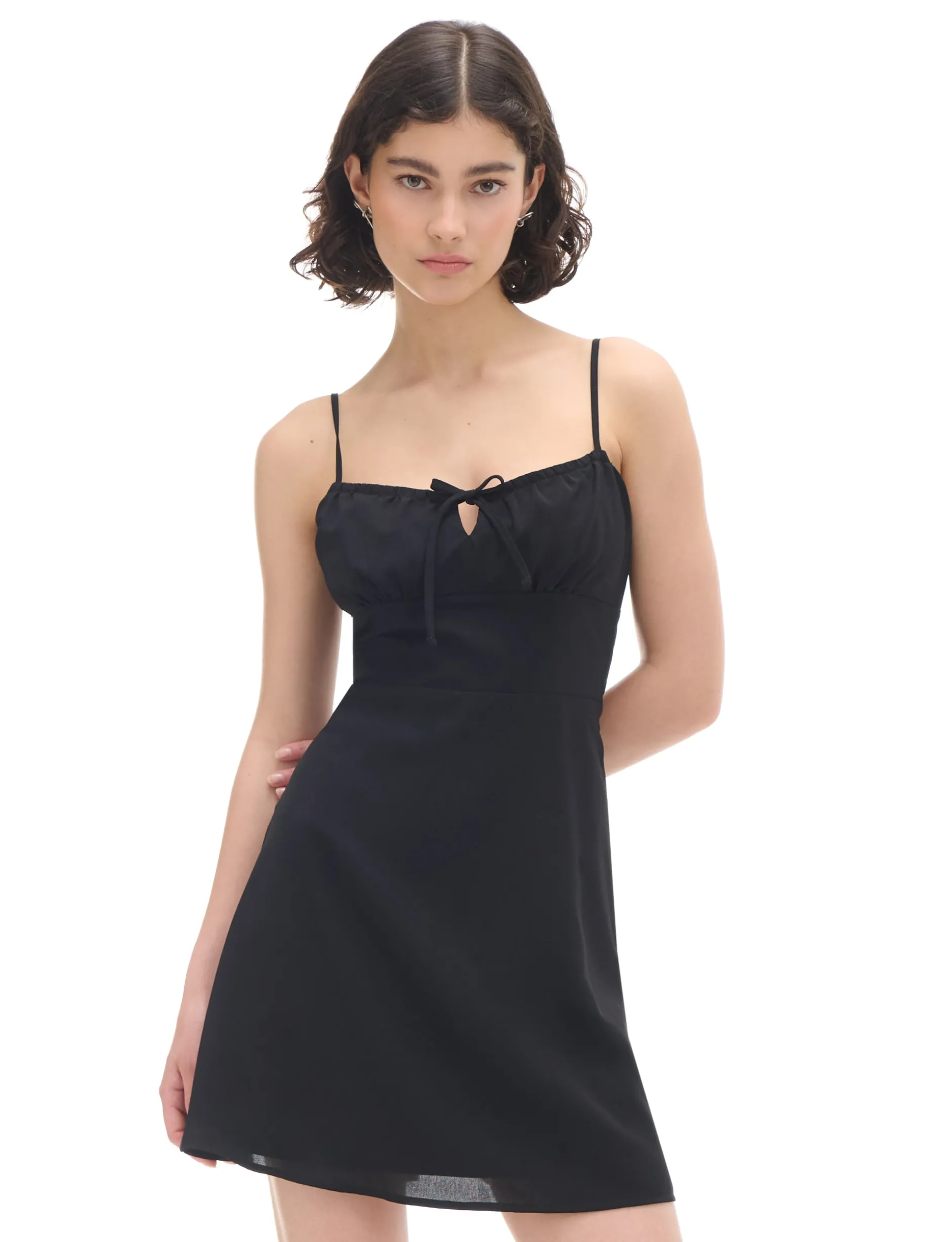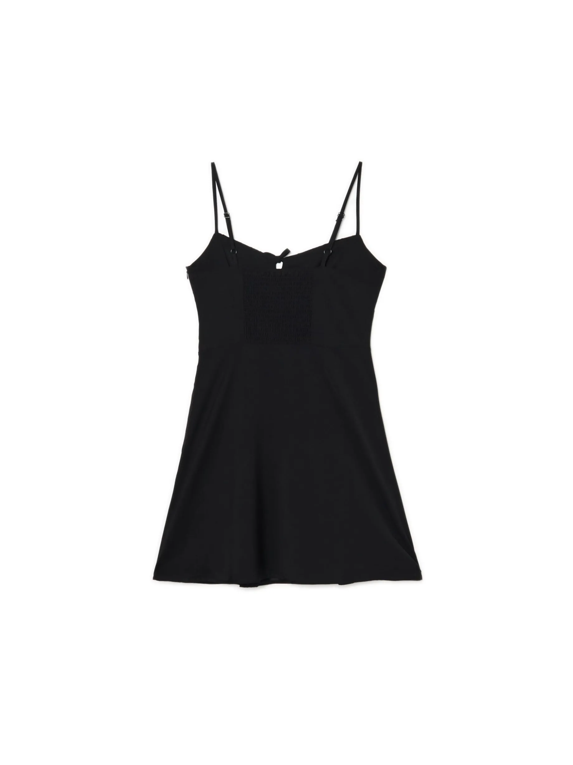 Lekka, zwiewna sukienka o długości mini. Idealna propozycja na lato! lekki materiał długość mini odcięcie w talii zapięcie na kryty zamek z boku dekolt w kształcie litery V elastyczna wstawka z tyłu wąskie ramiączka z regulacją długości z przodu ozdobne wiązanie Wzrost modelki: 172 cm
