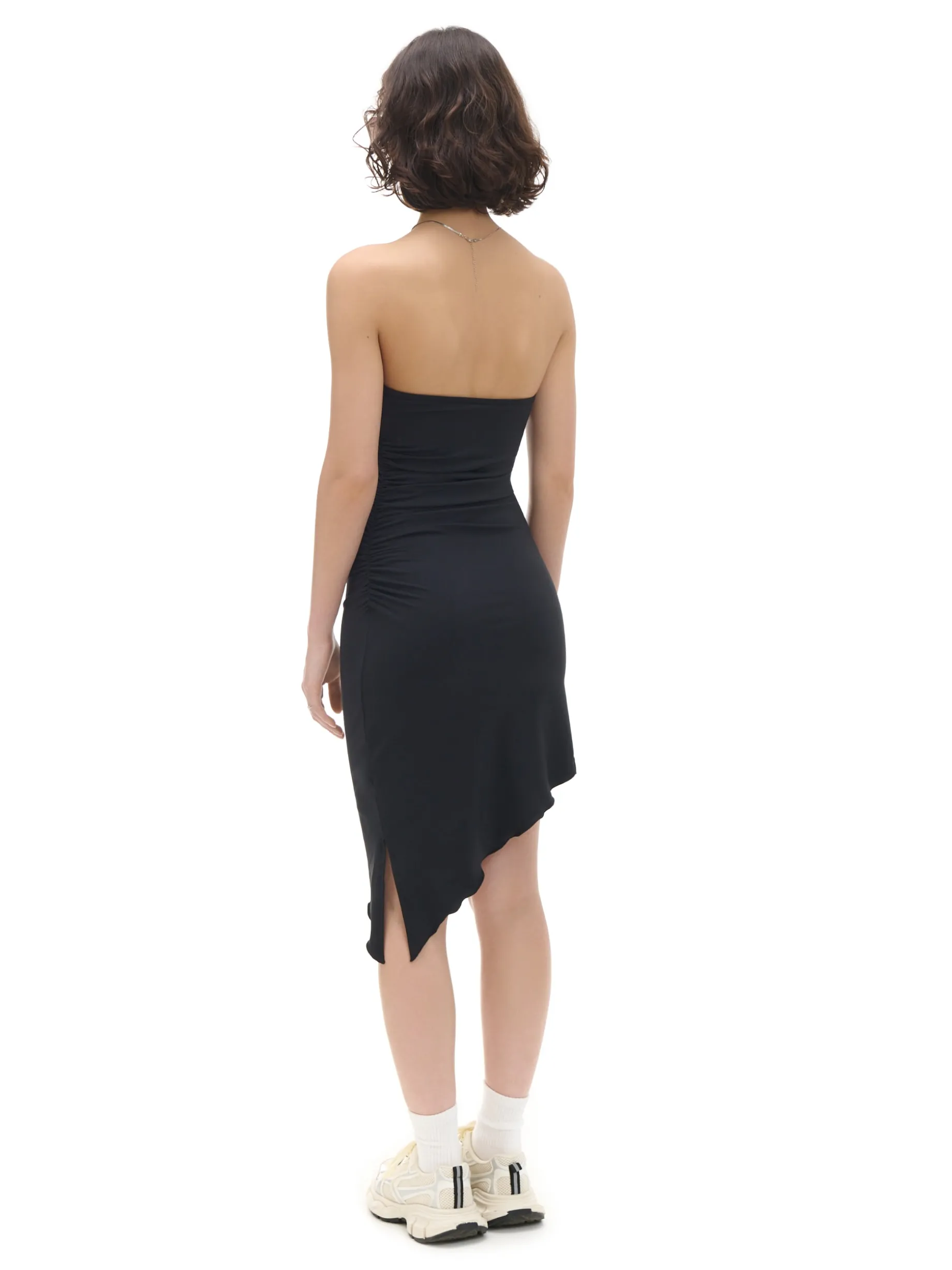 Czarna sukienka bez rękawów ze ściętym dołem i ozdobnymi marszczeniami to must have imprezowego outfitu. dzianina z dodatkiem elastycznych włókien dopasowany krój podkreślający sylwetkę długość mini bez rękawów podwójny materiał w miejscu biustu ozdobne marszczenia Wzrost modelki: 172 cm