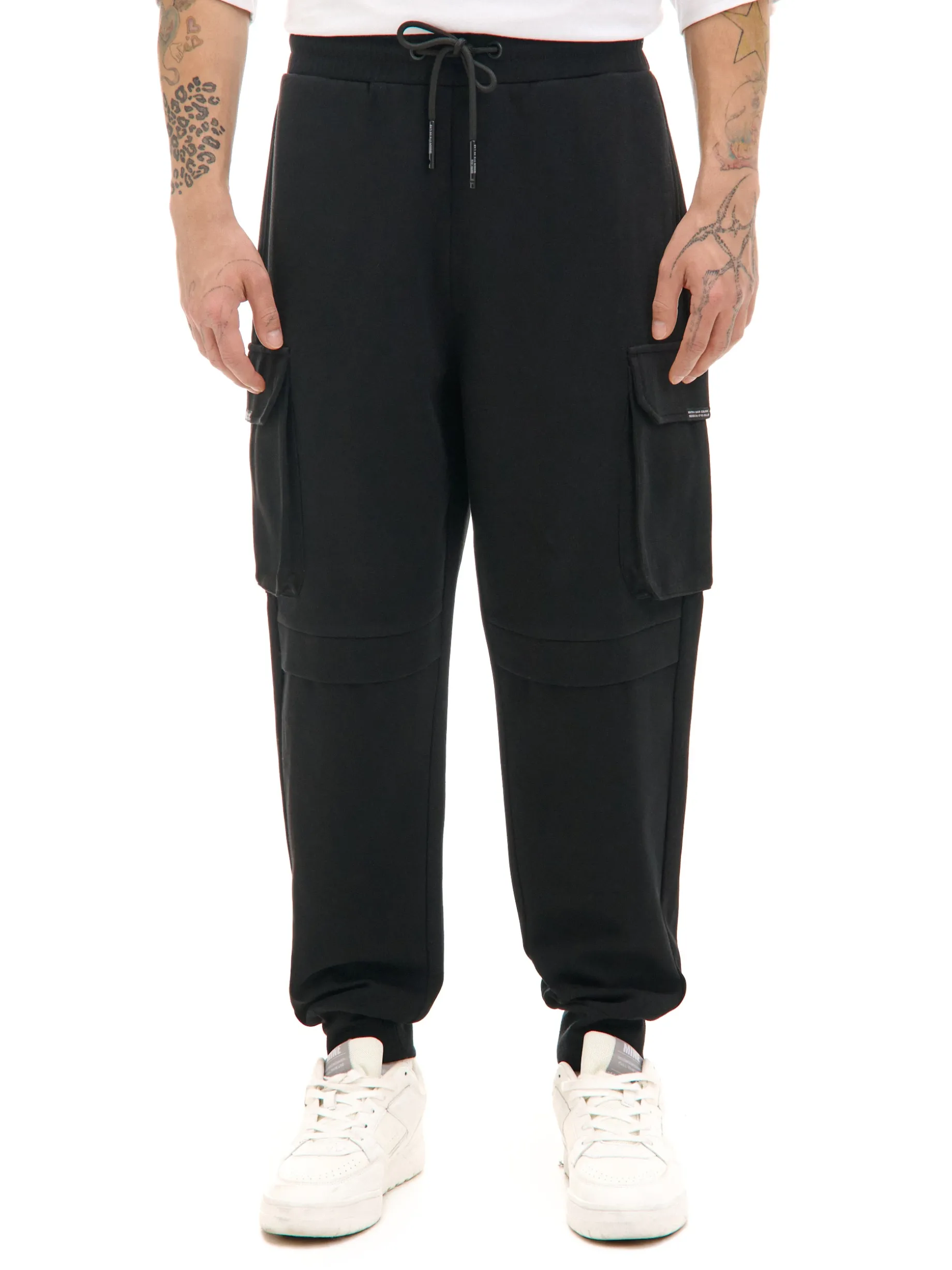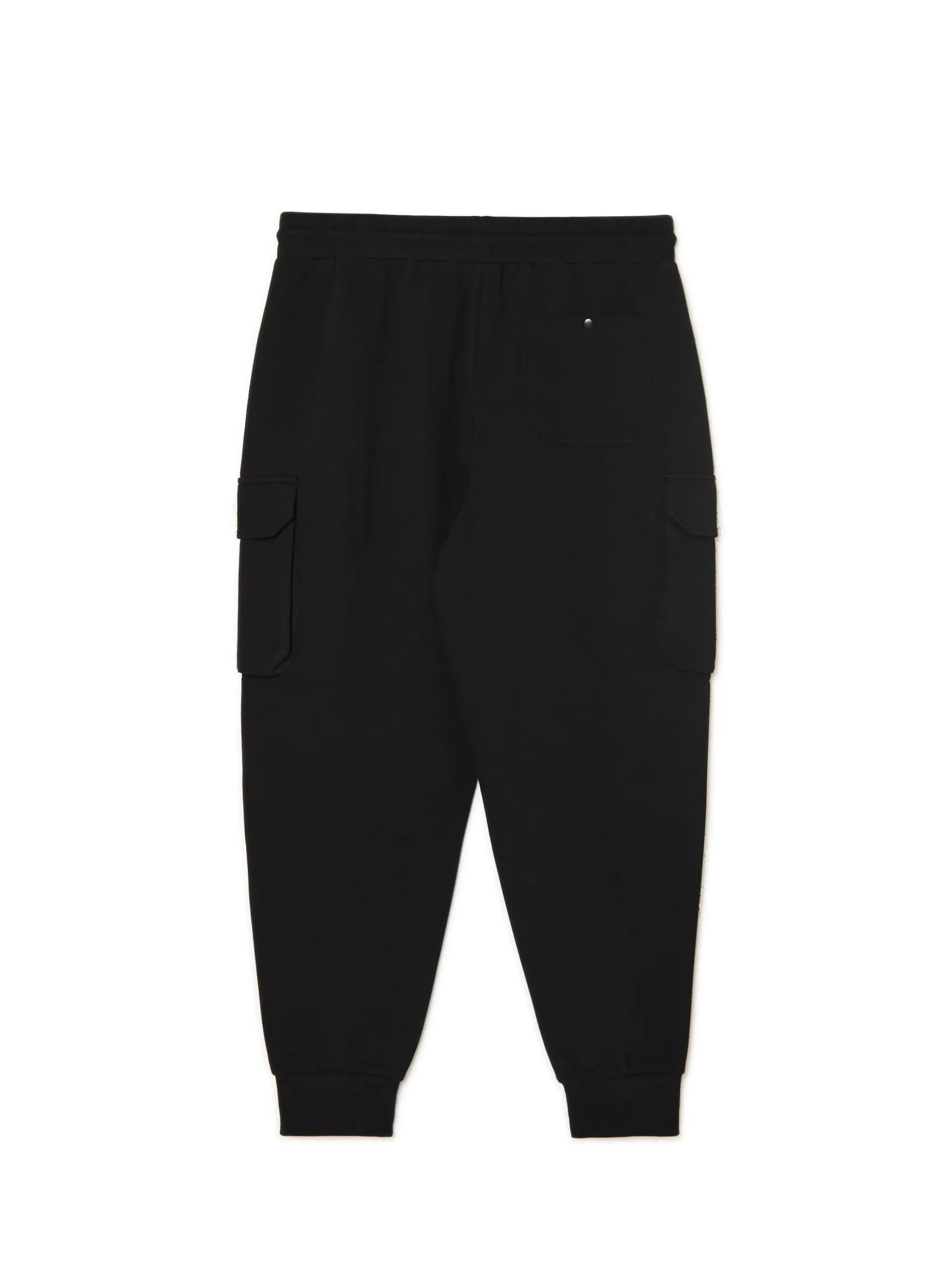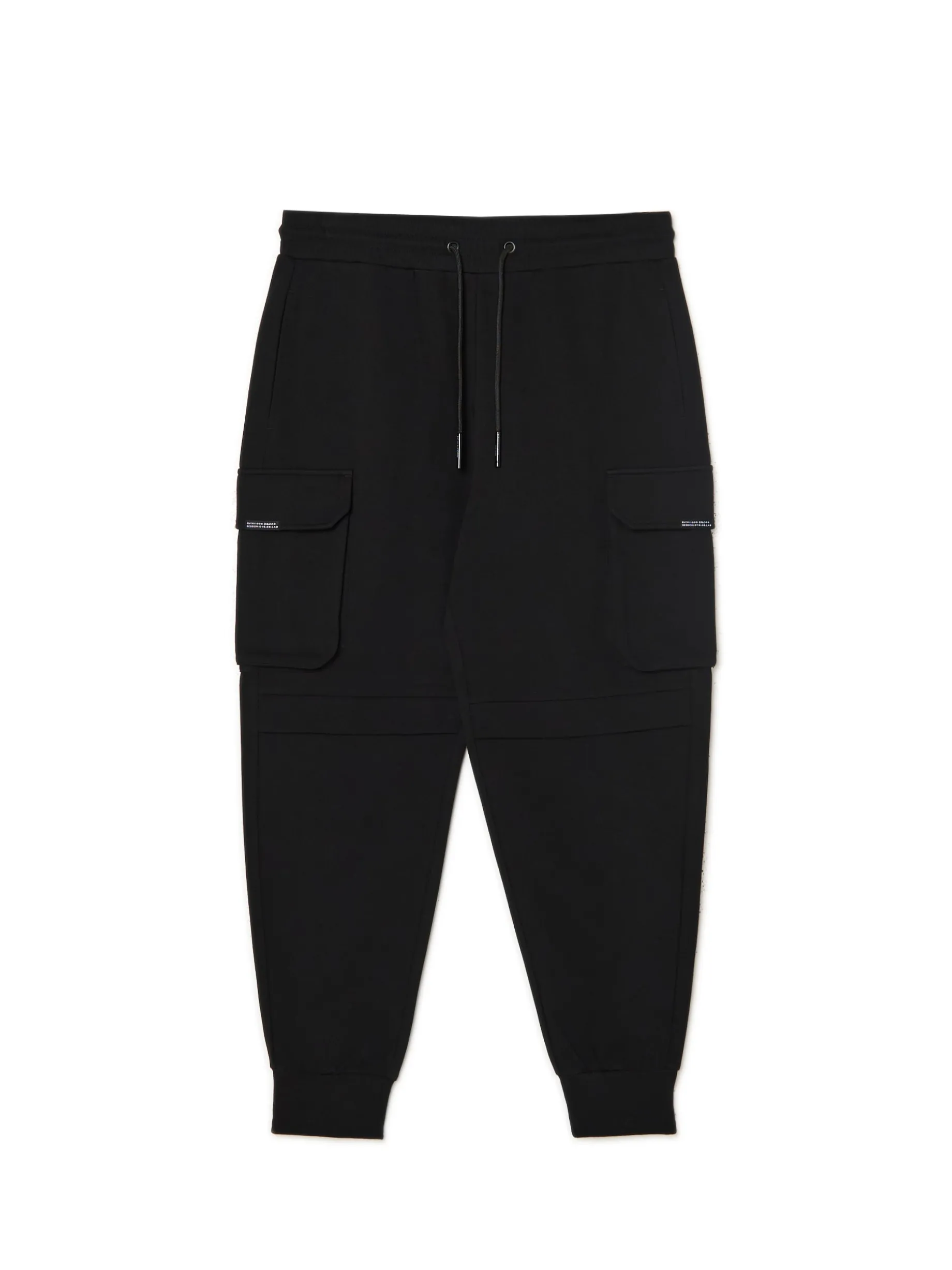 Czarne męskie dresy uszyte z dżersejowej dzianiny zawierającej bawełnę. Regularny stan, komfortowe zapięcie i co najważniejsze duża ilość kieszeni to must have tej jesieni. dzianina z dodatkiem elastycznych włókien regularny stan guma w pasie ze sznurkiem do regulacji długie nogawki wykończone ściągaczem 7 kieszeni, w tym jedna z zapięciem na zatrzask otwarte kieszenie po bokach 4 kieszenie z patkami na nogawkach efekt sprania na całości ozdobne wstawki na nogawkach naszywki na kieszeniach