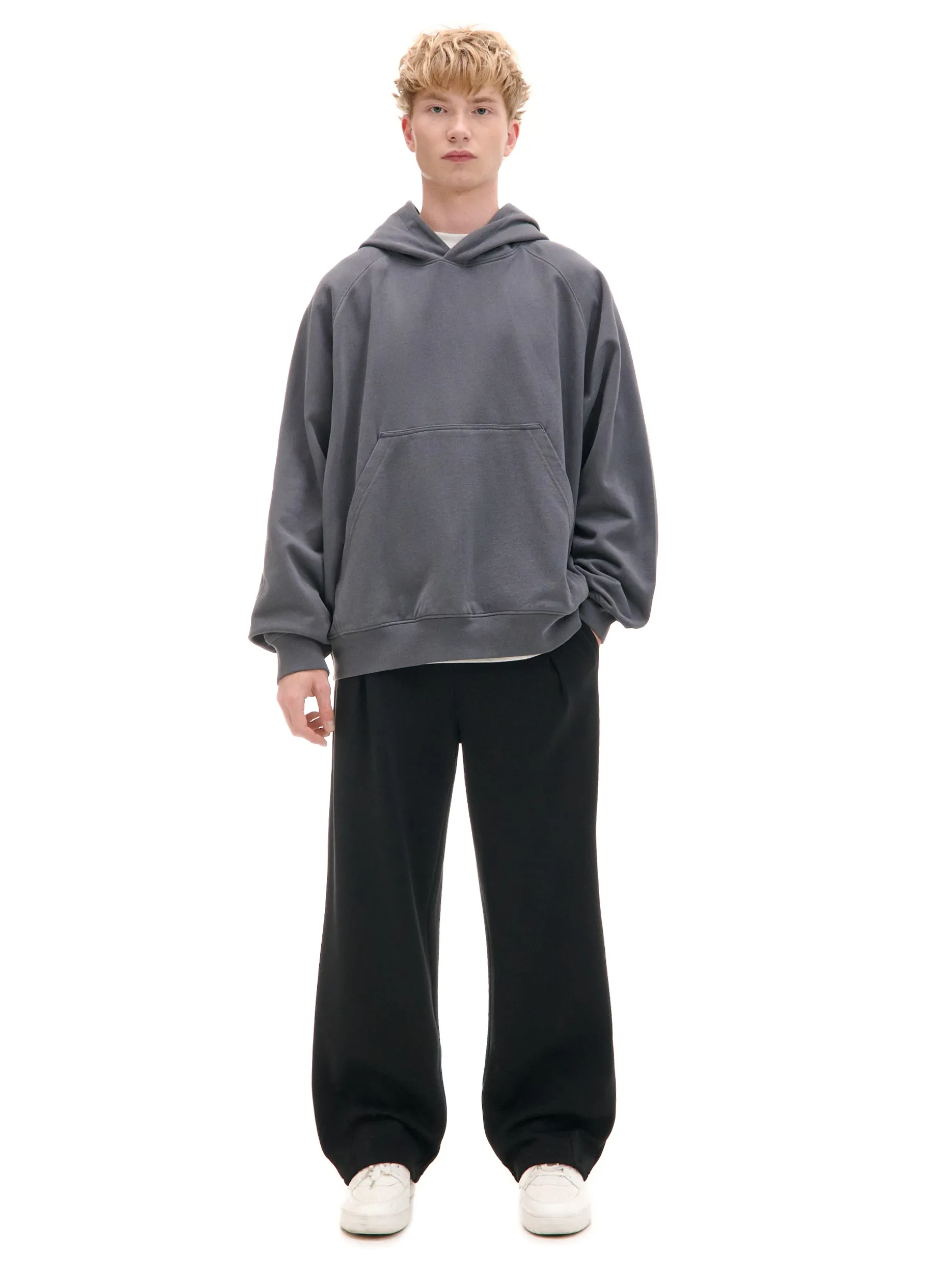 Stylowe i wygodne, czyli to, co w dresach jest najważniejsze. Męskie dzianinowe spodnie o sportowym fasonie z szerokimi nogawkami. Uszyte z mieszanki dzianin z dodatkiem miękkiej bawełny fleecy. Idealne na siłownię, spacer czy chillowanie na kanapie. dzianinowy materiał z bawełną swobodny, luźny krój elastyczna guma w pasie długie, szerokie nogawki trzy kieszenie, jedna zapinana na zatrzask ozdobne zakładki