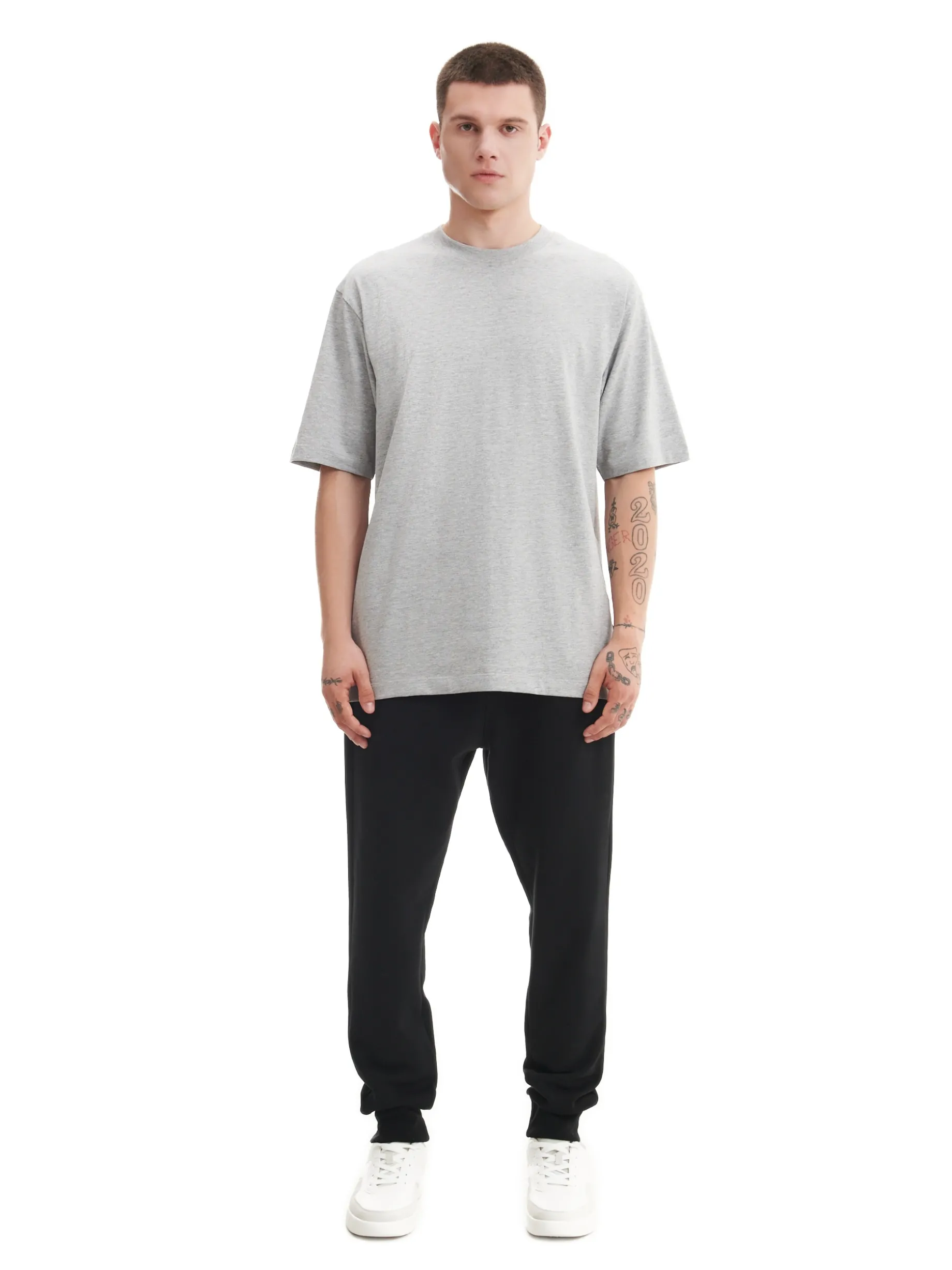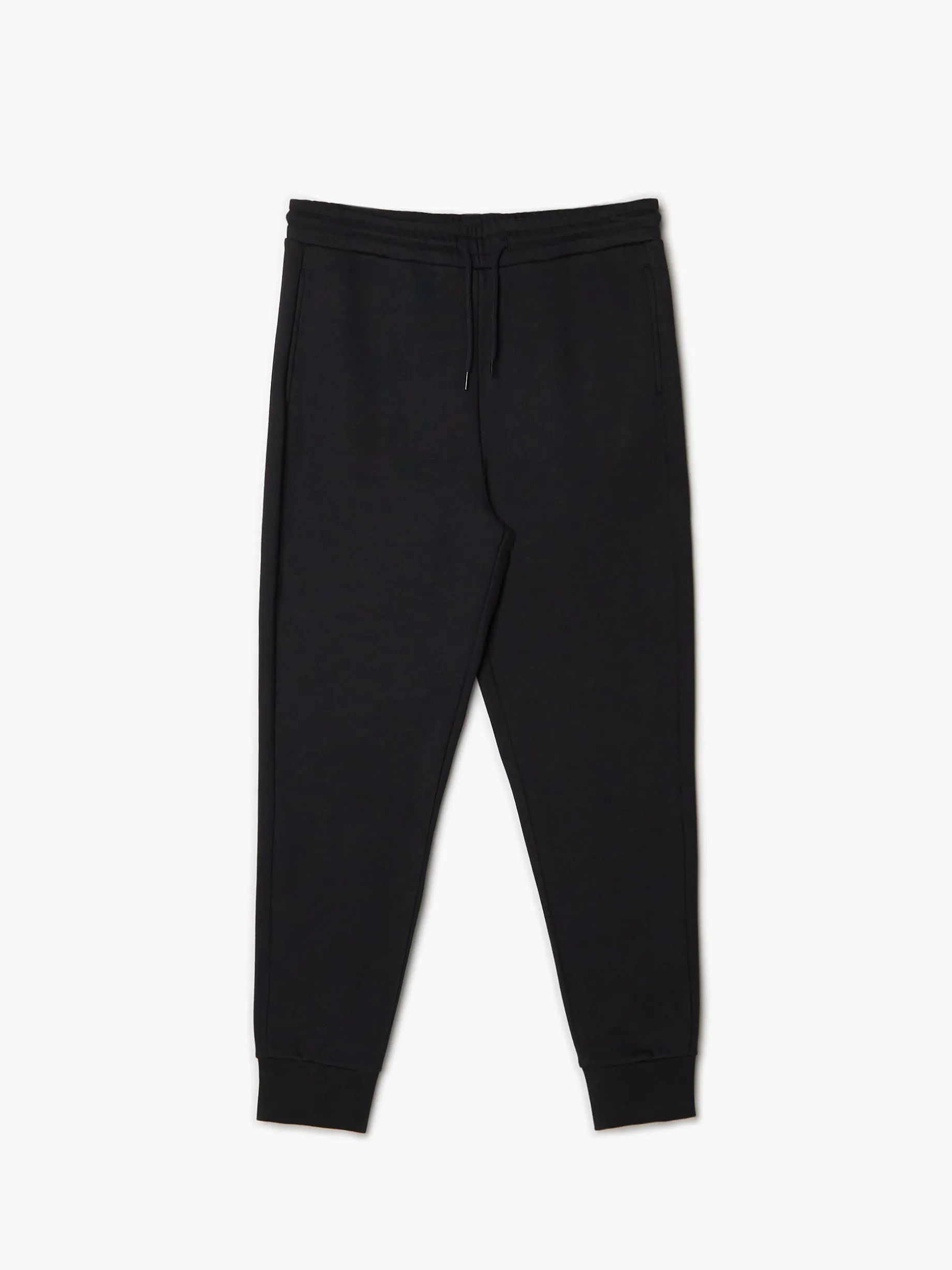 Męskie czarne spodnie dresowe, uszyte z z dzianiny zawierającej bawełnę. regularny stan w pasie gumka i sznurek do regulacji długa nogawka, zakończona ściągaczem trzy kieszenie dostępne w innej wersji kolorystycznej Model prezentuje produkt w rozmiarze M/L. Wzrost modela: 185 cm