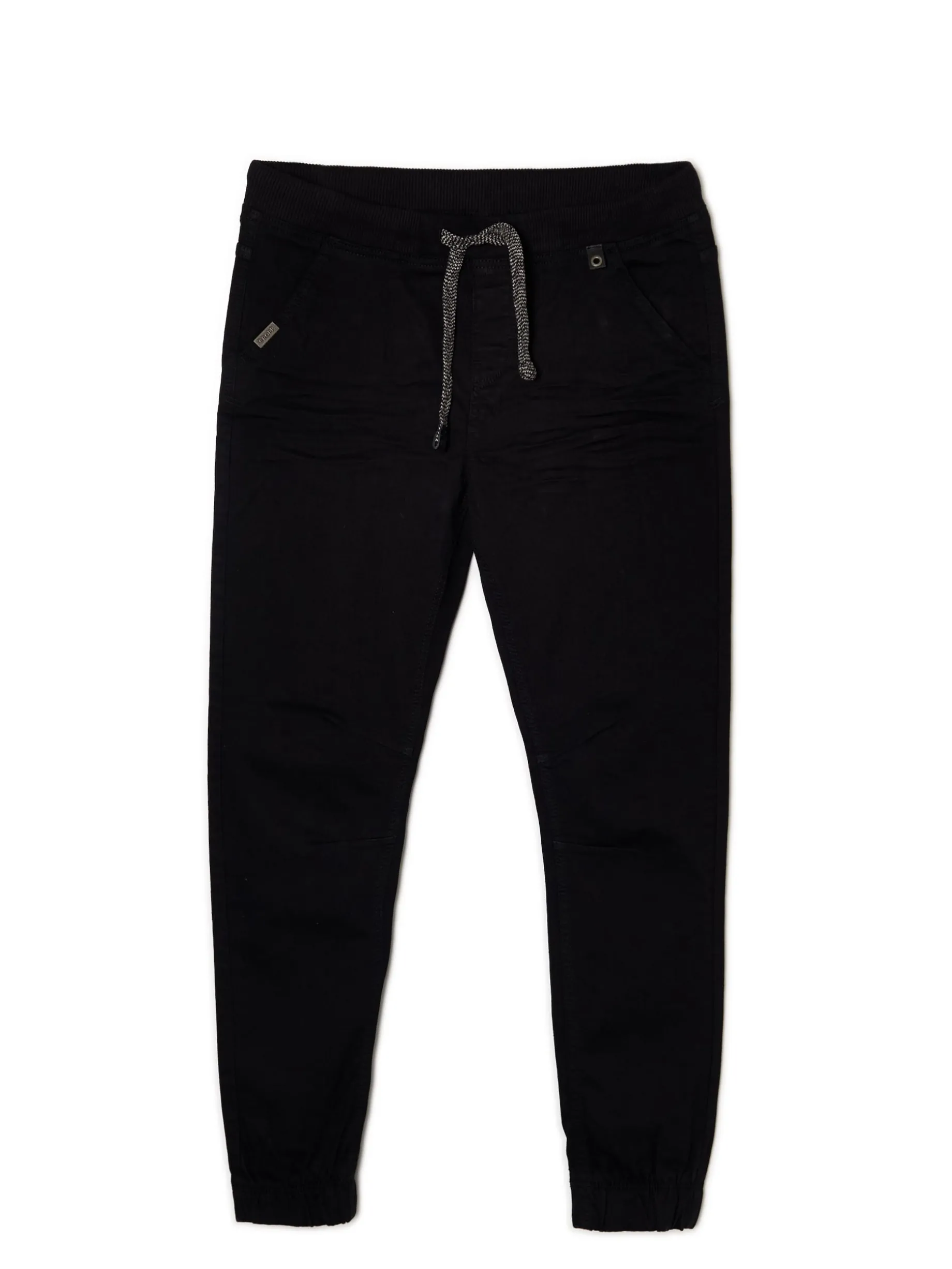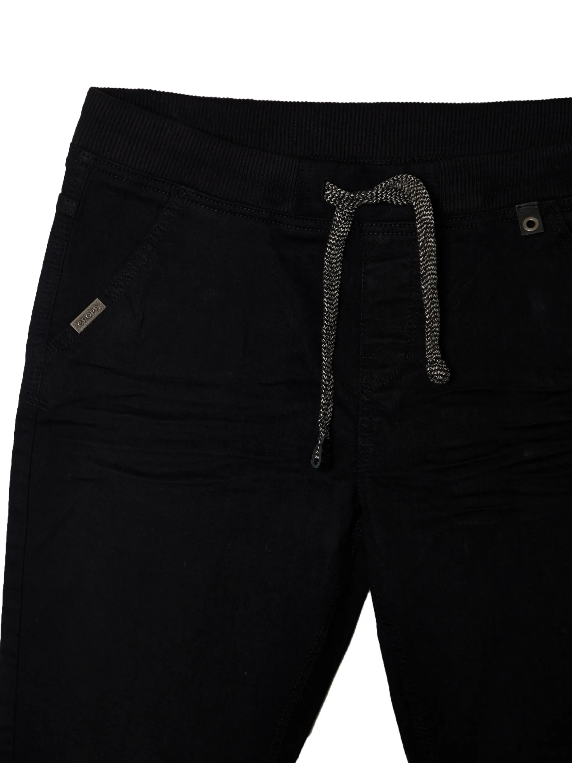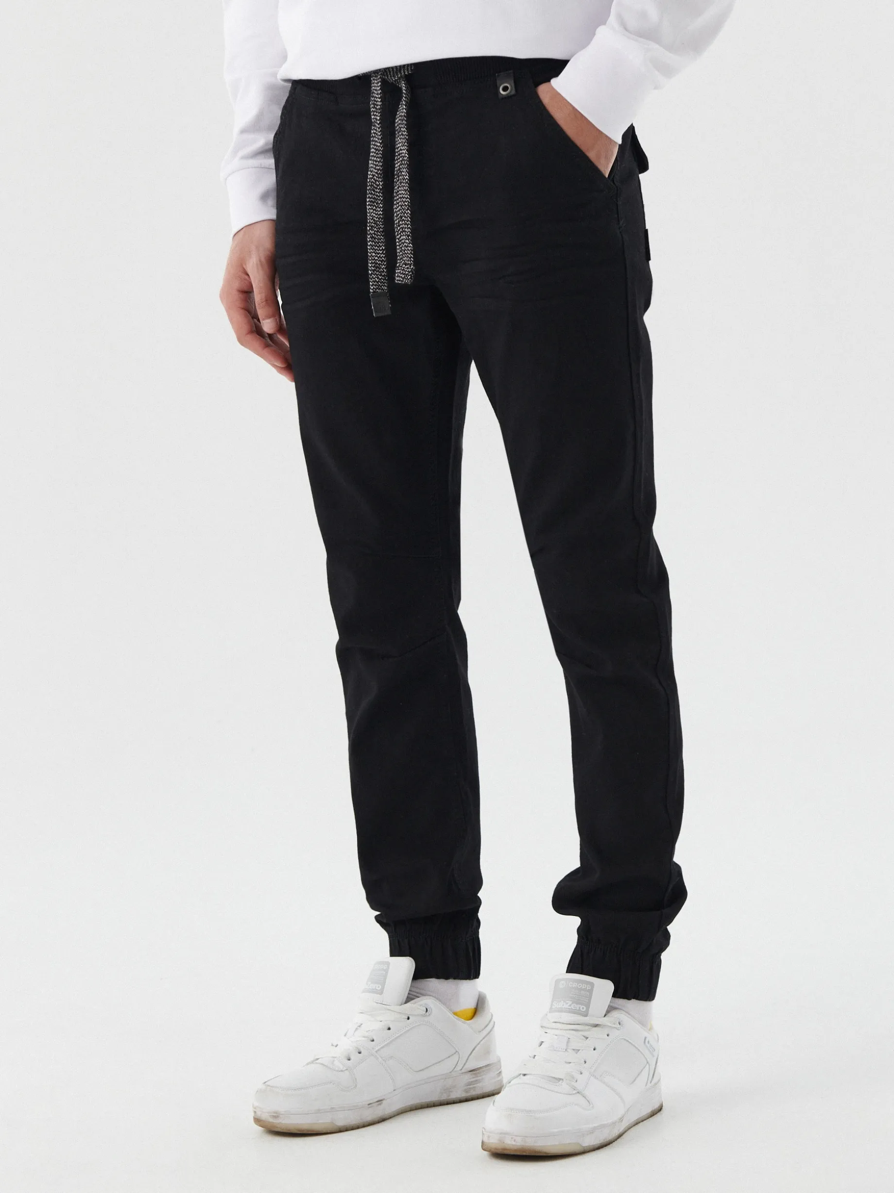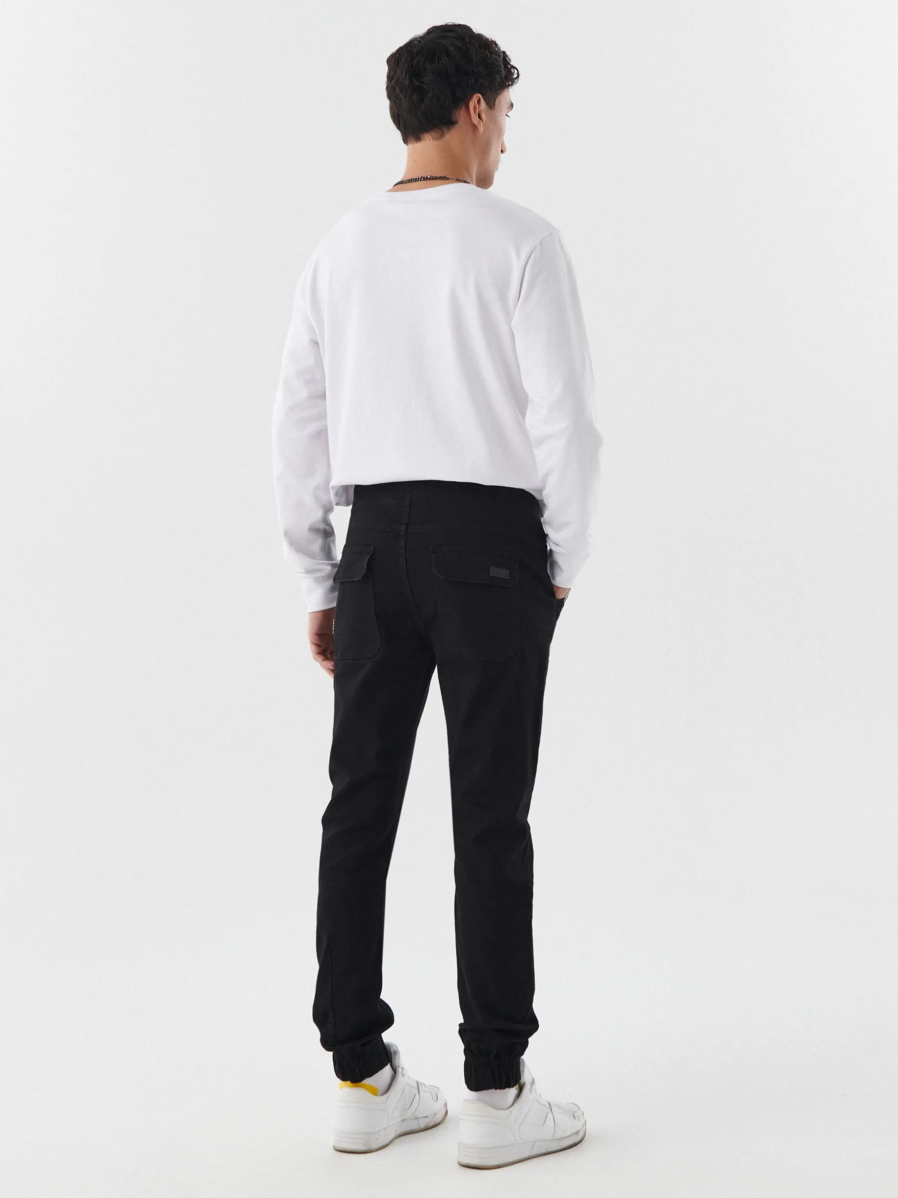 Męskie spodnie jeansowe, uszyte z tkaniny o wysokiej zawartości bawełny. wygodny krój jogger regularny stan elastyczna gumka w pasie i sznurek do regulacji, pas wykonany z miękkiego, dzianinowego ściągacza długa, wąska nogawka zakończona gumką cztery kieszenie, w tym dwie zapinane na zatrzaski dostępne w innych kolorach
