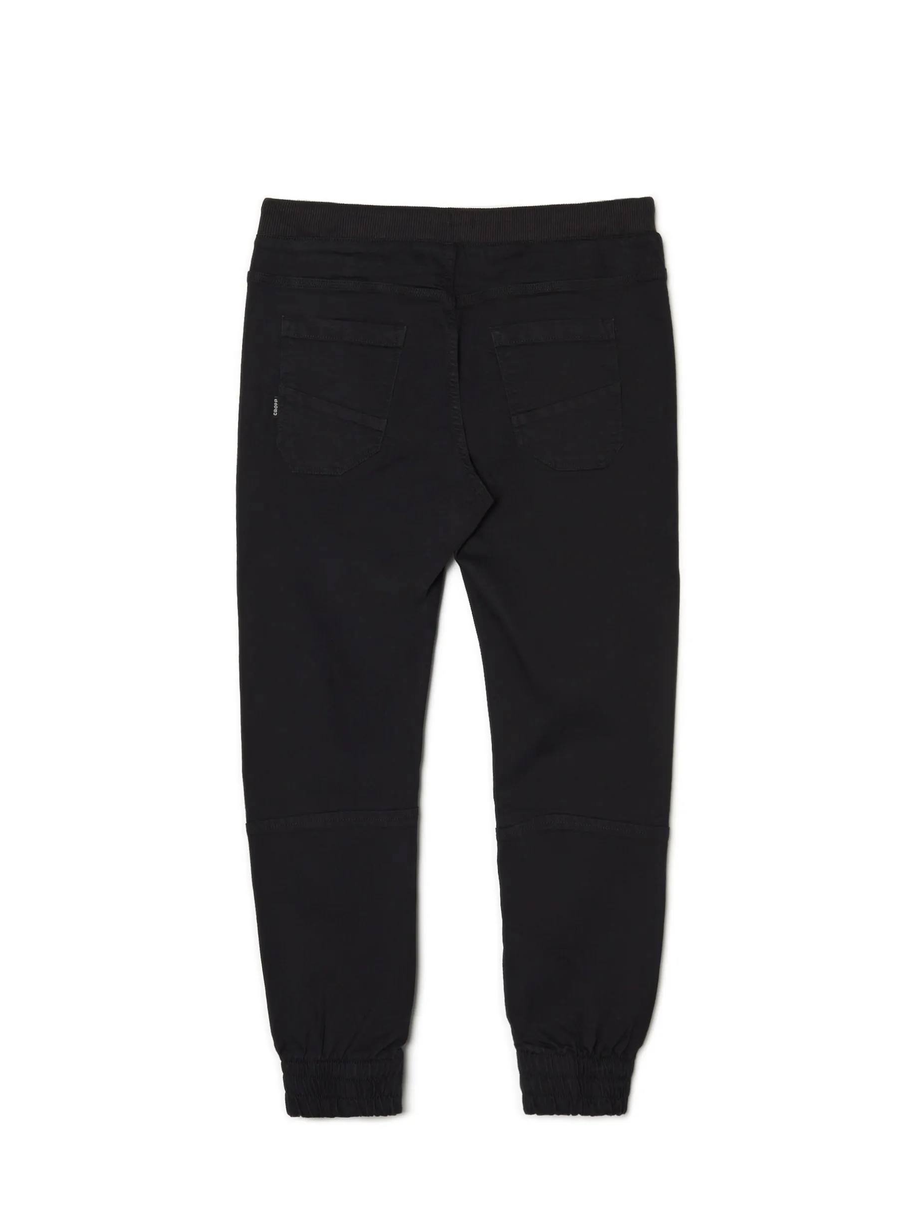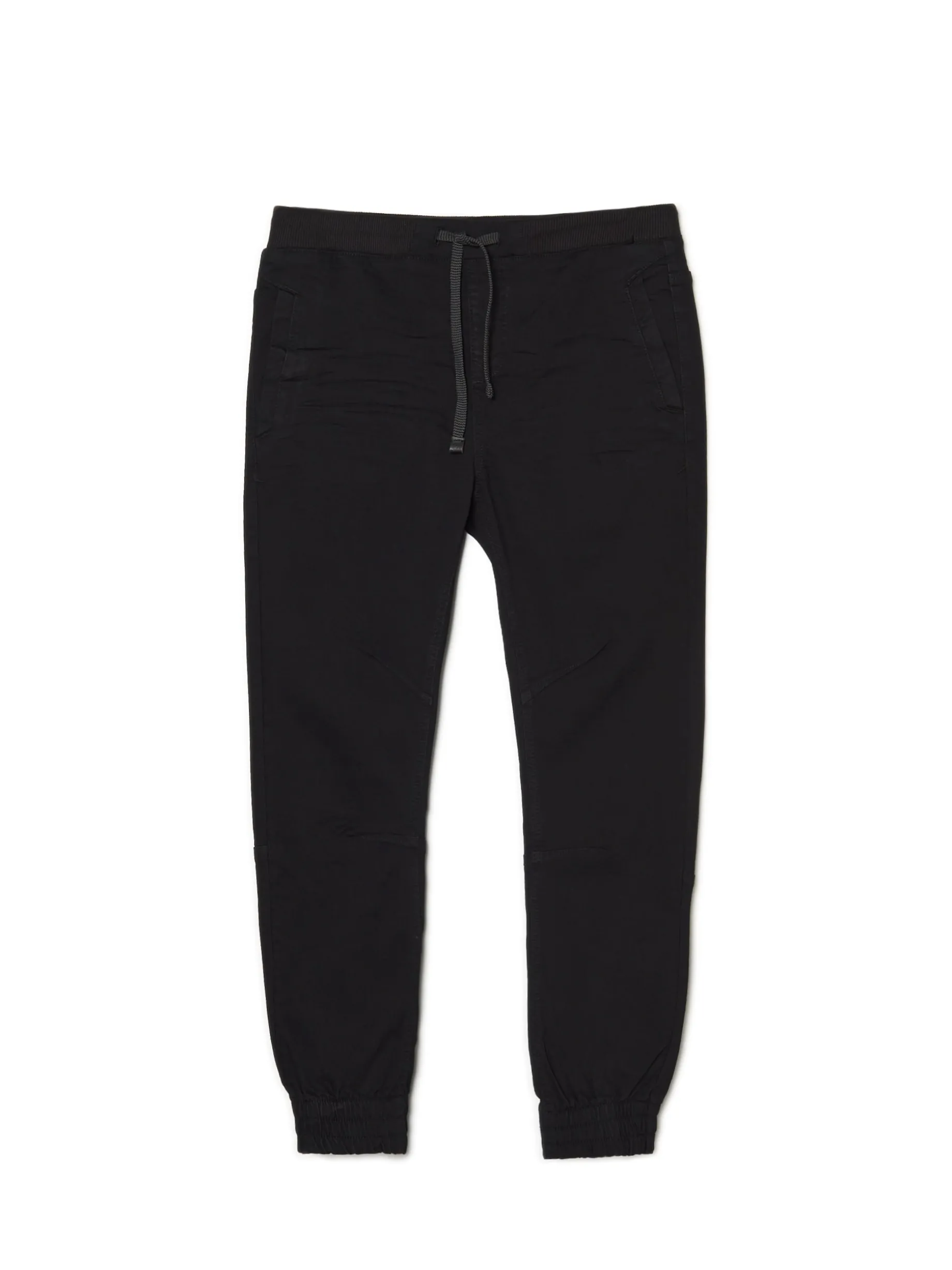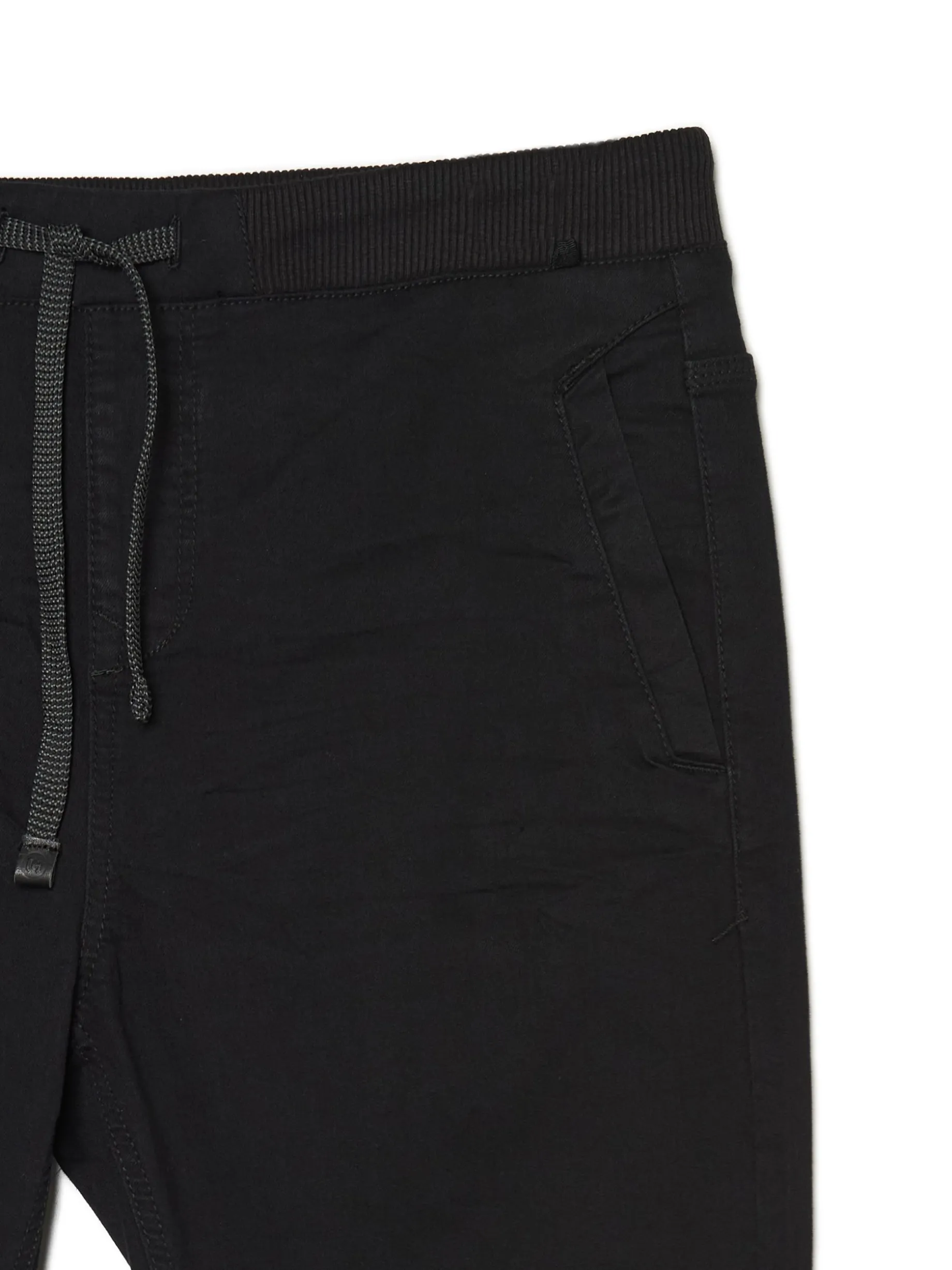 Męskie czarne spodnie jeansowe typu jogger chino, uszyte z dzianiny zawierającej bawełnę. regularny stan, w pasie elastyczna gumka i sznurek do regulacji nogawka zakończona ściągaczem z wszytą elastyczną gumką cztery kieszenie