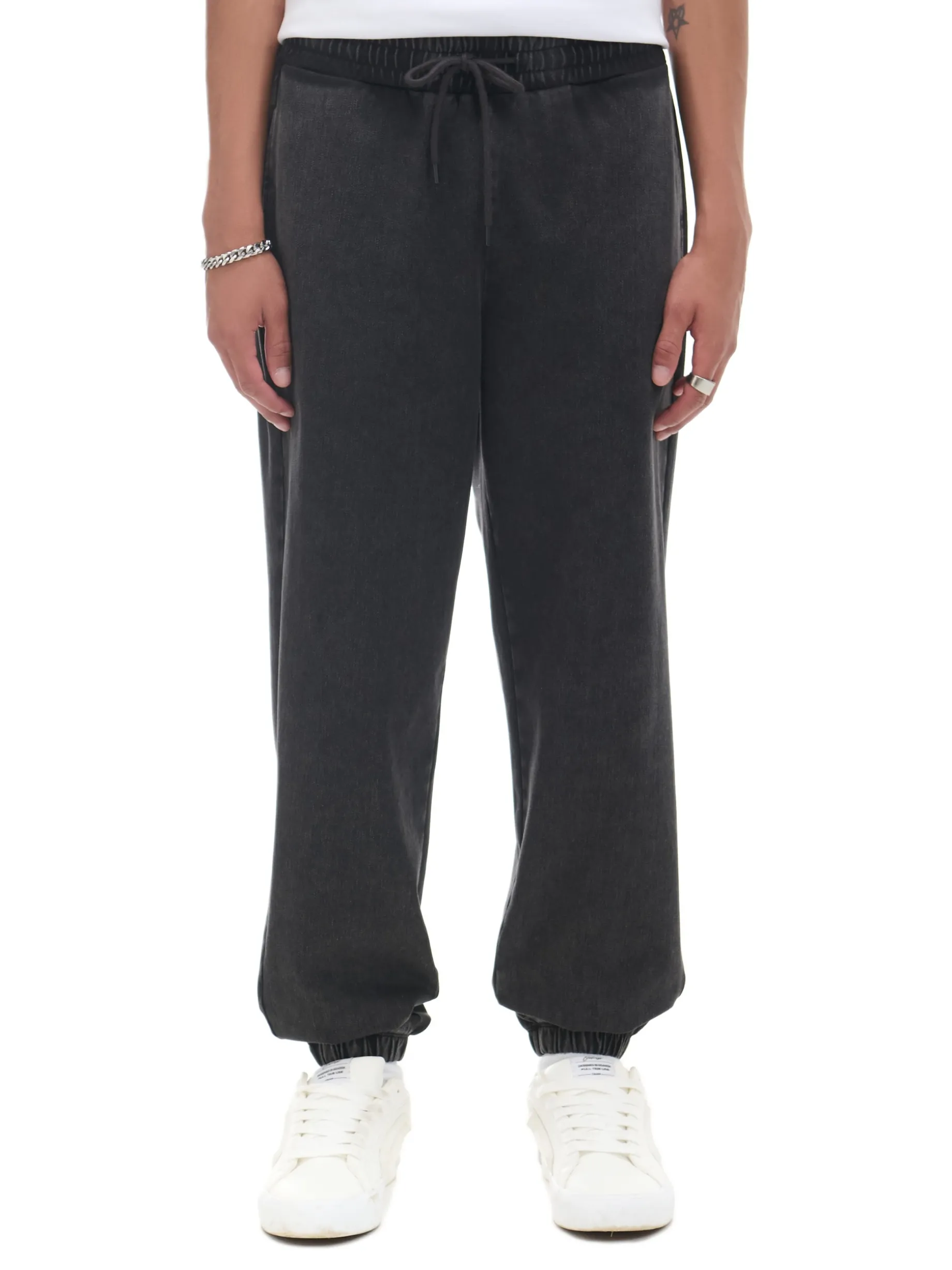 Męskie spodnie typu joggery, uszyte z denimu z lekkim efektem sprania. Świetnie fitują zarówno z dresową bluzą, jak i jeansową kurtką. Sprawdź! 100% bawełny regularny stan guma w pasie ze sznurkiem do regulacji długie nogawki wykończone ściągaczem otwarte kieszenie po bokach naszywana kieszeń z tyłu delikatny efekt sprania