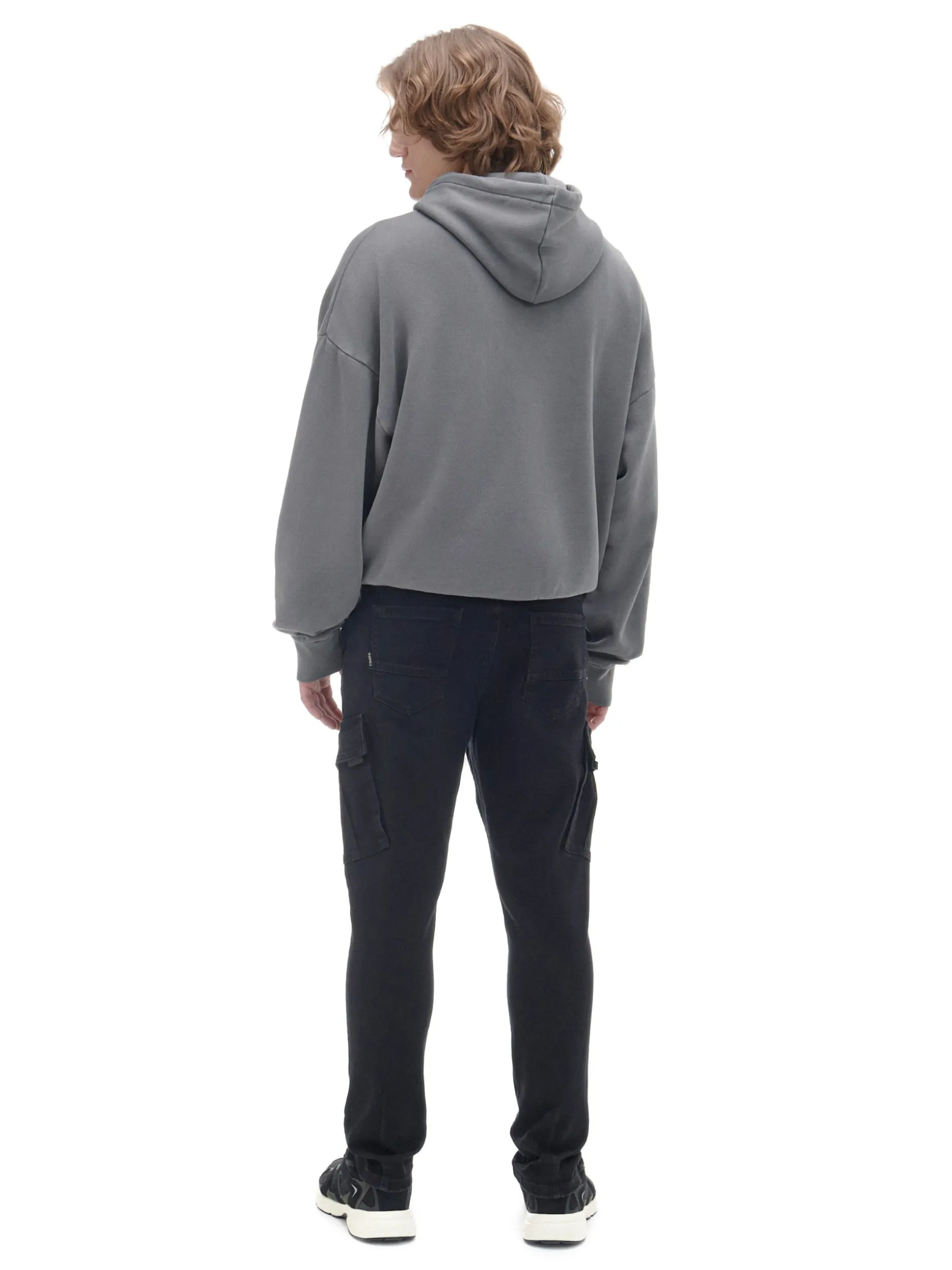 Męskie spodnie jeansowe o kroju typu carrot, uszyte z elastycznego denimu. regularny stan, zapięcie na zamek i guzik obniżony krok luźniejsze w udach, zwężane ku dołowi sześć kieszeni, w tym dwie cargo, zapinane na rzep ukośne przeszycia na kolanach szlufki na pasek Wzrost modela: 184 cm