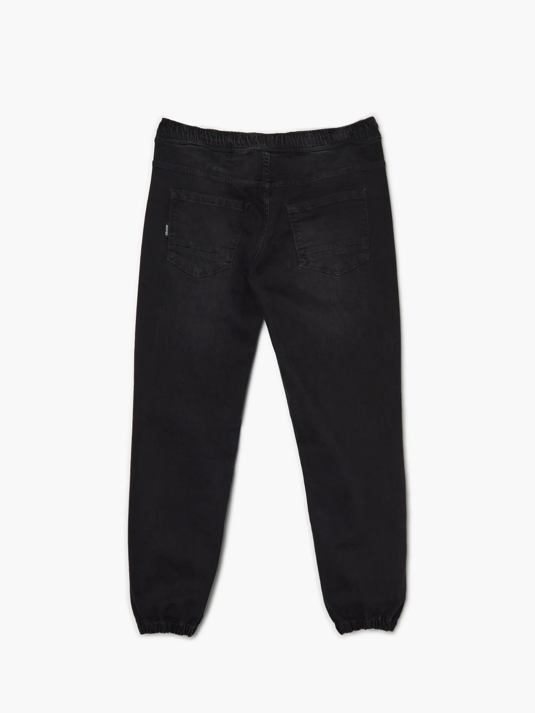 Męskie spodnie jeansowe, uszyte z tkaniny o bardzo wysokiej zawartości bawełny z niewielkim dodatkiem włókien elastycznych. regularny stan w pasie gumka oraz sznurek do regulacji długa nogawka, zakończona ściągaczem cztery kieszenie