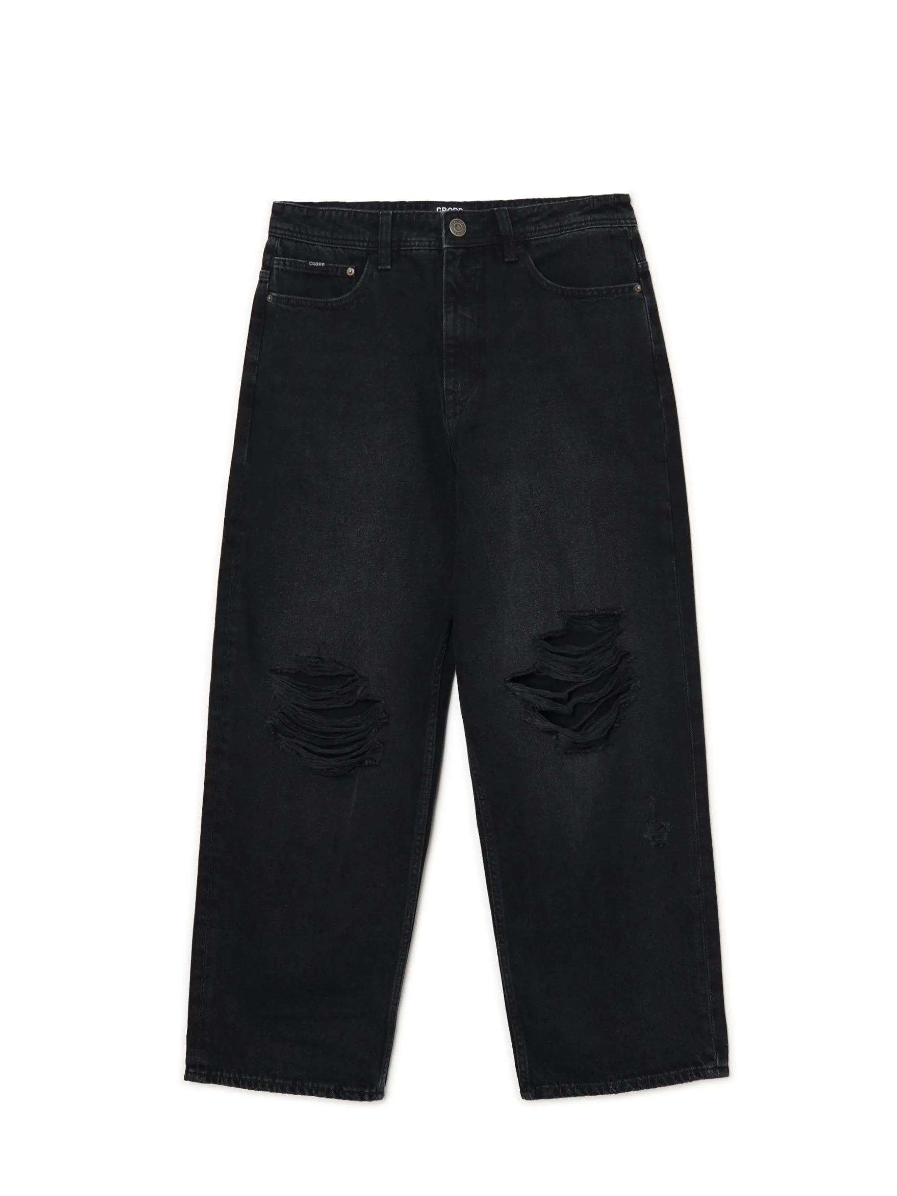Spodnie męskie uszyte z denimowej tkaniny w kolorze czarnym z efektem sprania. Ten casual z ozdobnymi postrzępieniami będzie świetnym dodatkiem do Twoich stylizacji. 100% bawełny obszerny krój super baggy zapięcie na zamek i guzik długie, bardzo szerokie nogawki pięć kieszeni szlufki na pasek ozdobne postrzępienia efekt sprania na całości