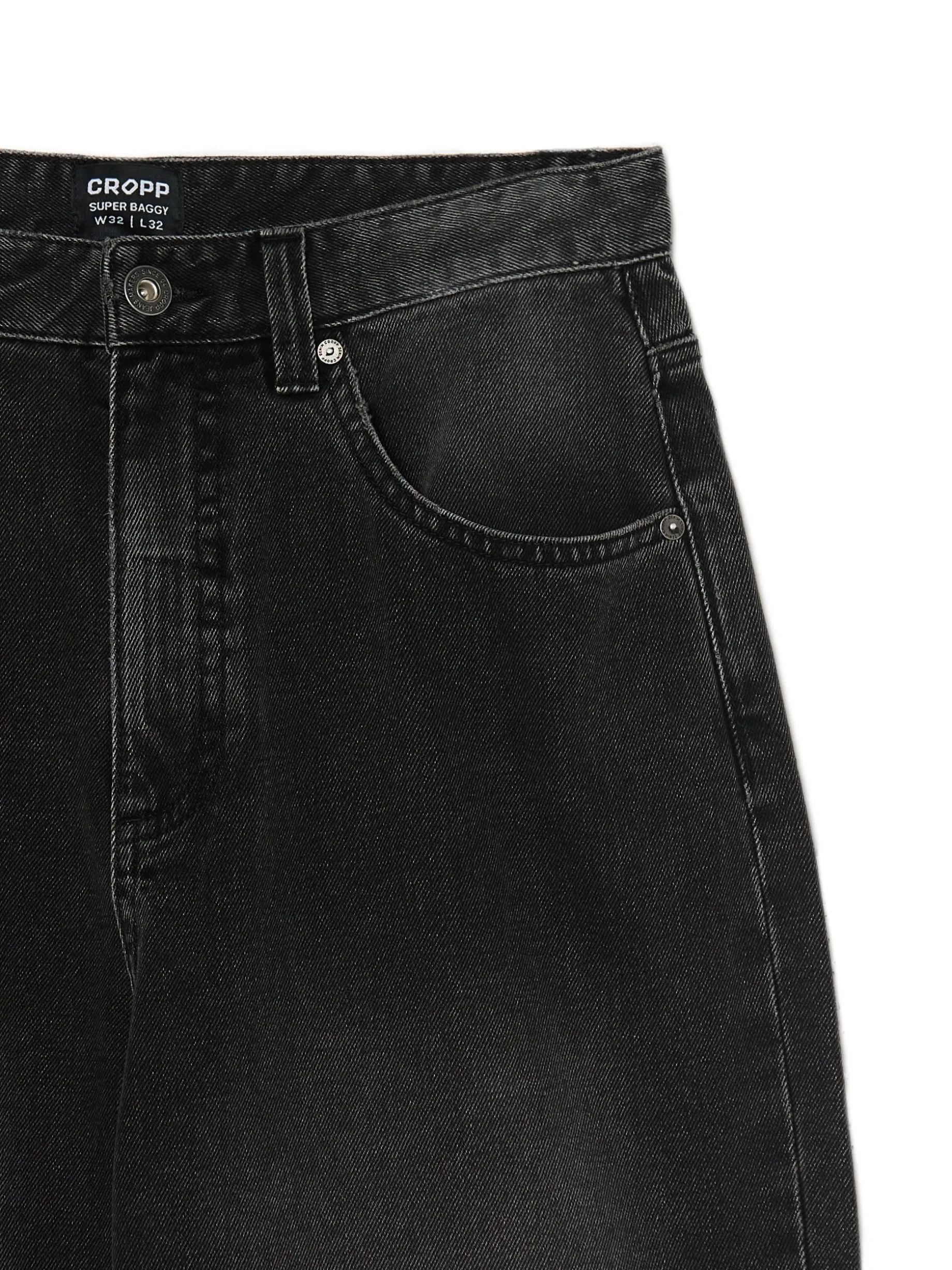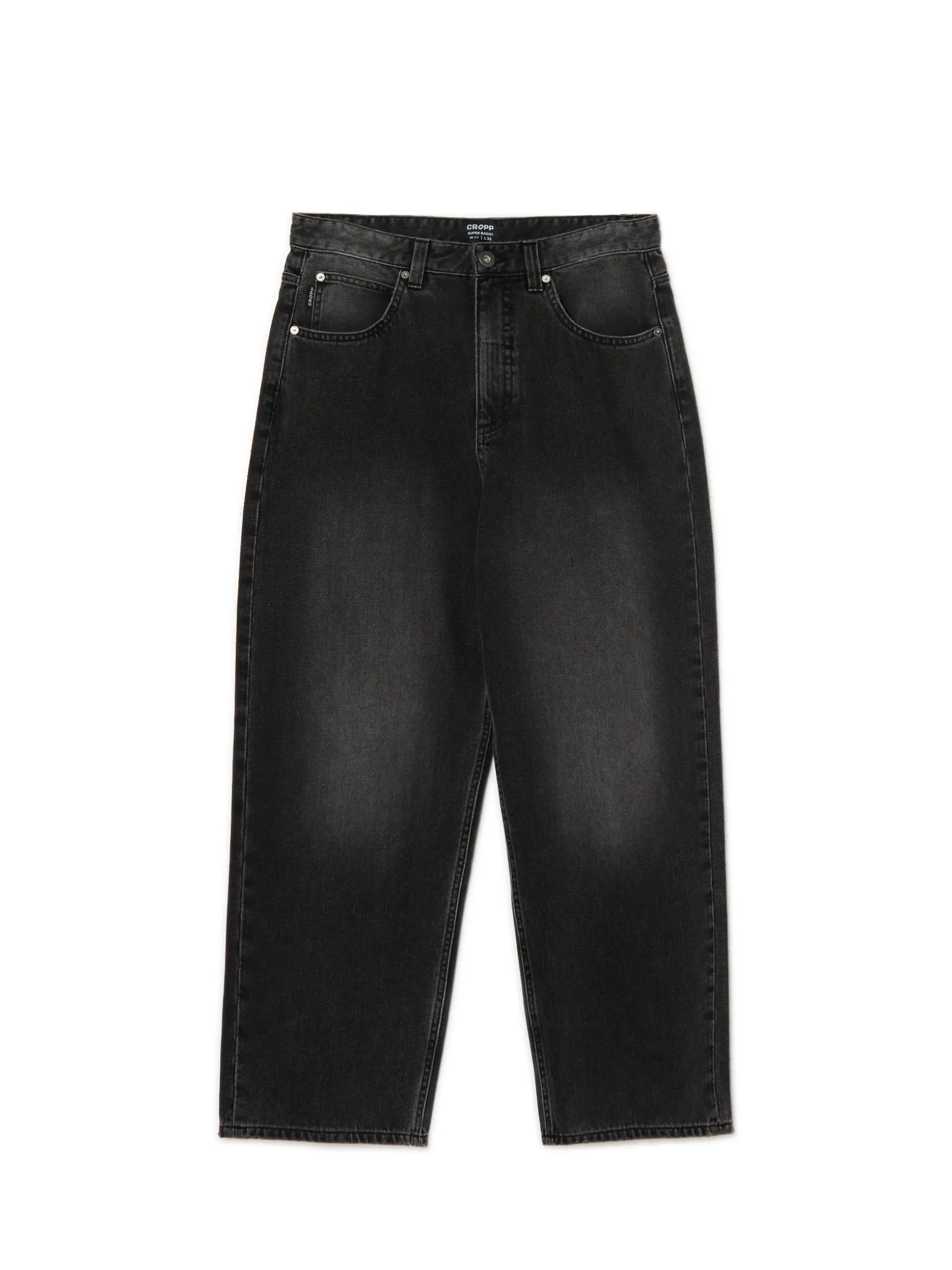 Denimowe męskie spodnie typu super baggy, uszyte z bawełnianej tkaniny w czarnym kolorze z efektem sprania. Bardzo luźny krój zapewnia niesamowitą wygodę i swobodę ruchów. 100% bawełny obszerny krój super baggy zapięcie na suwak i guzik dwie kieszenie boczne i dwie naszyte tylne jedna mała kieszeń na drobniaki szlufki na pasek efekt sprania na całości