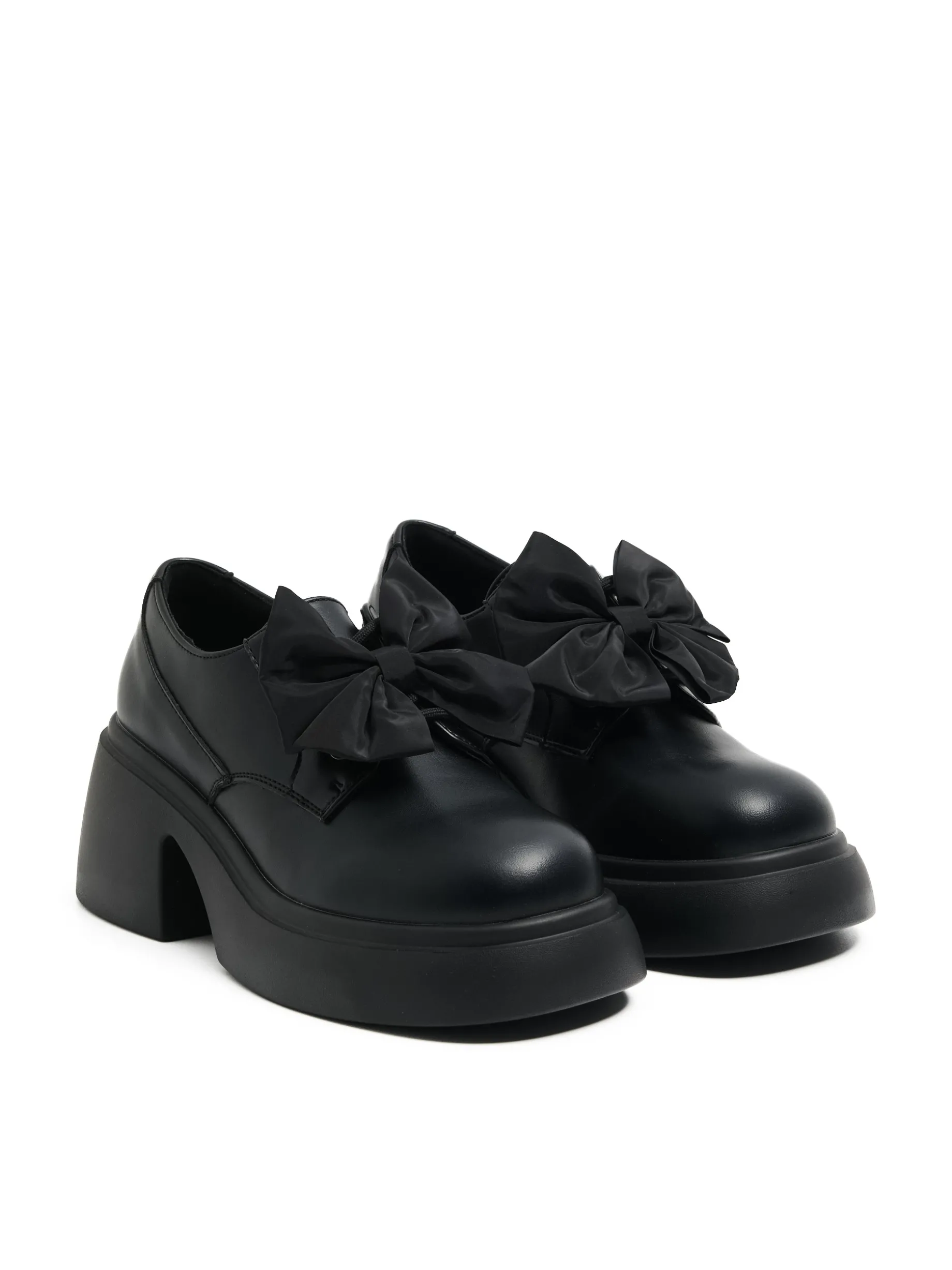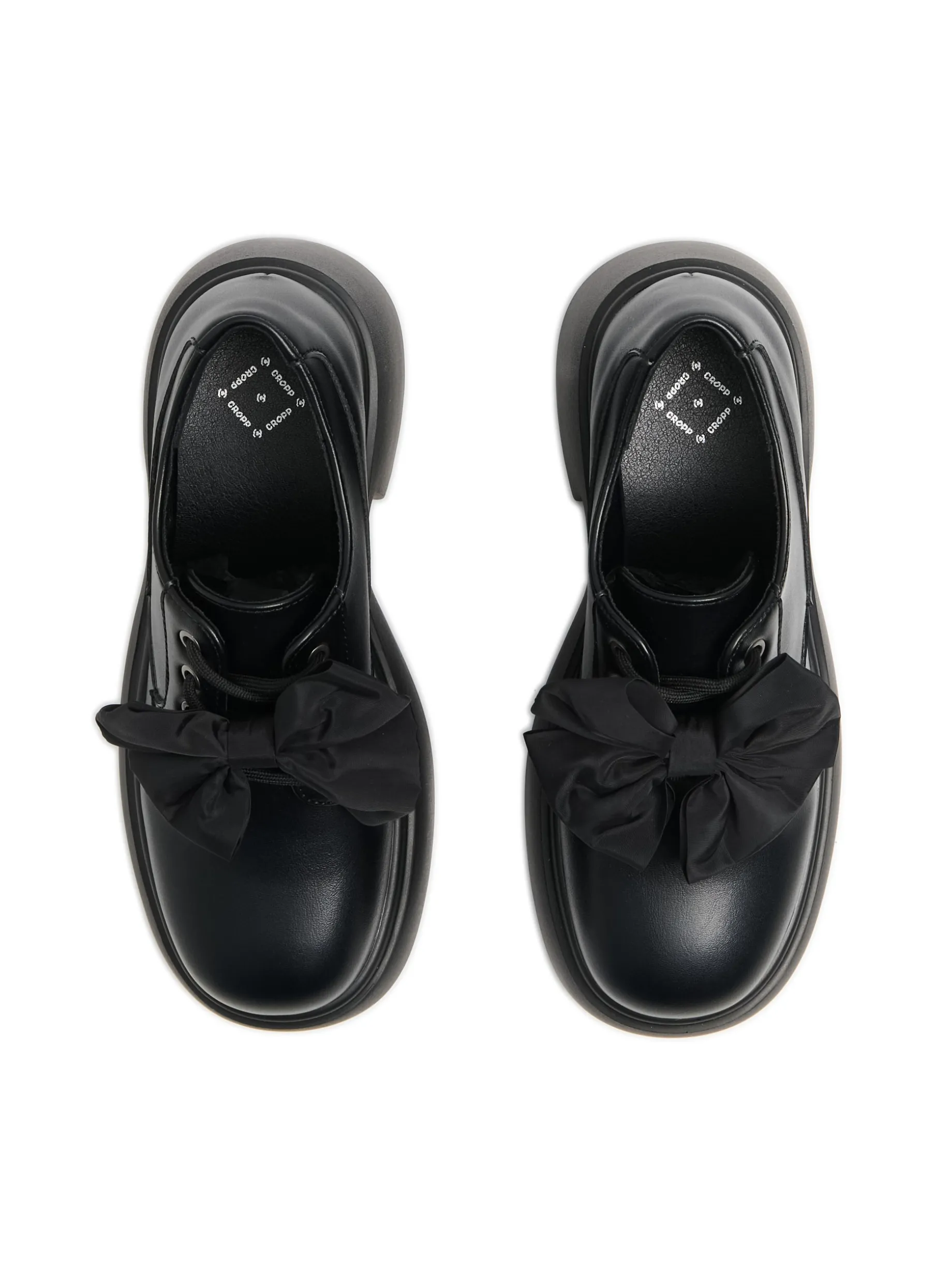 Czarne damskie półbuty typu derby na gładkiej, solidnej platformie z szerokim obcasem. Sztosowe w tym modelu są urocze kokardy na cholewce. Klasyk, który uzupełni Twoją stylizację! cholewka z imitacji skóry gruba, solidna podeszwa obcas w formie słupka wiązane na czarne sznurowadła ozdobne naszywki w formie kokardy