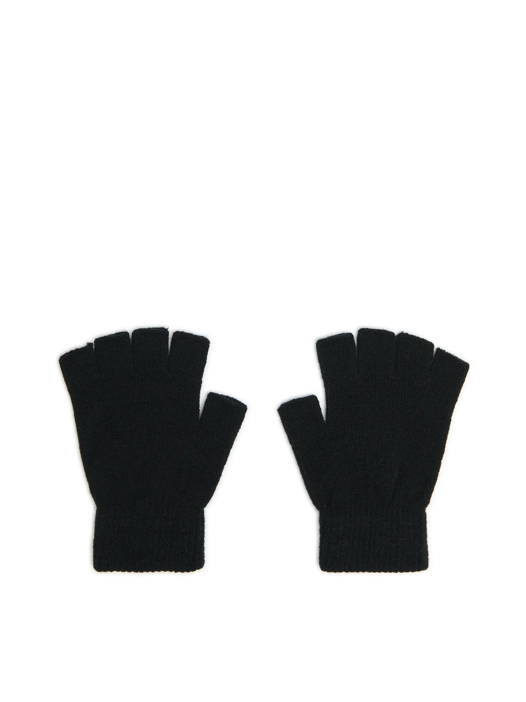 Damskie rękawiczki bez palców typu mitenki, uszyte z czarnej dzianiny. Ściągacze z prążkowanego materiału dopasowują i utrzymują item na dłoniach. Idealne na jesienny sezon!