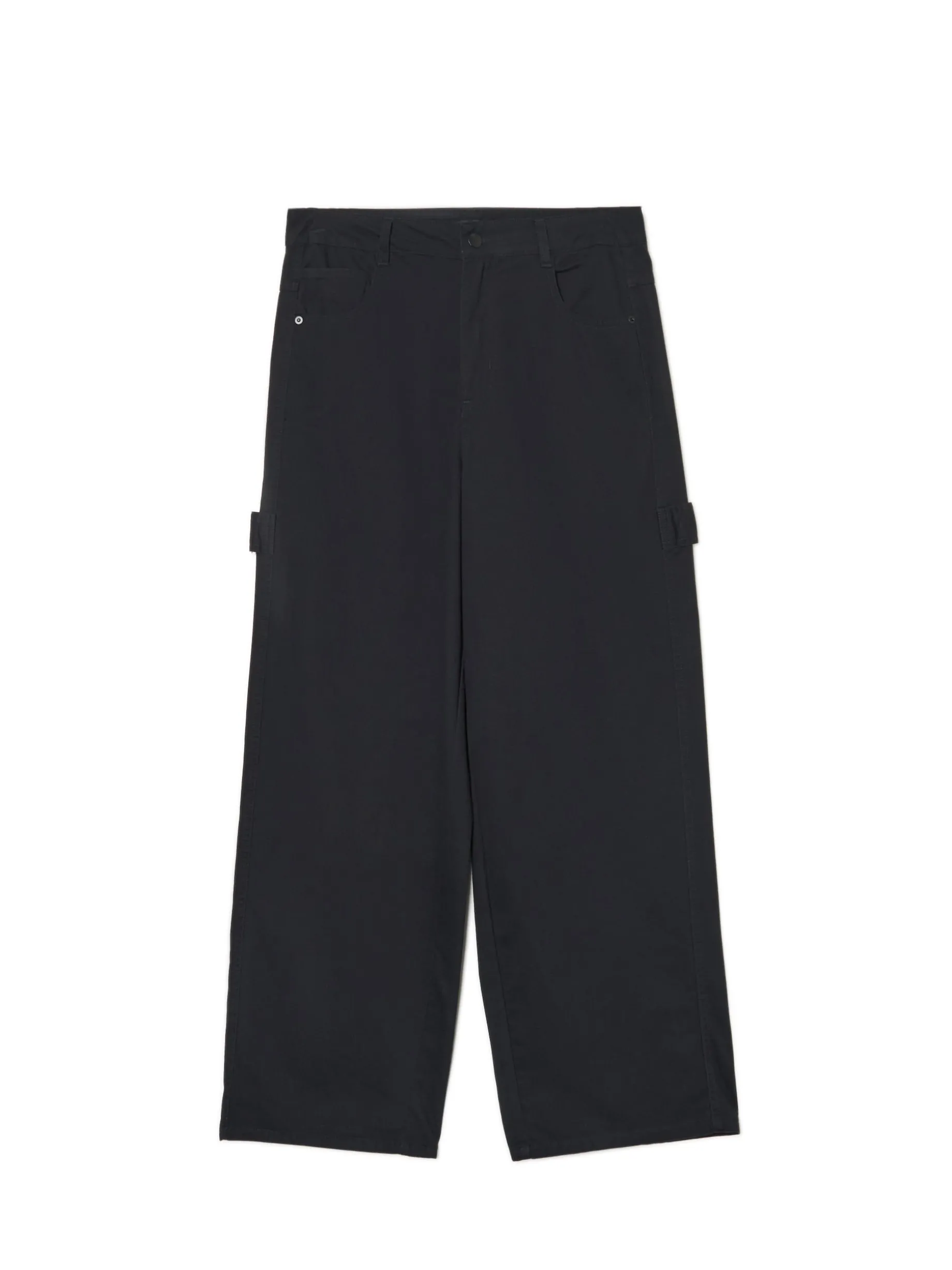 Spodnie na każdą okazję? Check! Damskie spodnie typu baggy, uszyte z trwałego, bawełnianego diagonalu. Dla kobiety z charakterem, która ceni prostotę i praktyczne rozwiązania w modzie. 100% bawełny tkanina o diagonalnym splocie obszerny krój baggy zapięcie na zamek i guzik długie, szerokie nogawki pięć kieszeni hammer loop na obu nogawkach szlufki na pasek