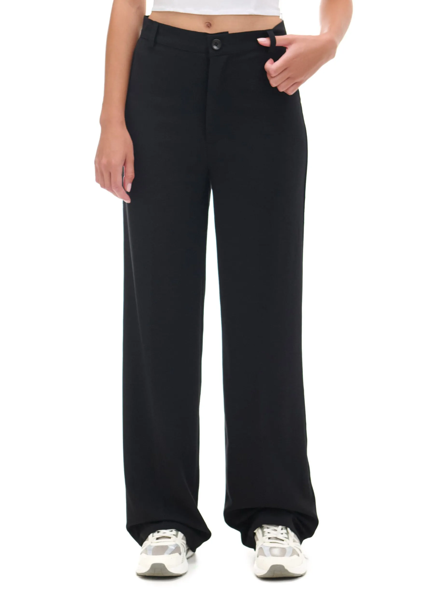 Damskie spodnie typu tailoring, uszyte z mieszanki tkanin z wiskozą i elastycznymi włóknami. Idealne do pracy, szkoły, czy na uczelnię. lekki materiał z wiskozą spodnie o fasonie tailoring wysoki stan zapięcie na zamek i guzik długie, proste nogawki imitacja kieszeni z tyłu Wzrost modelki: 177 cm