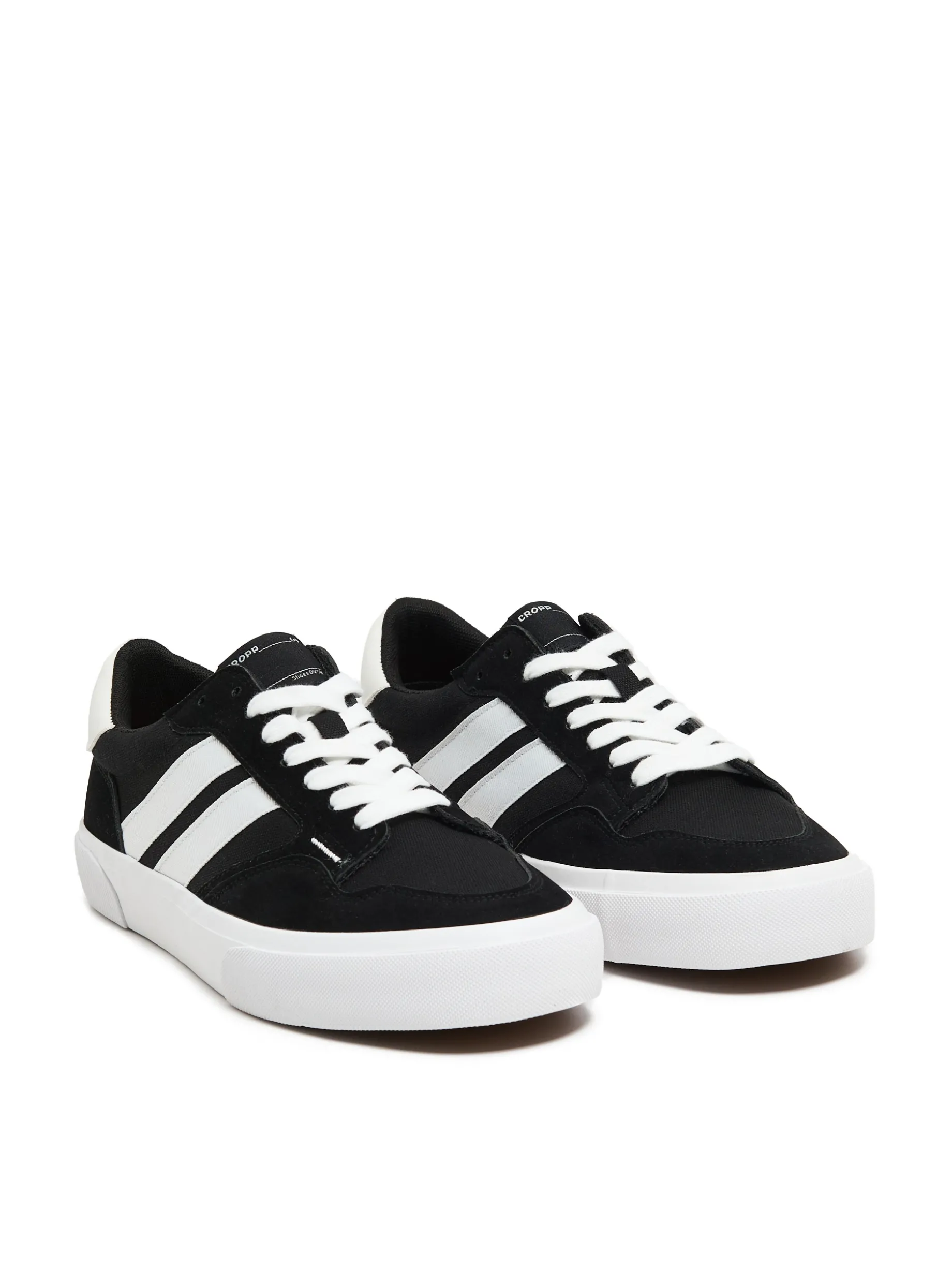 Czarne męskie buty sportowe uszyte z mieszanki dzianin z dodatkiem bawełny. Dwukolorowa cholewka z tkaninowymi paskami. Sprawdzają się idealnie podczas codziennych aktywności. sznurowane trampki w sportowym stylu cholewka wykonana z dzianinowej mieszanki z bawełną solidna podeszwa z dodatkiem gumy naturalnej wiązane na płaskie, białe sznurówki ozdobne przeszycia