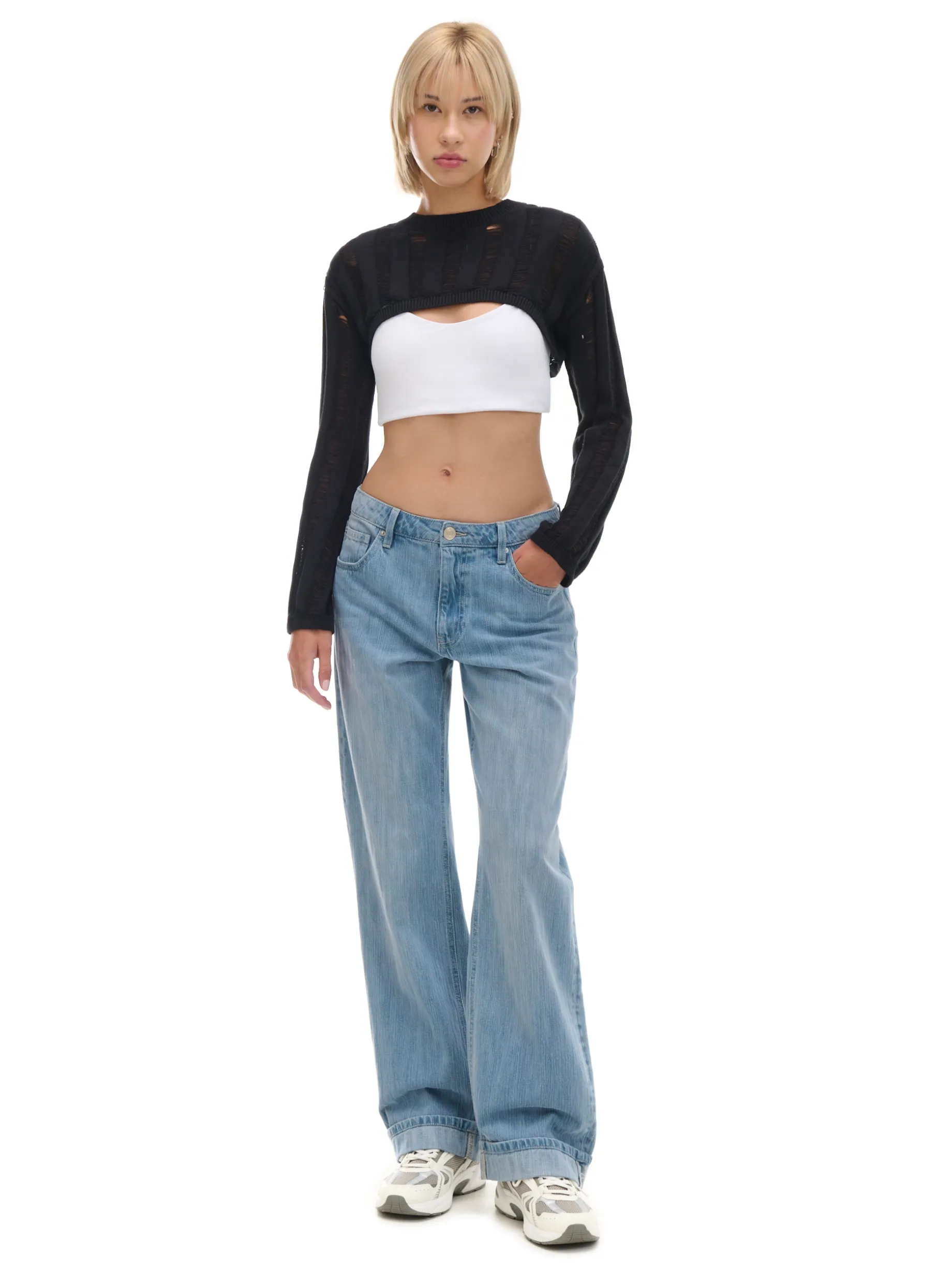 Damski czarny sweter o krótszym kroju uszyty z bawełny. Delikatne prześwity stanowią ozdobę tego modelu i idealnie fitują zarówno z topami, jak i sukienkami. 100% bawełny krótki krój długie, swobodne rękawy półokrągły dekolt wykończony ściągaczem Wzrost modelki: 177 cm
